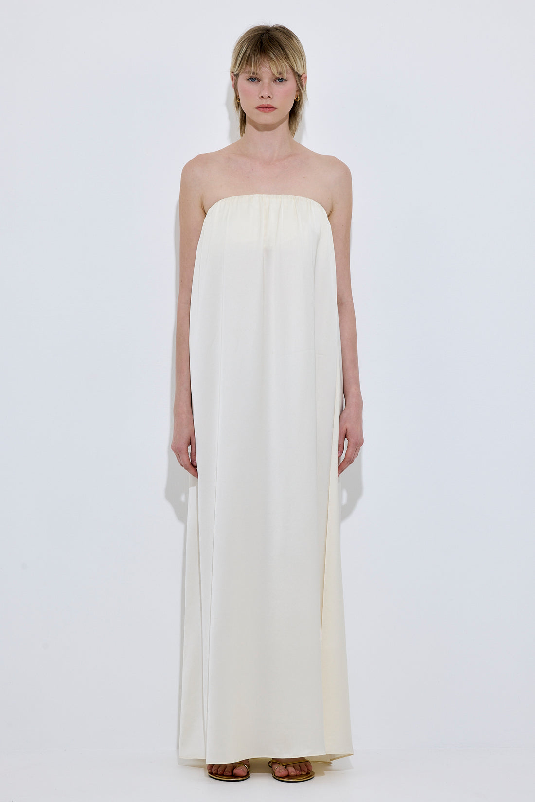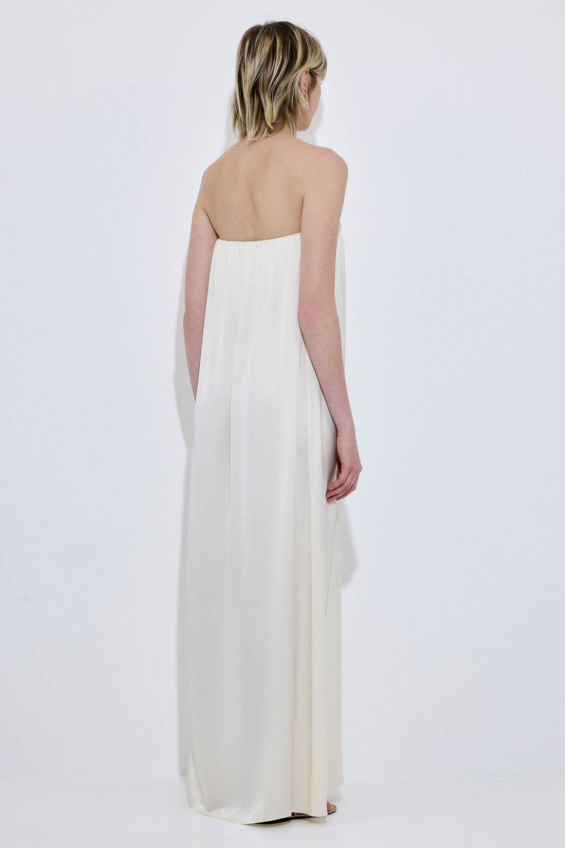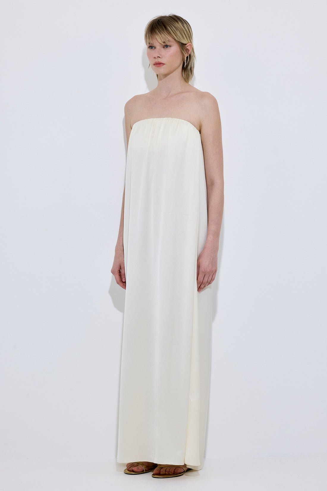 Our new strapless gathered maxi dress is an elevated essential for warm-weather evenings. Full-length with a flattering wide silhouette. Luxurious lightweight lustrous satin fabric. Doesn't crease. Double lining at the chest area. Straight strapless neckline with gentle gathered detailing. Effortless drape. Clean finish with no visible closures for a seamless look. Pair it with our matching scrunchie for the most iconic summer look.