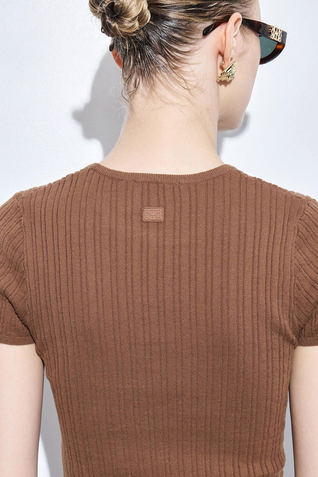 Our ribbed crew neck T is a true summer wardrobe essential. Ribbed crewneck collar. Contrast ribbed finish. Featuring a tonal silicone logo patch detailing at the upper back. Style it with our linen maxi skirt, a pair of our beautiful sunnies and our cool scrunchie to seal this gorgeous look.