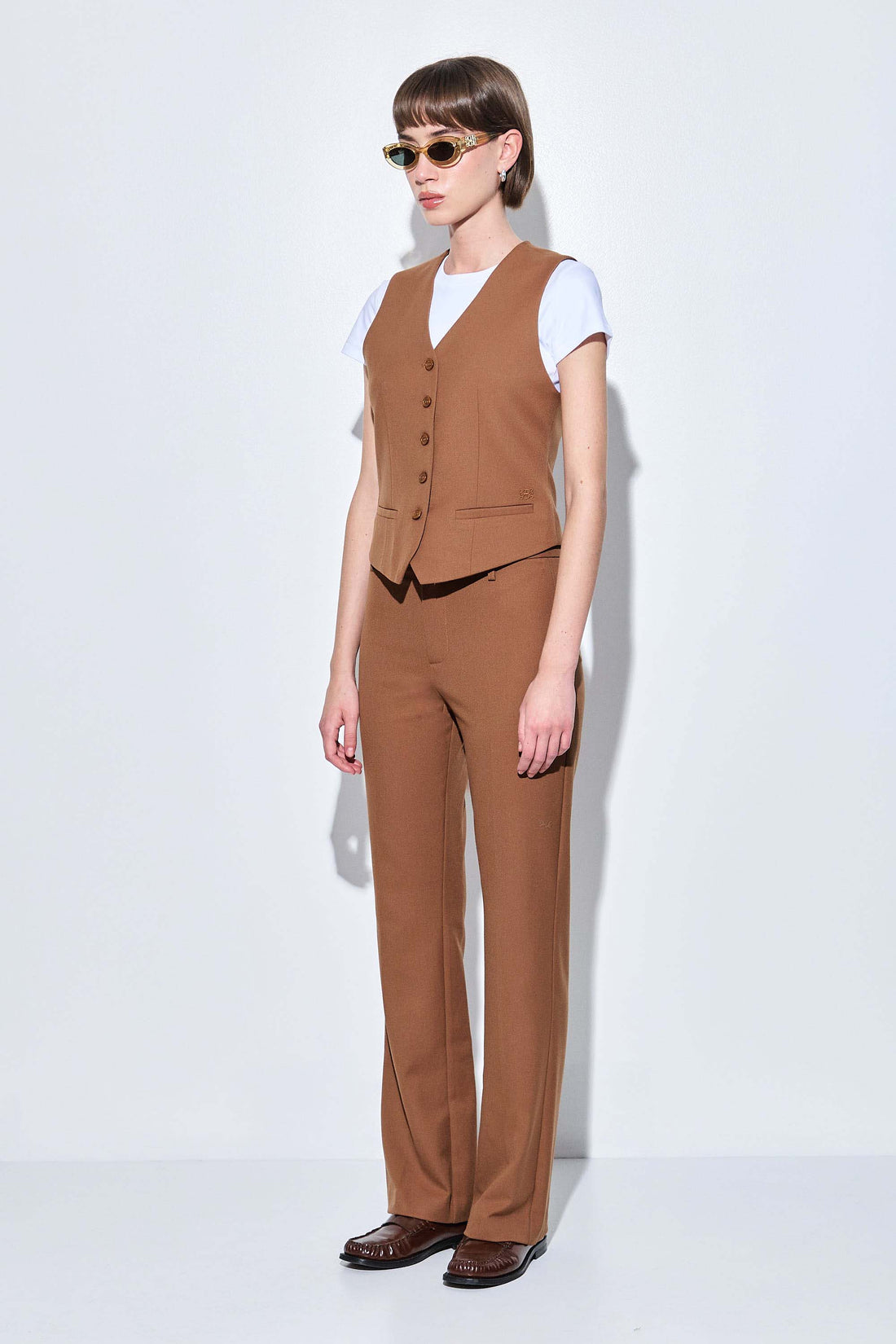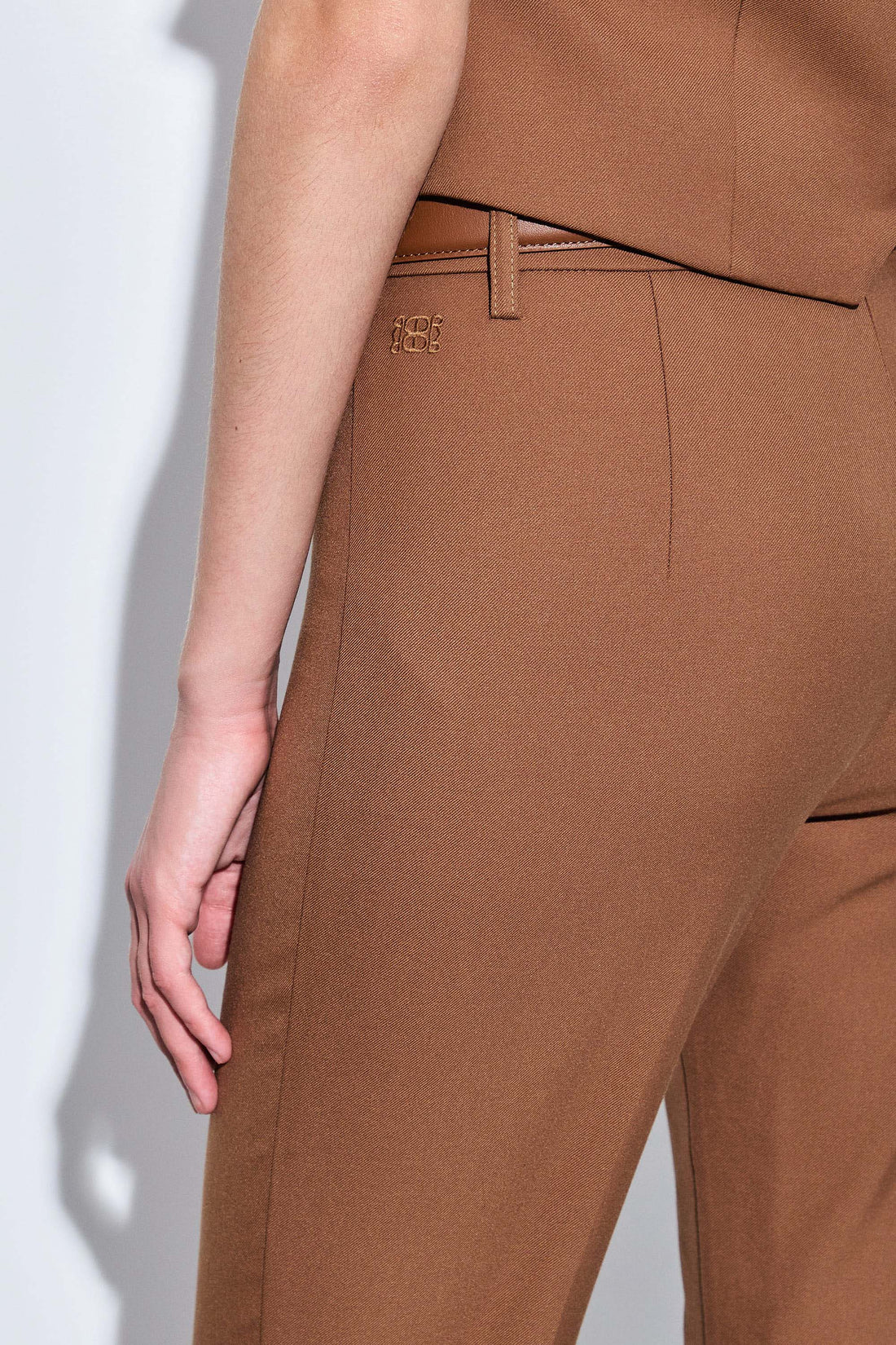 Our new bootcut daddy pants are your new go-to bottoms in a new luxurious tailored fabric. Mid waisted. Bootcut fitted silhouette. Front zipper and metal hook closure. Unlined. Belt loops. Full length. Tonal embroidered logo on the back. Style it with our tailored daddy vest and throw our tailored daddy blazer on top for a classy and chic look.