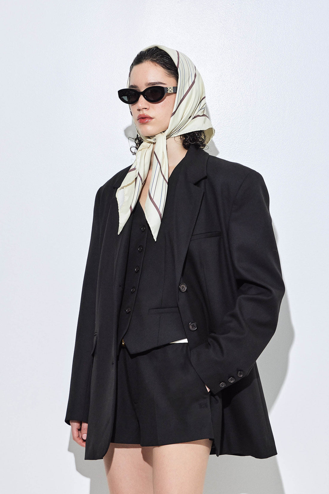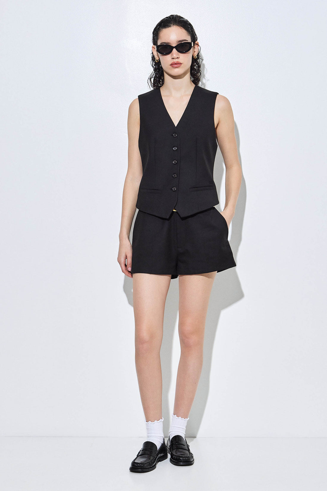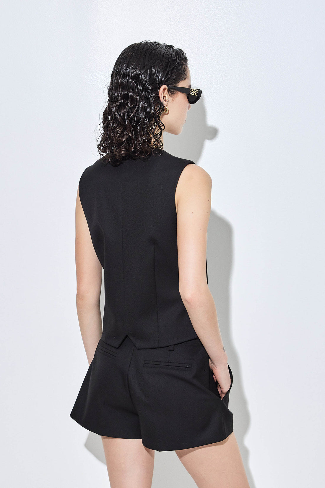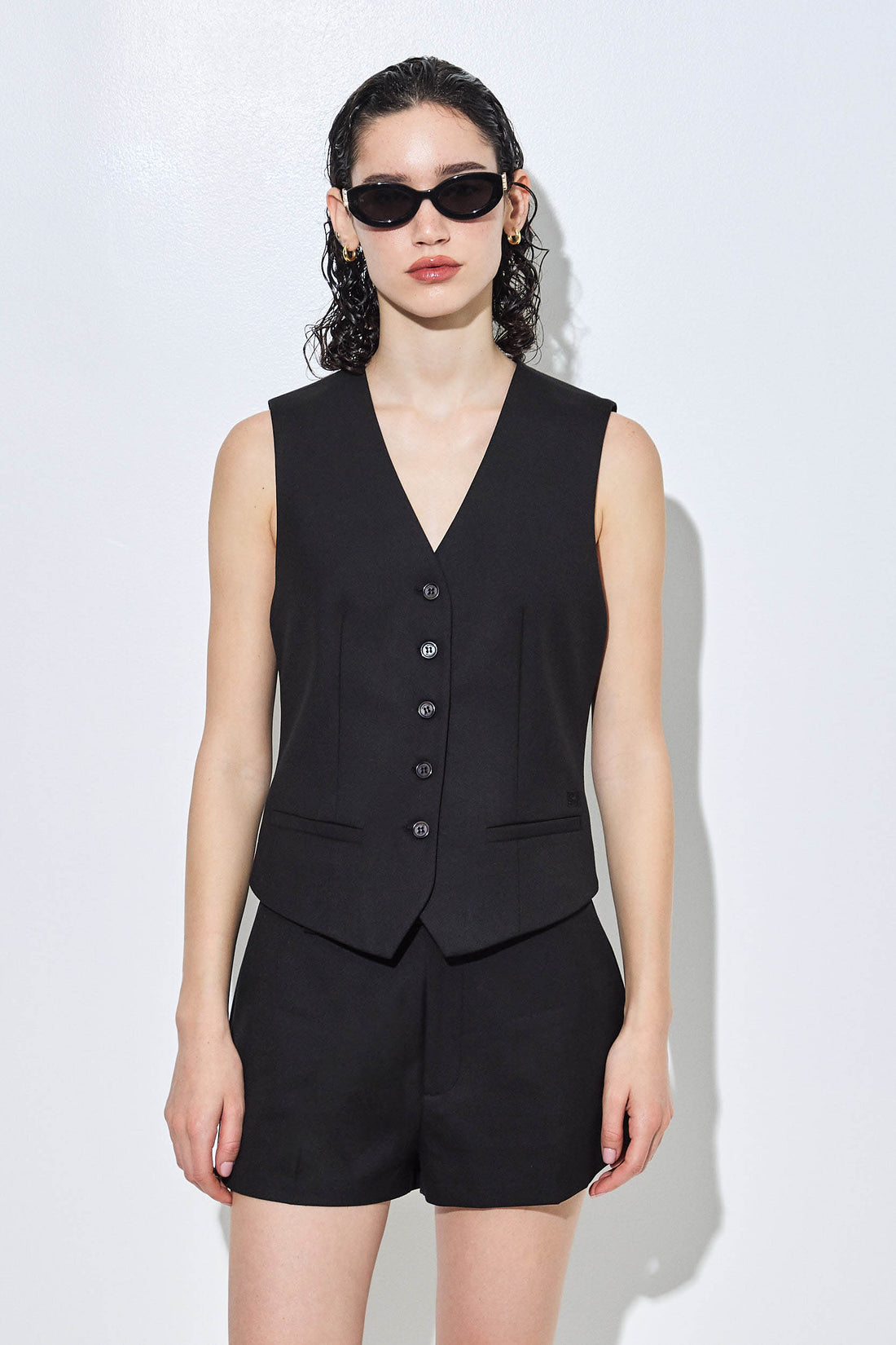 The chicest vest you'll own in a new luxurious tailored fabric. Fitted silhouette. Engraved logo frontal button closure. V neckline. Front faux welt pockets. Delicate tonal embroidered logo detailing on the front. Lined. Featuring dart detailing for a fitted silhouette. Style it with our tapered daddy pants, our classy monogram scarf and a pair of our beautiful oval sunglasses.