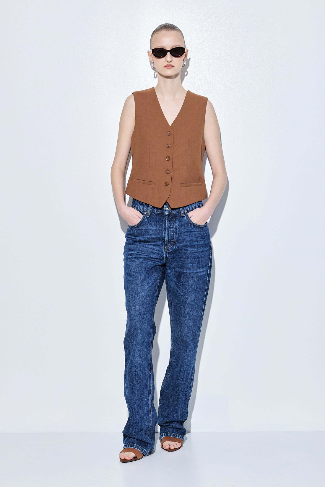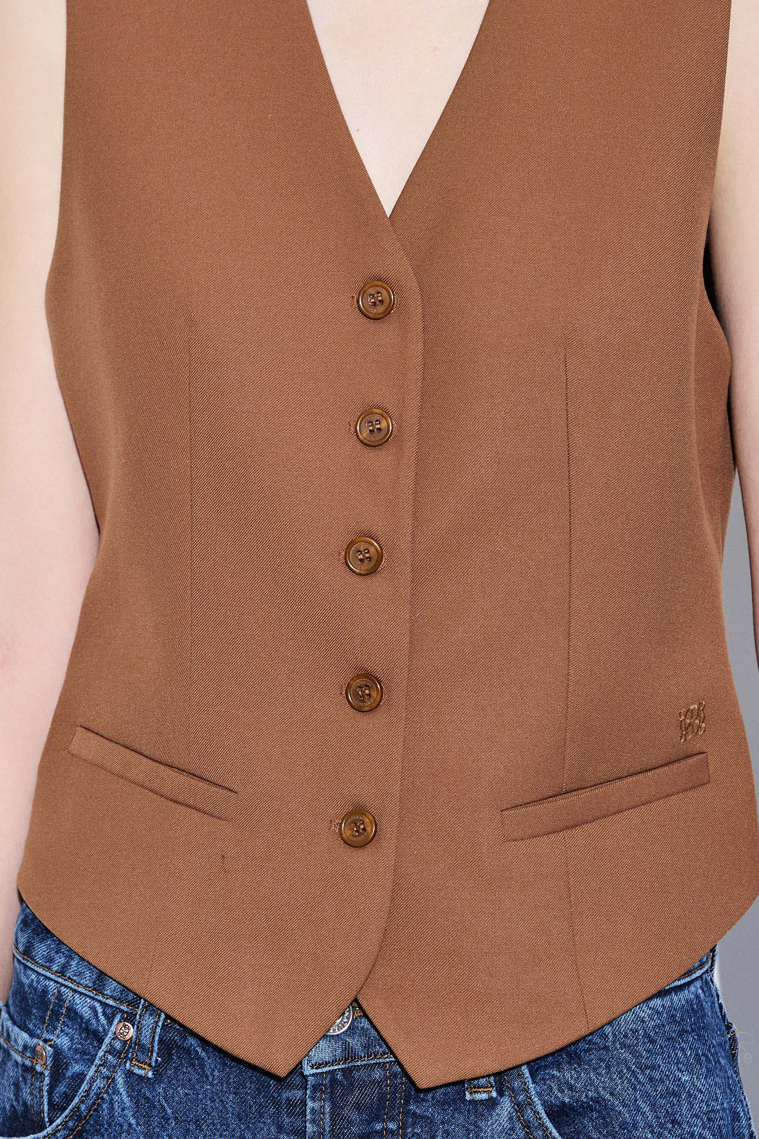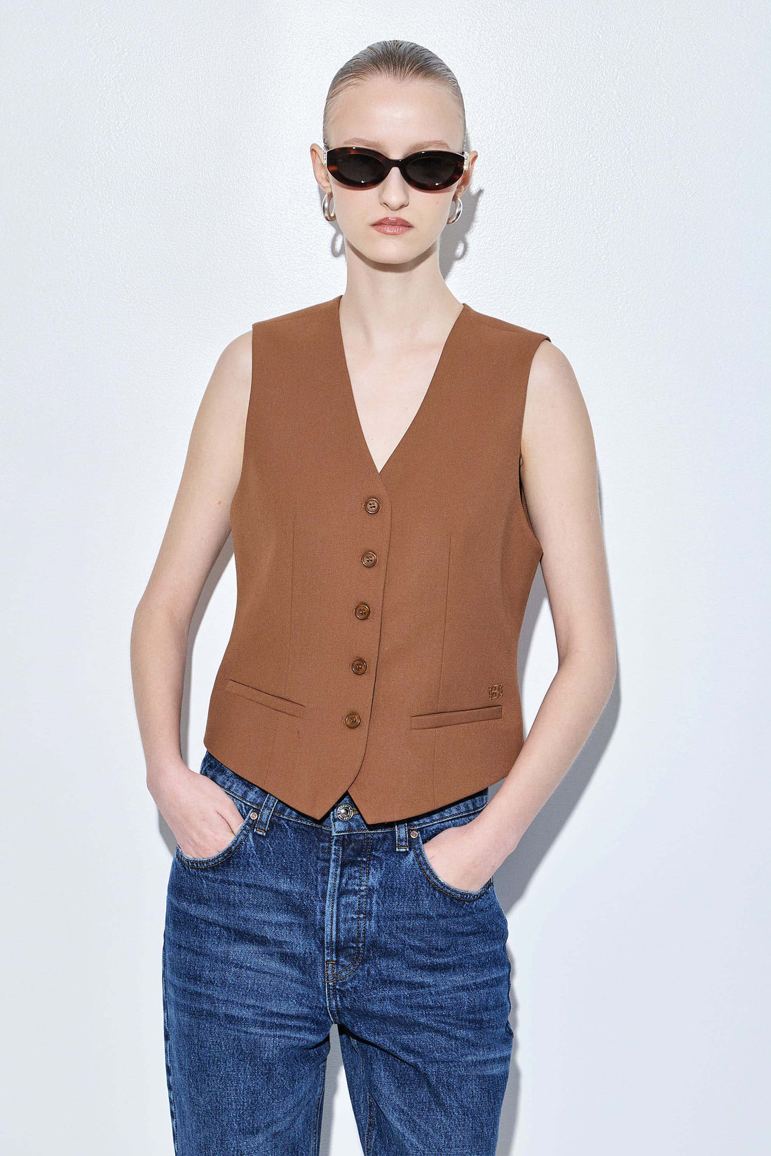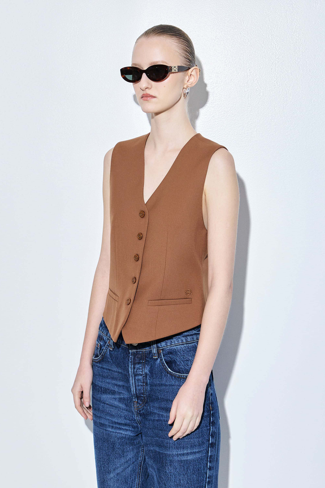 The chicest vest you'll own in a new luxurious tailored fabric. Fitted silhouette. Engraved logo frontal button closure. V neckline. Front faux welt pockets. Delicate tonal embroidered logo detailing on the front. Lined. Featuring dart detailing for a fitted silhouette. Style it with our tapered daddy pants, our classy monogram scarf and a pair of our beautiful oval sunglasses.