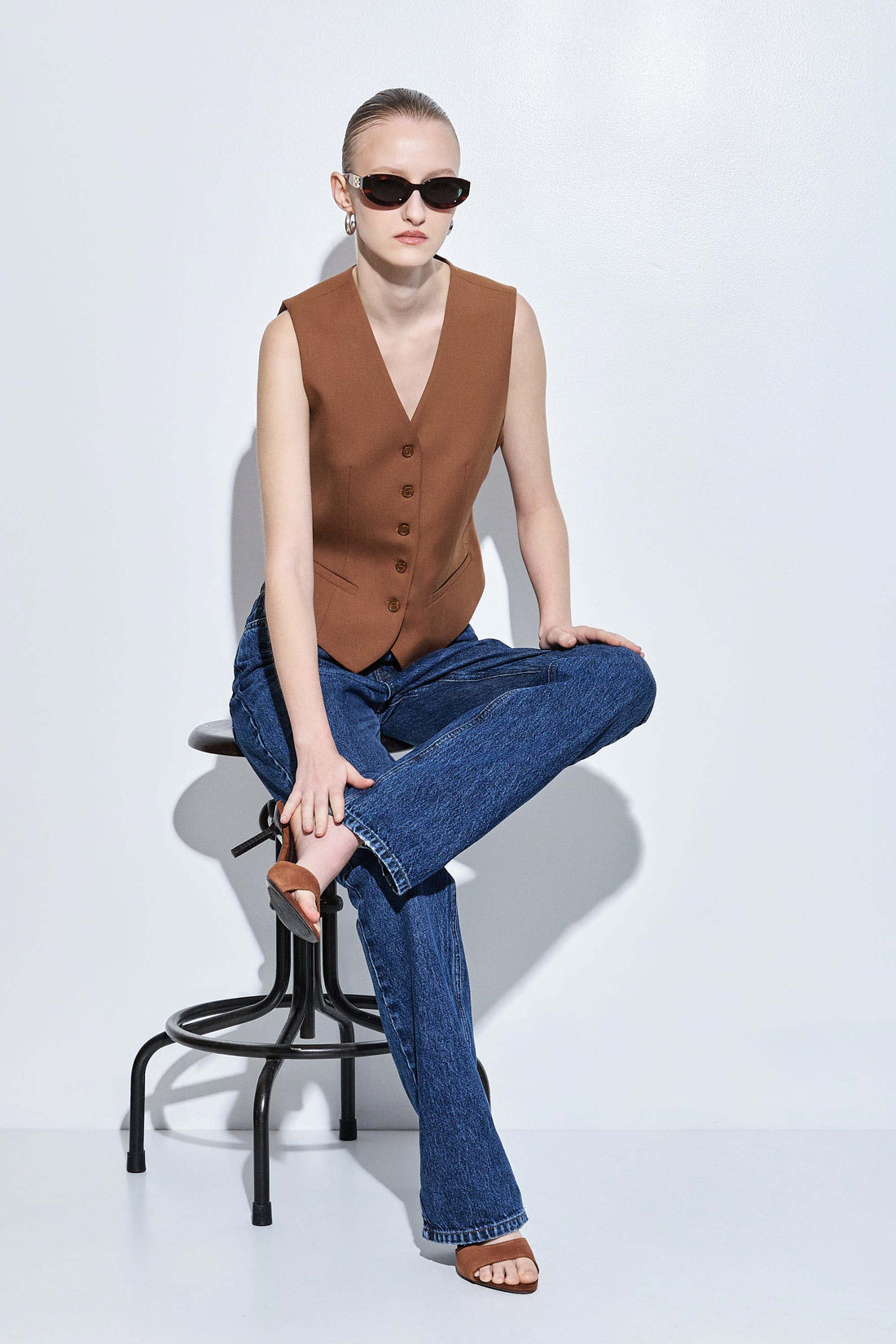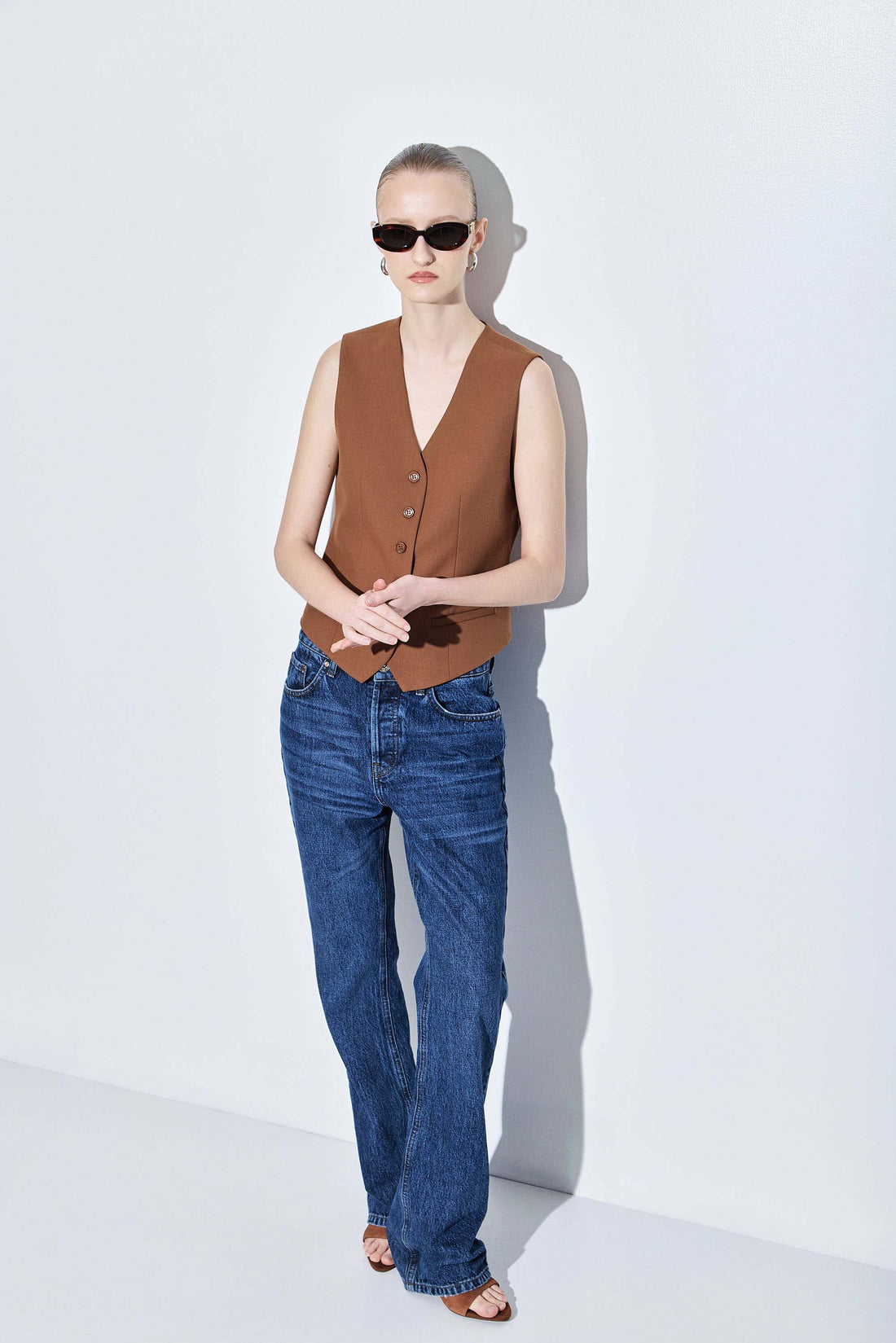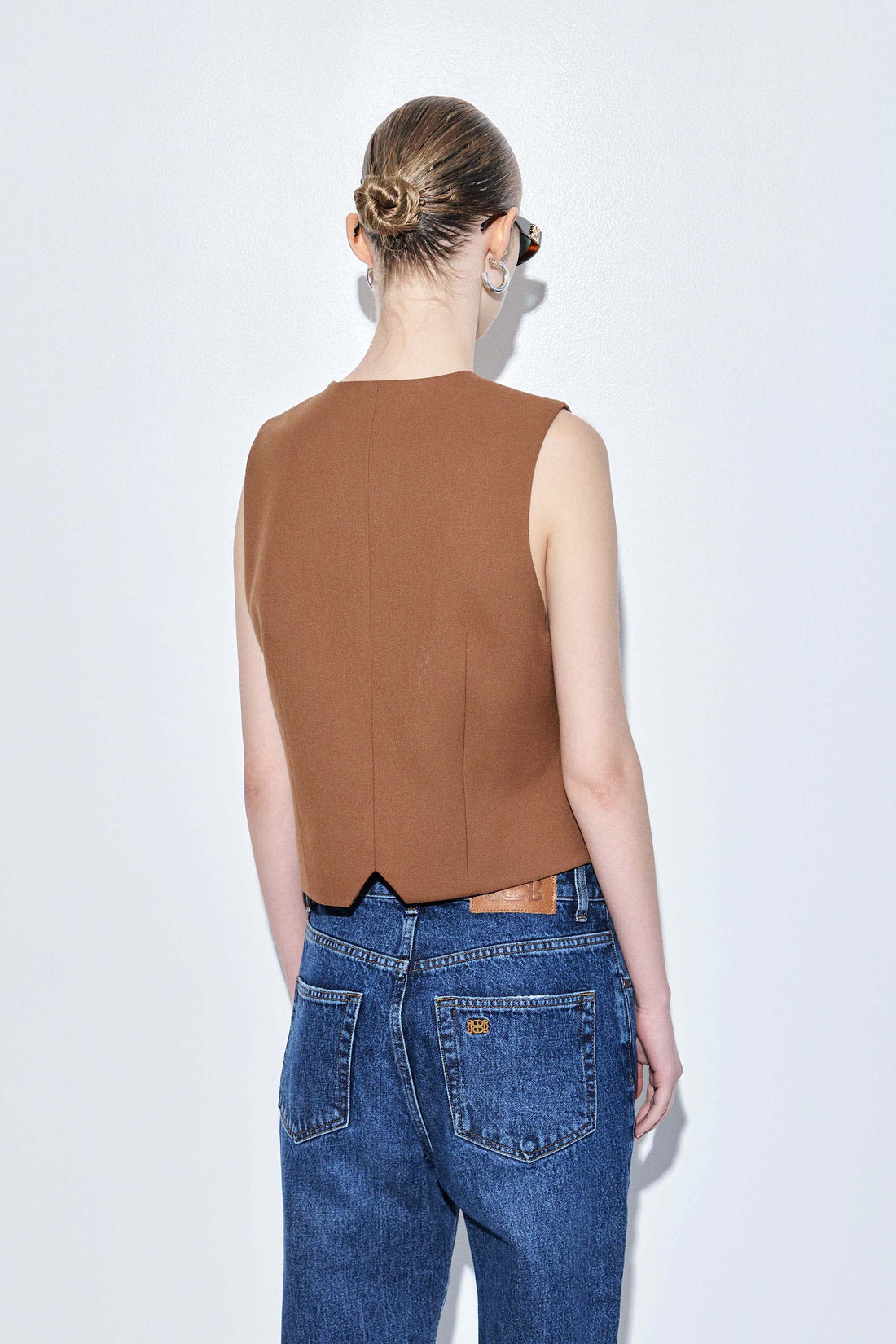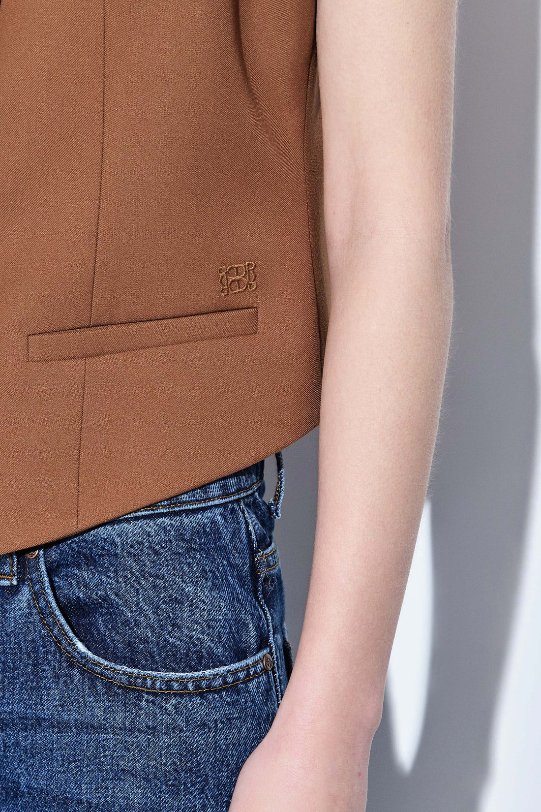 The chicest vest you'll own in a new luxurious tailored fabric. Fitted silhouette. Engraved logo frontal button closure. V neckline. Front faux welt pockets. Delicate tonal embroidered logo detailing on the front. Lined. Featuring dart detailing for a fitted silhouette. Style it with our tapered daddy pants, our classy monogram scarf and a pair of our beautiful oval sunglasses.