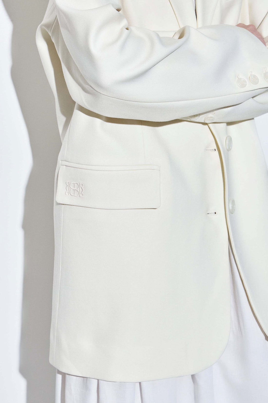 Our new tailored daddy blazer is a timeless piece this season in a new luxurious tailored fabric. Oversized fit. Features a lapel collar. Logo engraved button closure. Three front faux pockets. Back slit. Lined. Tonal logo embroidery on the side. Padded shoulders. Style it with our daddy bootcut pants, our lightweight turtleneck and our signature mini logo belt for a day to night classy look.