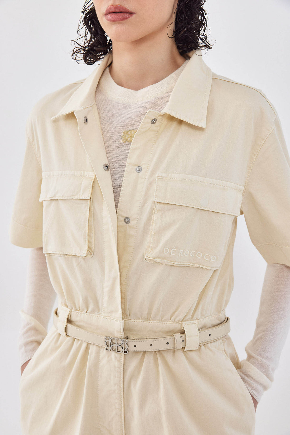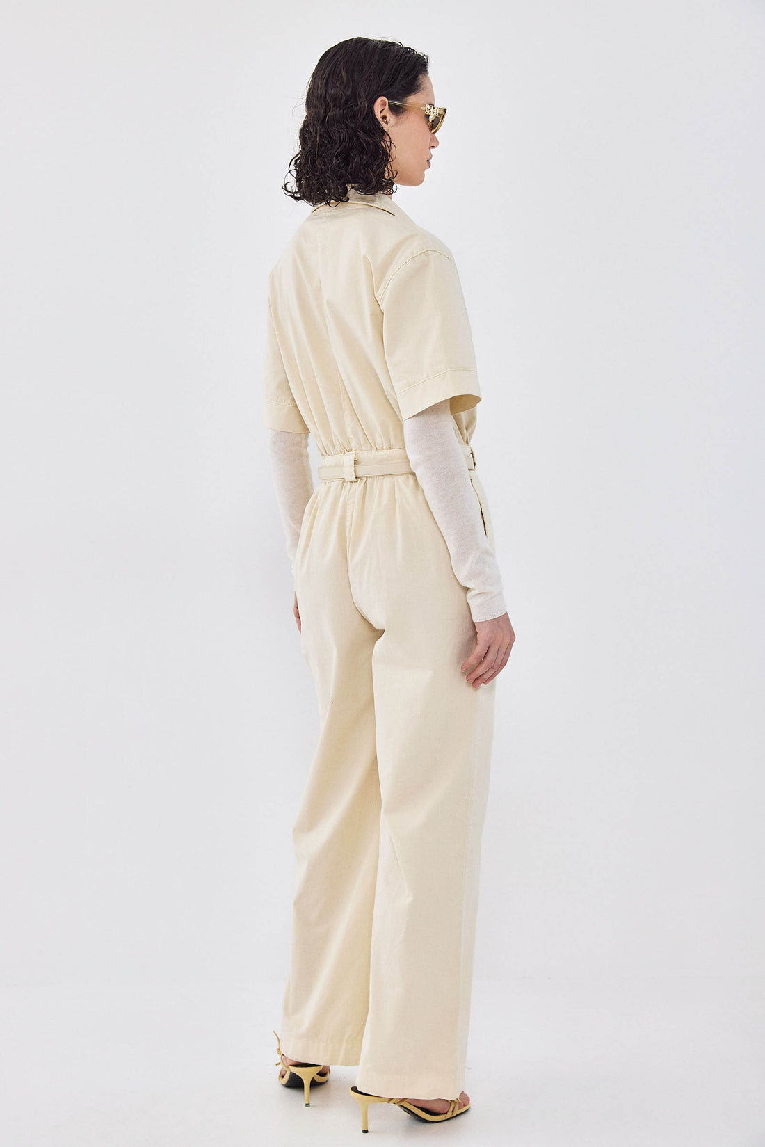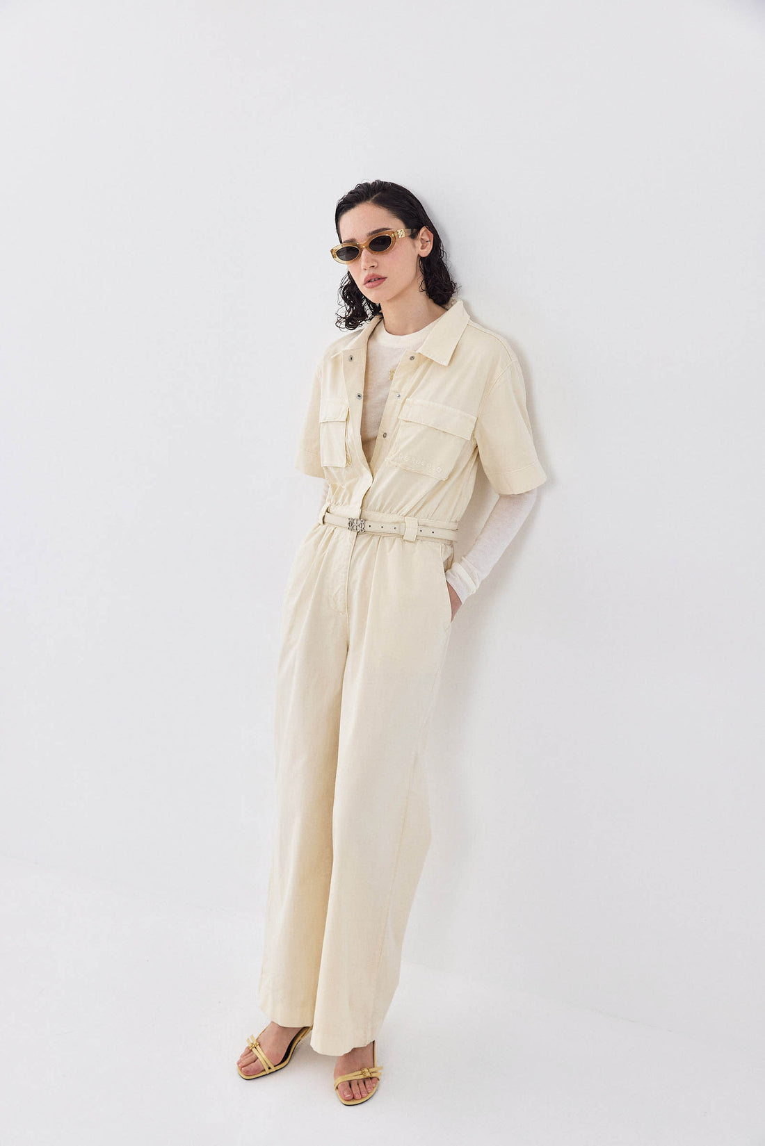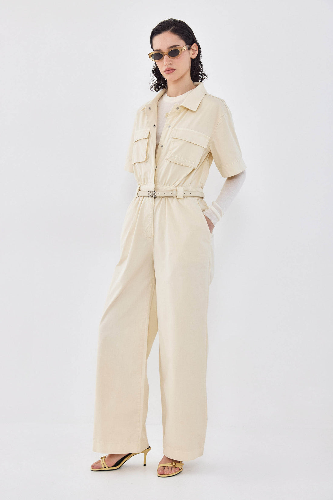 Our new short-sleeved cargo jumpsuit is a must-have for a cool day-to-night look. Front pant zipper and metal hook closure. Classic collar. Inner snaps buttons top closure. Wide belt loops. Two side pockets. Full length. Wide leg. Tonal logo embroidered on the front pocket. Elastic washed cotton fabric. Unlined. Style it with our chic, lightweight sheer knitted top, our leather wide buckle belt and seal it with our vegan leather bomber for an unforgettable look.