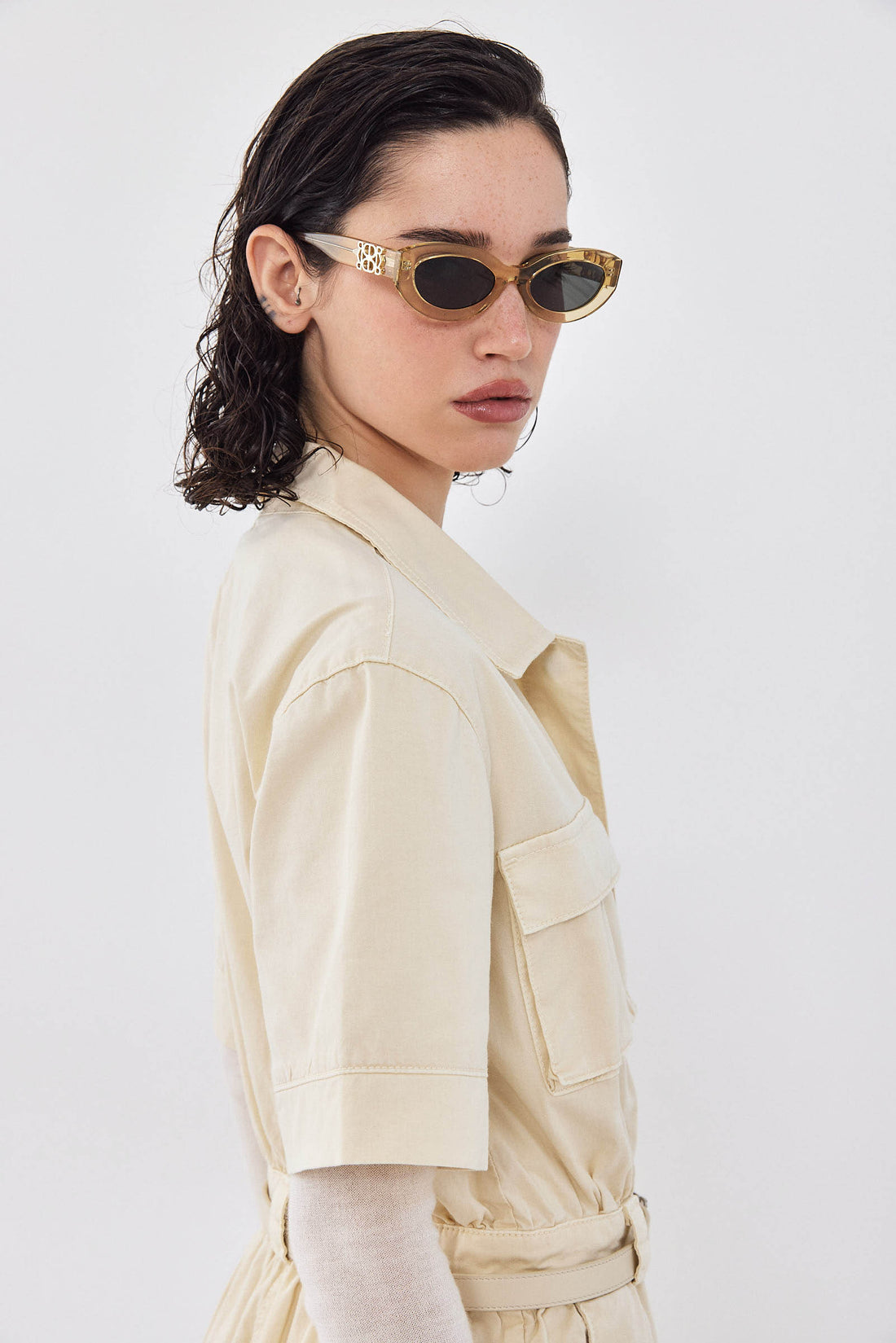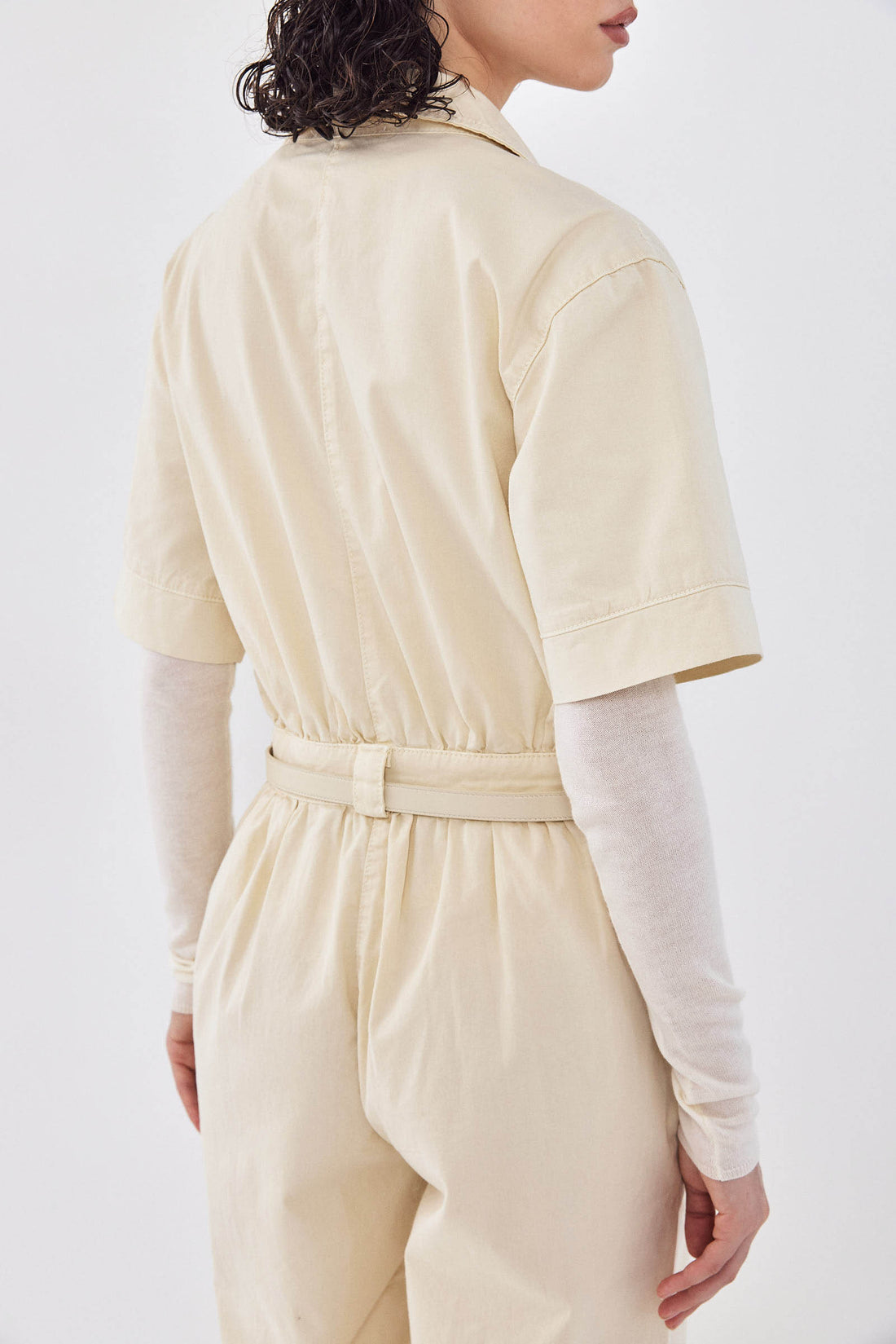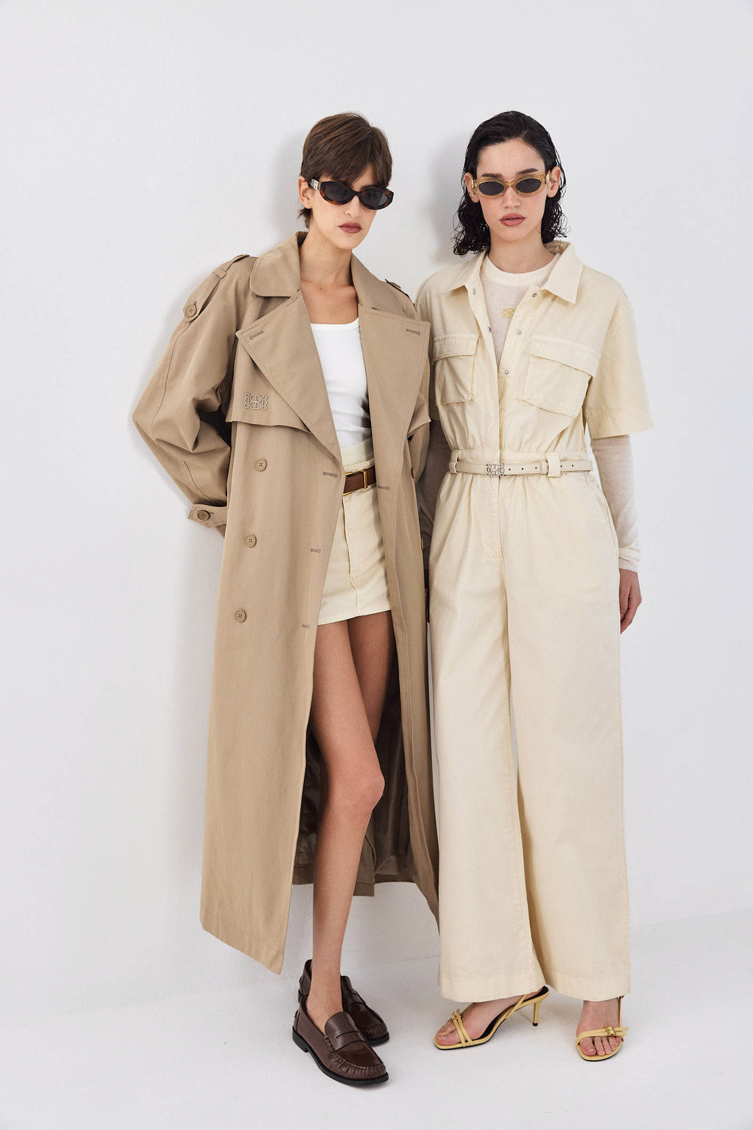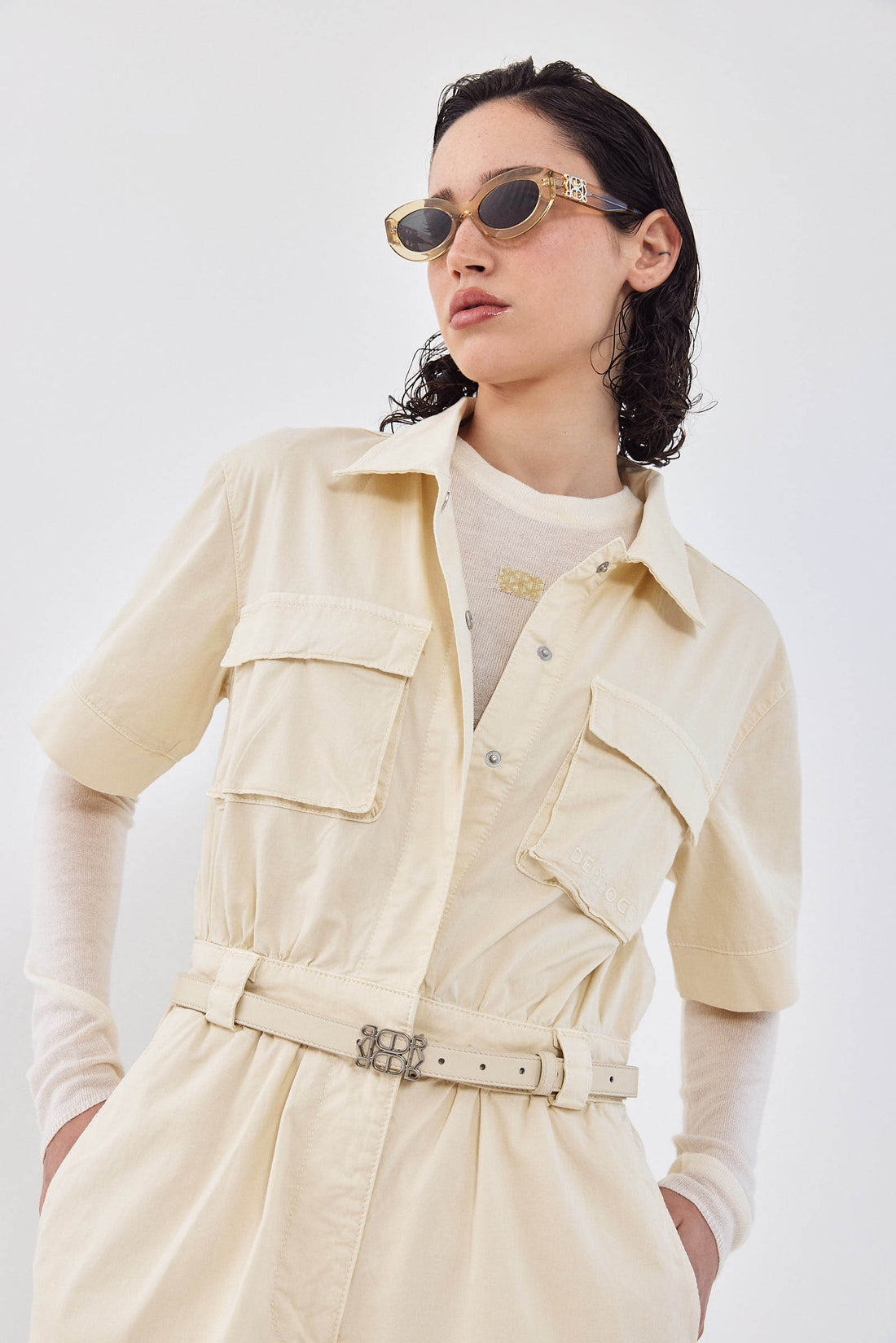 Our new short-sleeved cargo jumpsuit is a must-have for a cool day-to-night look. Front pant zipper and metal hook closure. Classic collar. Inner snaps buttons top closure. Wide belt loops. Two side pockets. Full length. Wide leg. Tonal logo embroidered on the front pocket. Elastic washed cotton fabric. Unlined. Style it with our chic, lightweight sheer knitted top, our leather wide buckle belt and seal it with our vegan leather bomber for an unforgettable look.