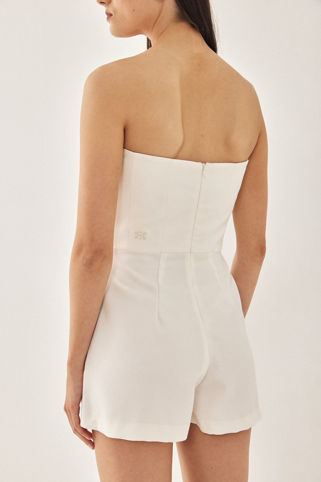 A strapless tailored jumpsuit with a corset fit top. Featuring a strapless neckline with a silicone strap for a better grip and a hidden zip closure. Featuring wiring at the sides for additional support. Embroidered logo at the back. A must have in your closet, perfect for styling up or down. Style it with a pair of kitten heels and a shoulder back for the perfect day to night look.