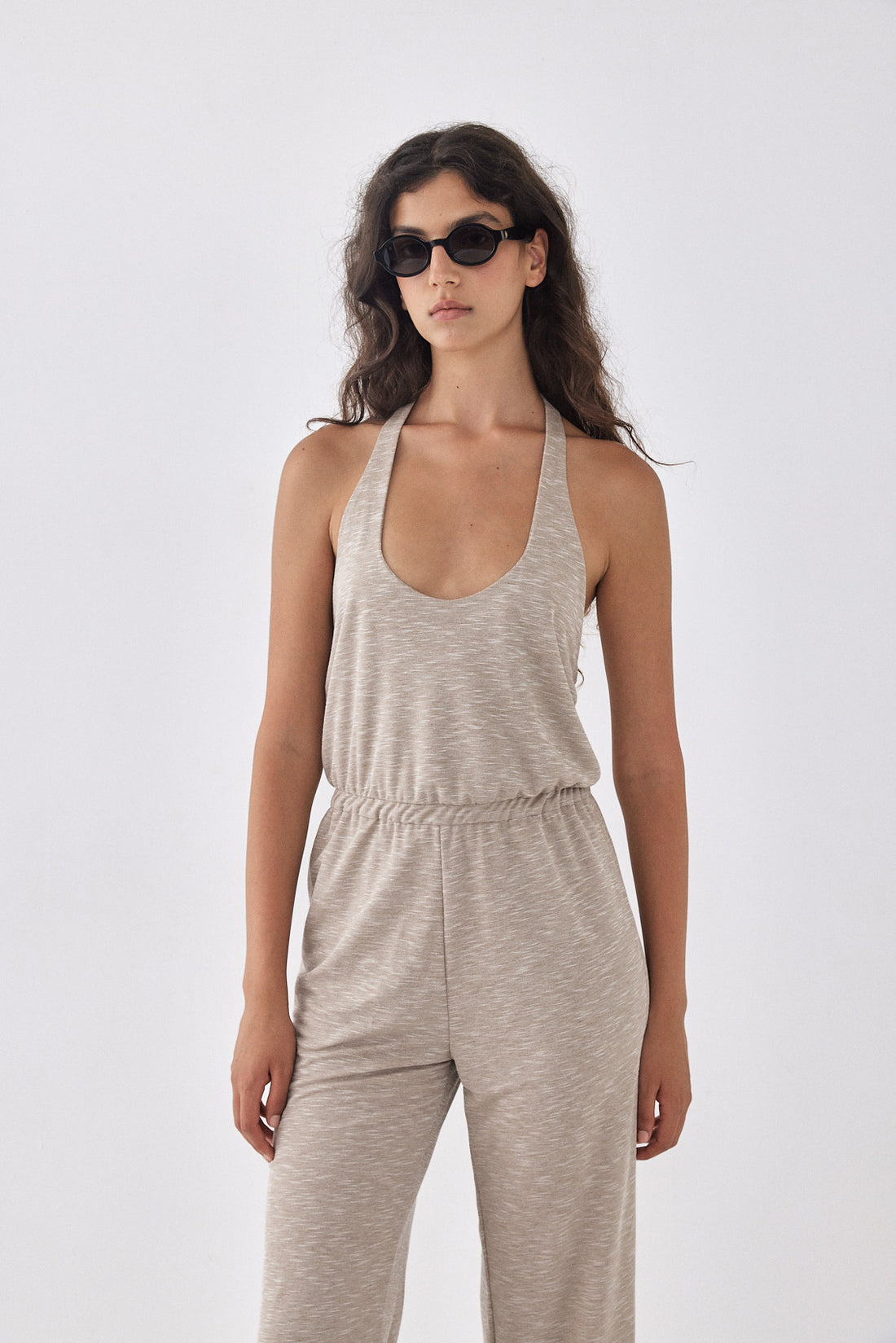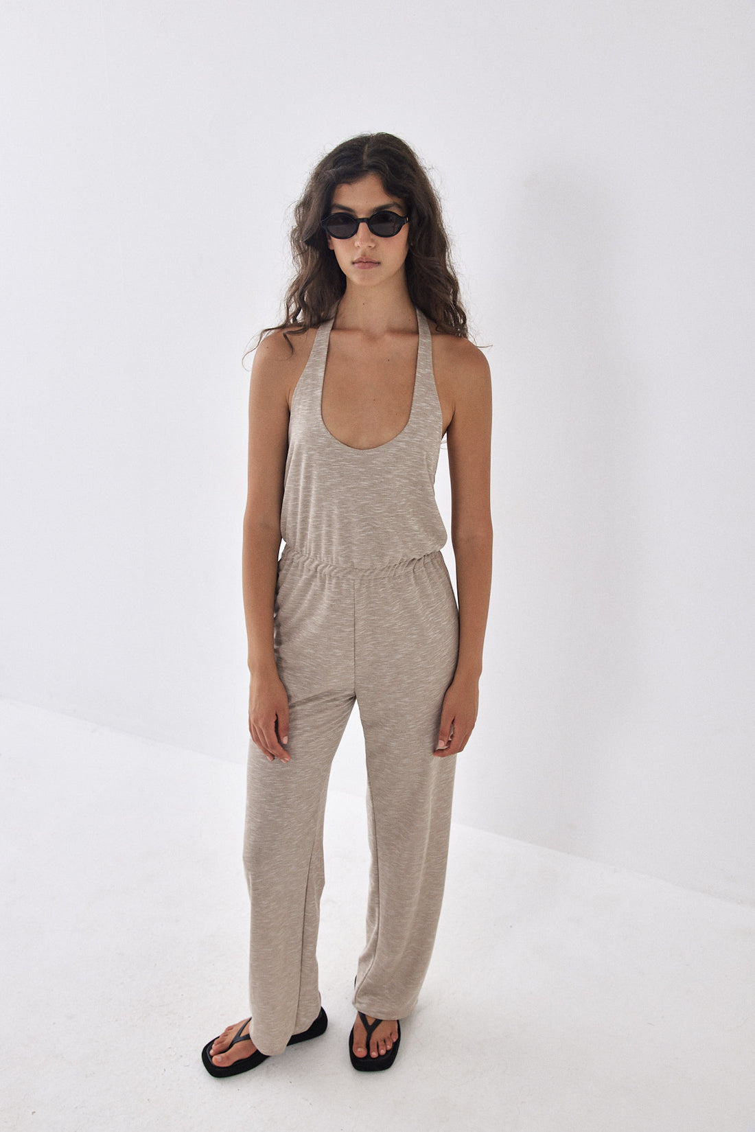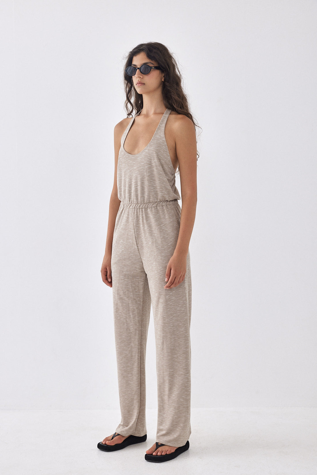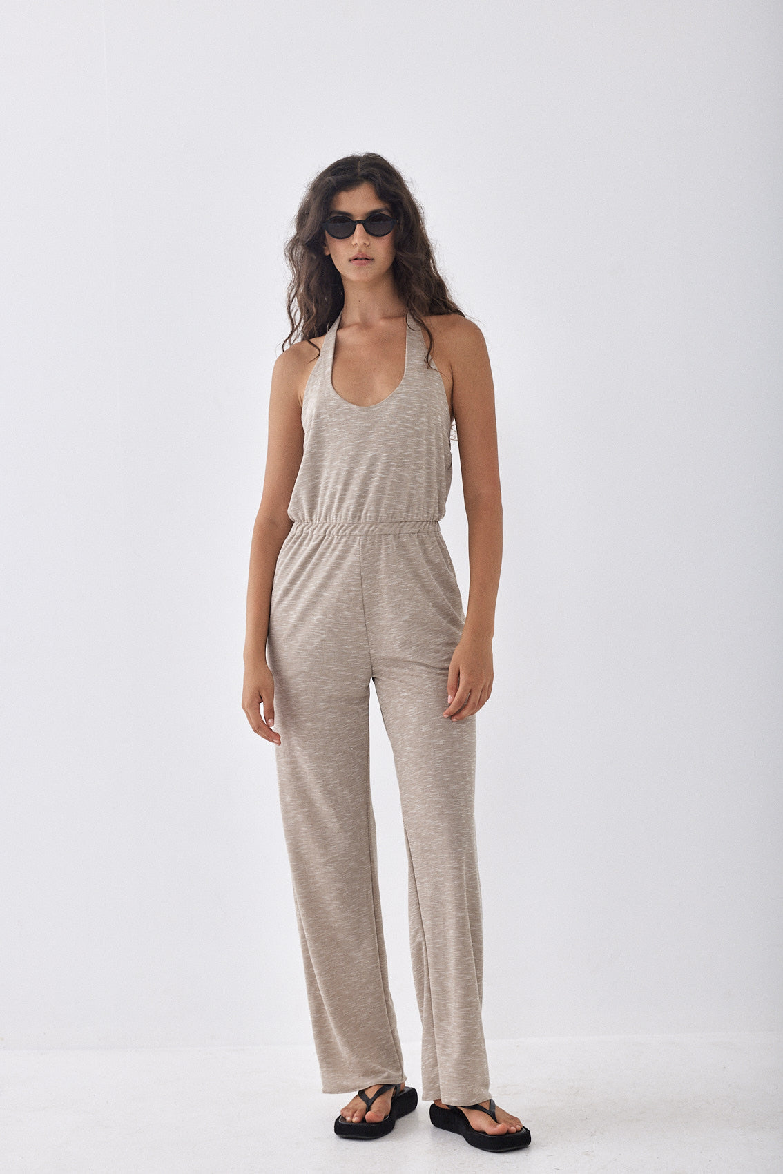 Buttery soft open back jumpsuit. Featuring an open back with an elastic band for extra grip. Tie closure at the neckline. Elastic waistband for a comfortable fit. Straight fit pants. Round neck opening at the front. Featuring two side pockets. Style it with your favorite sunglasses and a pair of slides for an ultra comfortable yet stylish look.