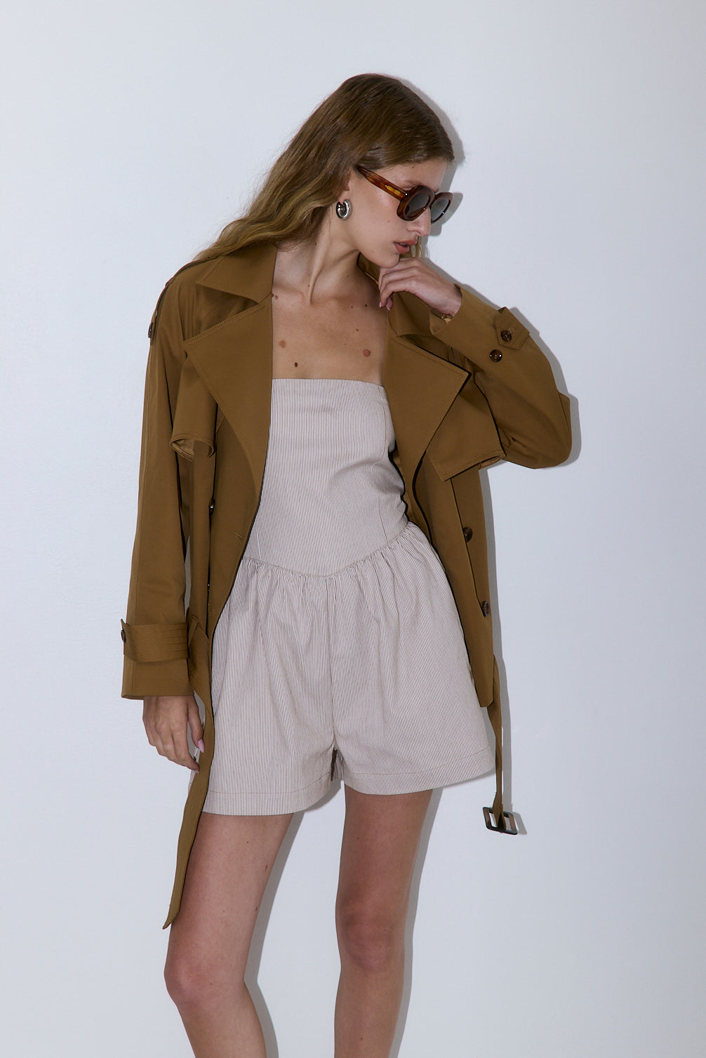 Our Strapless Striped Drill Jumpsuit: where polish meets play. Corset silhouette top. Internal silicon at the chest for extra grip. Pleated at the waist for added volume. Wide leg fit. Two side seam pockets. Tonal embroidered logo. Center-back zip closure. Style it with our crispy Fitted Poplin Button Down and stylish Round sunglasses for the ultimate summer's day.