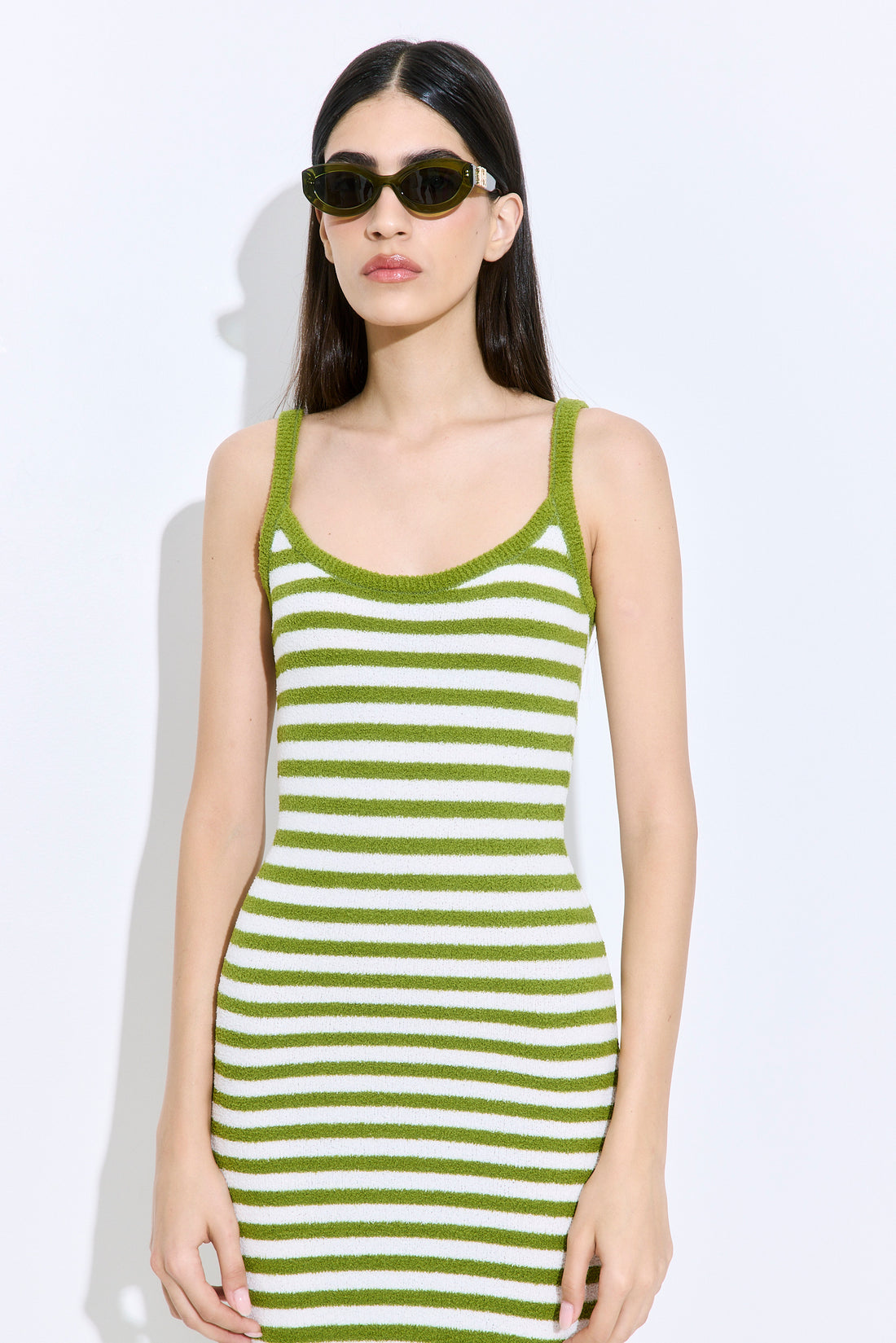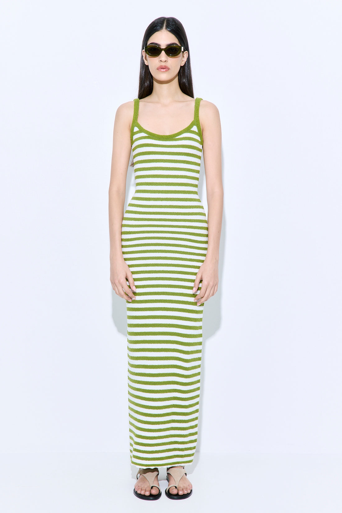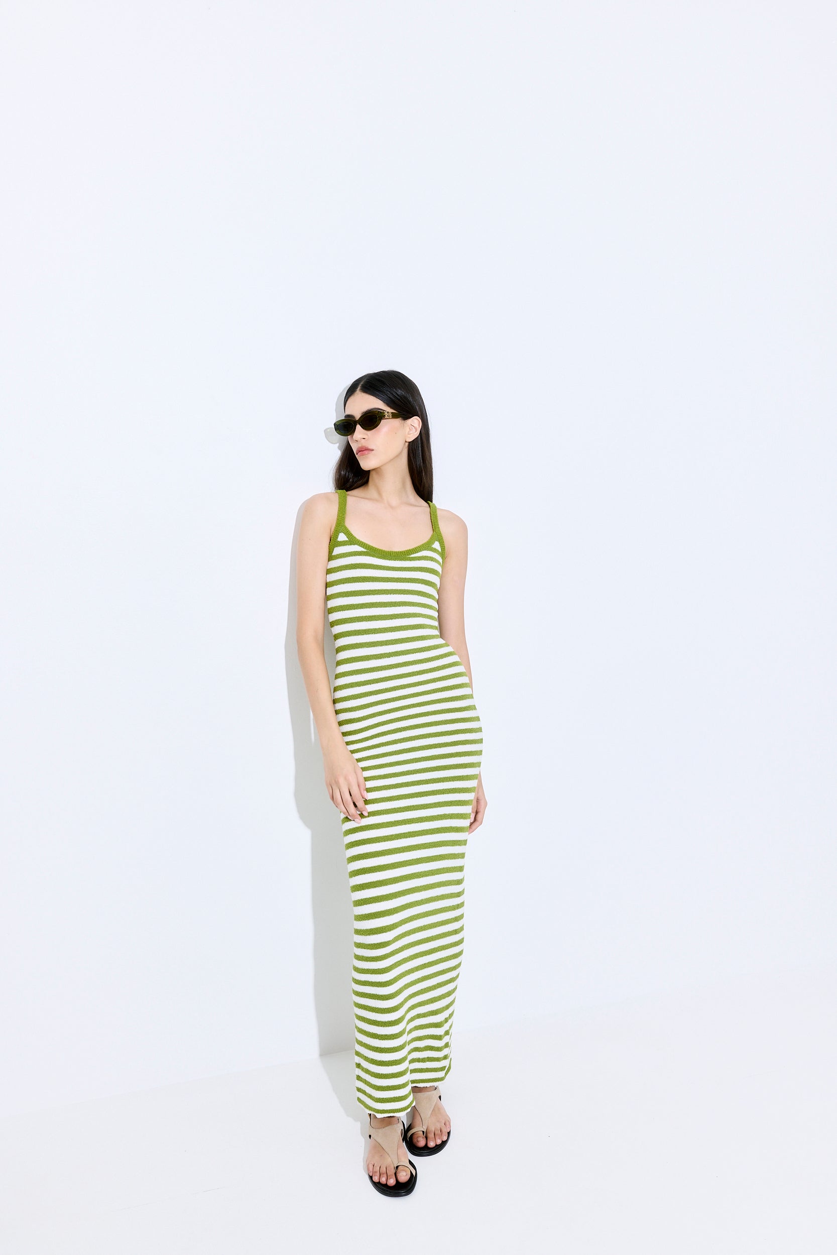 Our new strappy boucle dress will upgrade any look this season. Made from soft, textured boucle that’s breathable yet structured — offering lightweight warmth, subtle stretch, and all-day comfort with a refined edge. Fitted silhouette. Maxi length. Striped pattern. Tonal silicone logo embossed patch at the back. Wear it on your favorite swimwear, our beautiful sunnies and close the look woth our chic scrunchie.