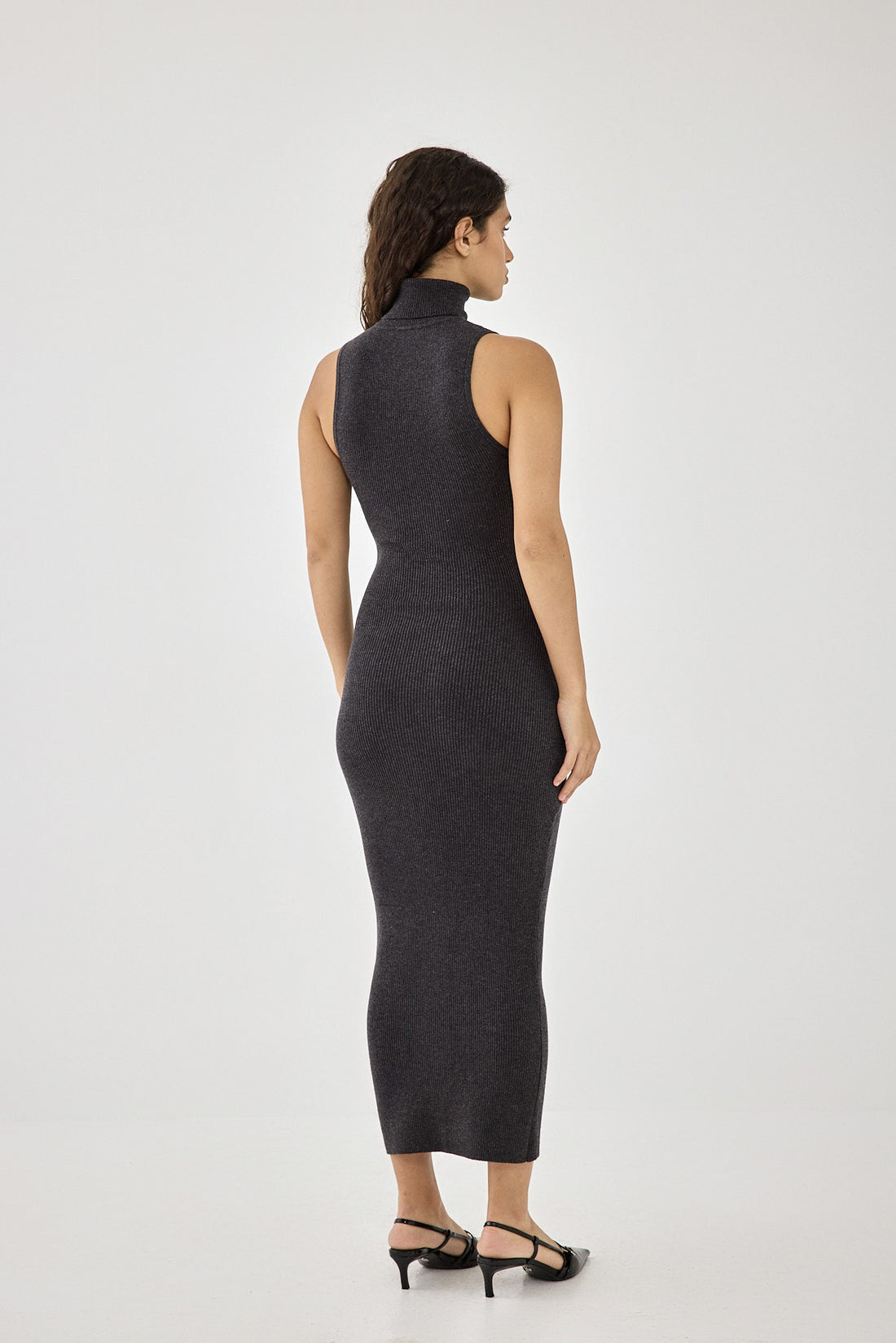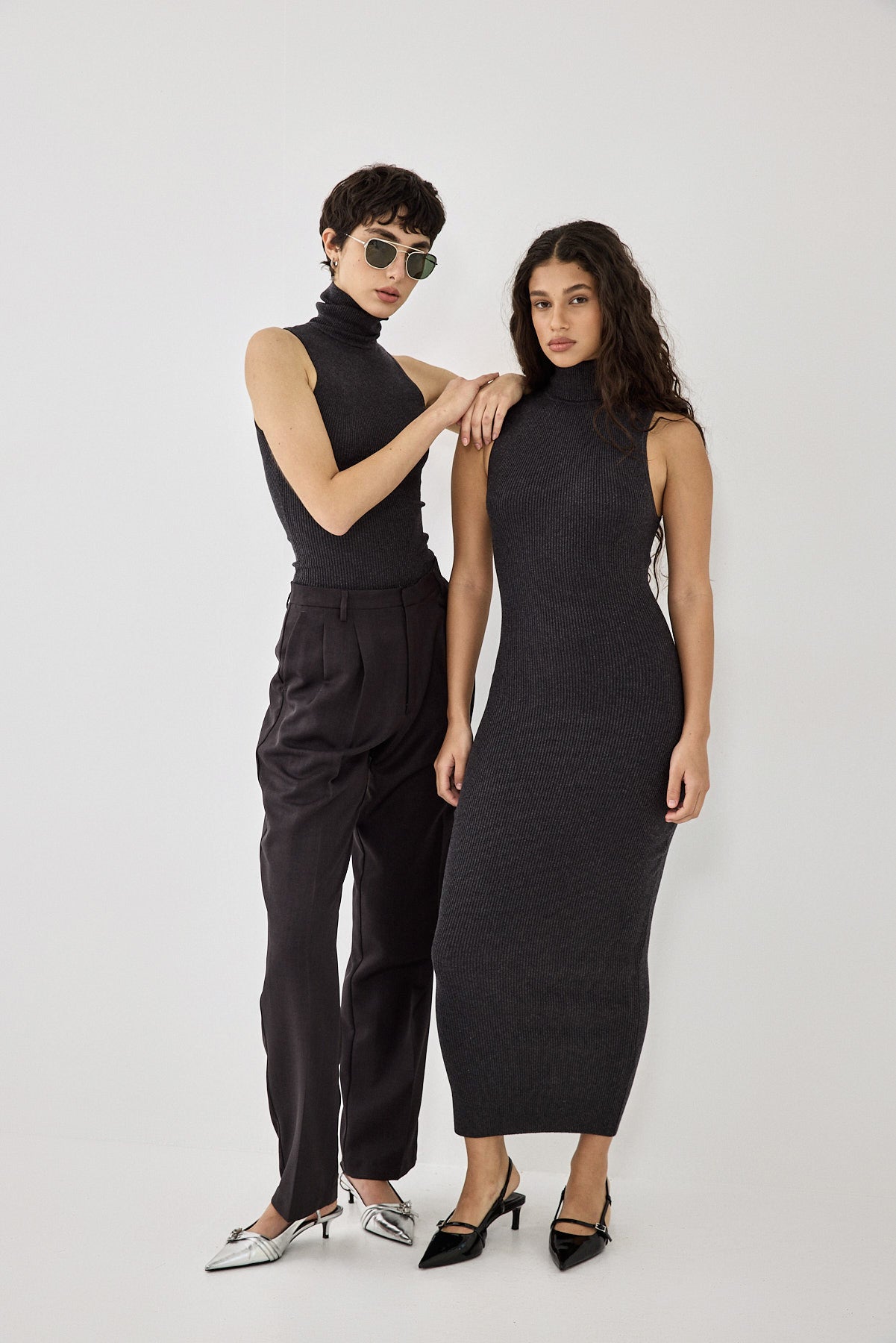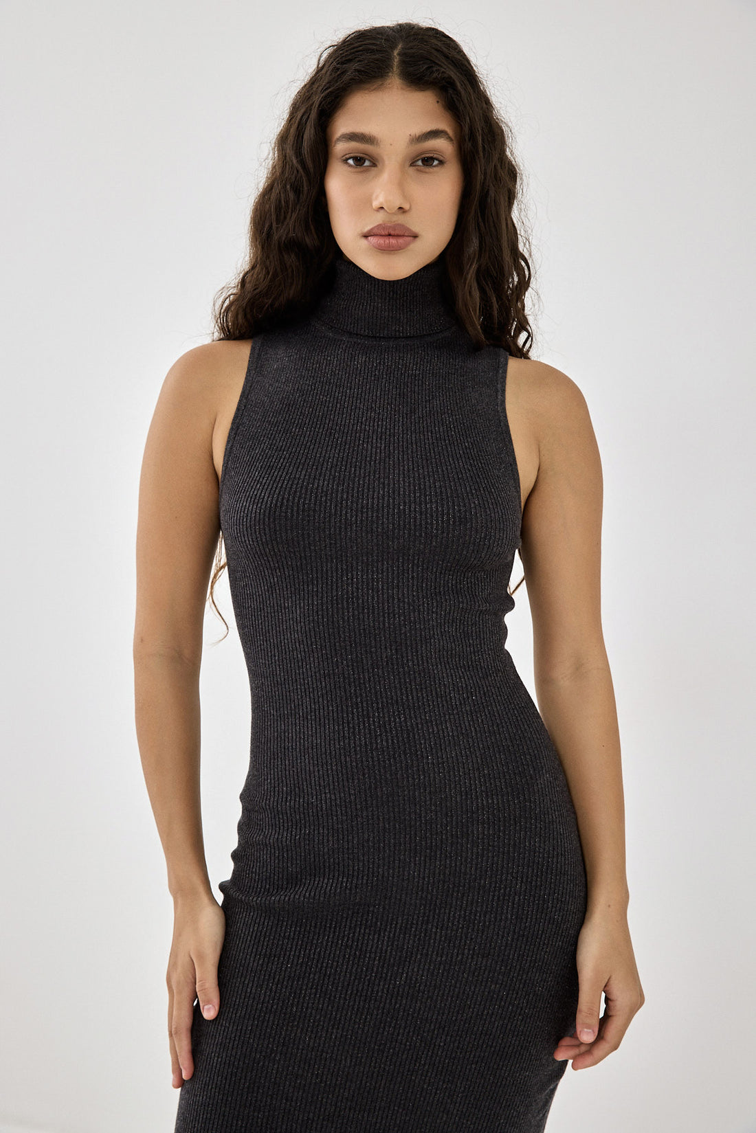 Glitter ribbed turtleneck dress. Full length maxi dress. Sleeveless. Material that hugs the body. Slight shine and shimmer within the fabric. Stretchy, ribbed material perfect for spring. Style it with a pair of kitten heels and your favorite sunnies for a stylish day to night look.