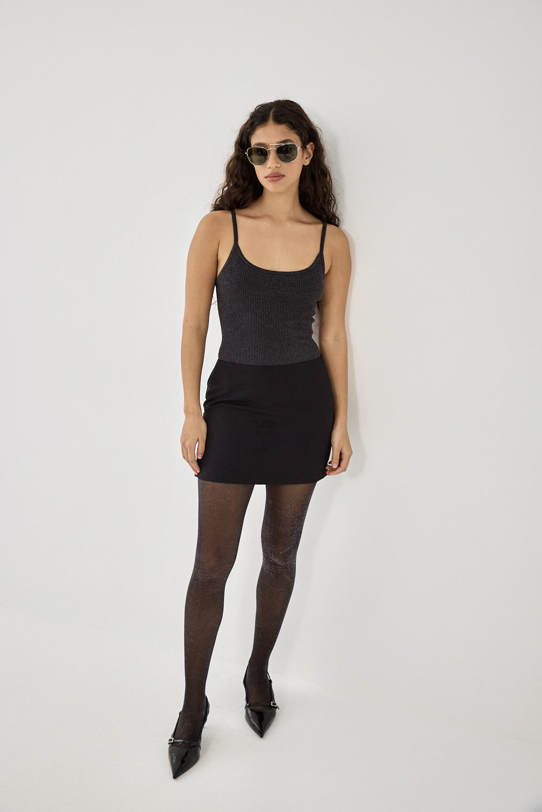 A warmer weather must have wardrobe essential. Glitter slip ribbed tank top. Thin straps.  Material that hugs the body. Ultra flattering cleavage opening. Slight shine and shimmer within the fabric. Style it with your favorite mini skirt and a pair of loafers for a perfect spring look.