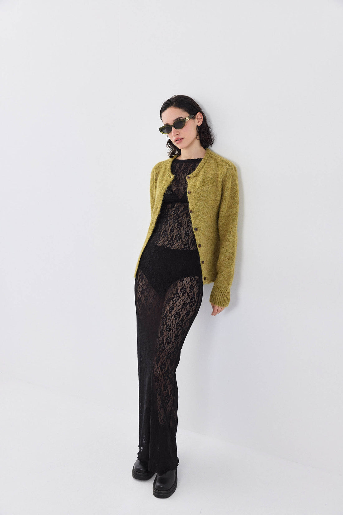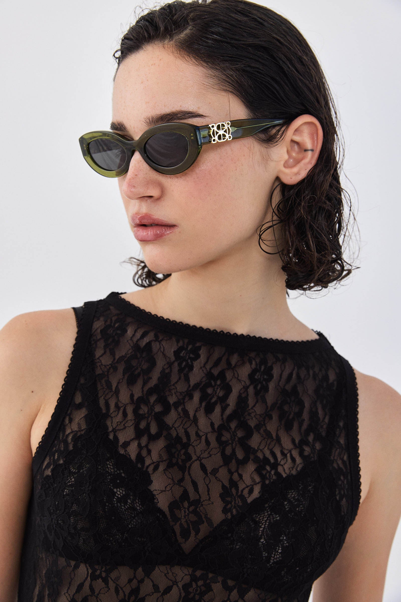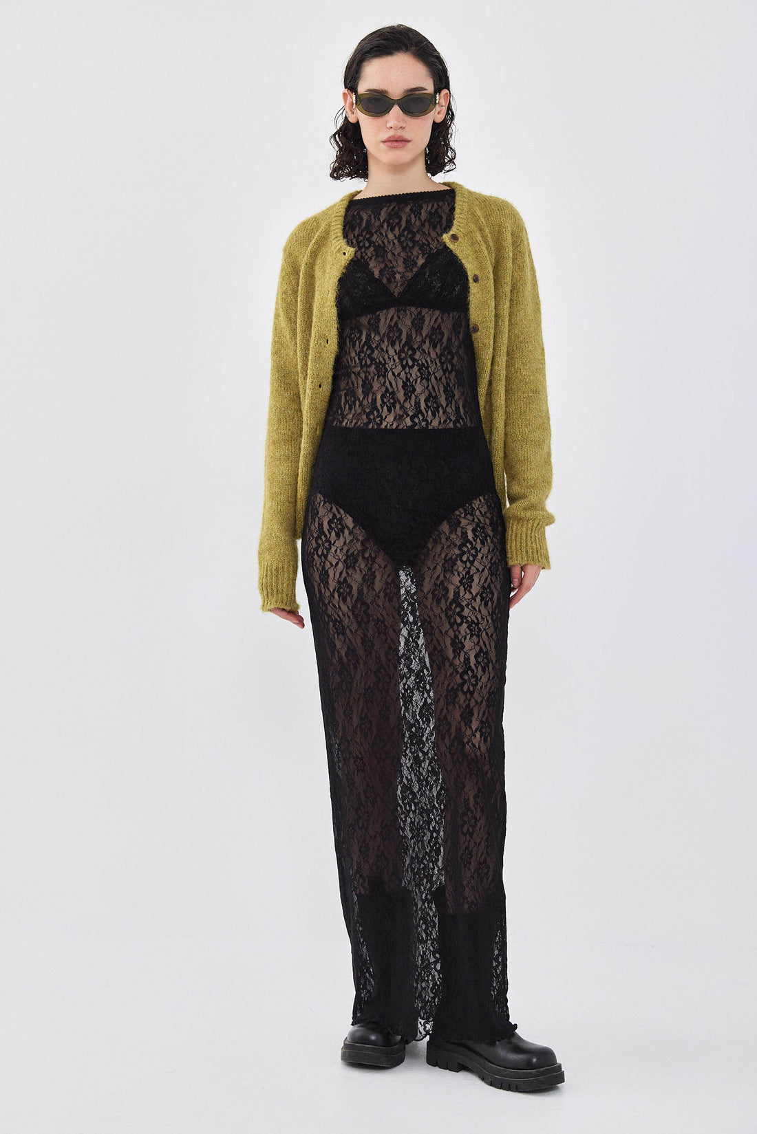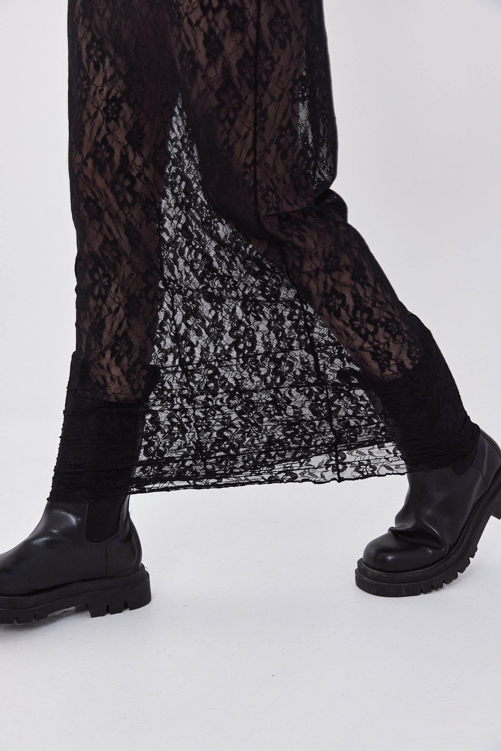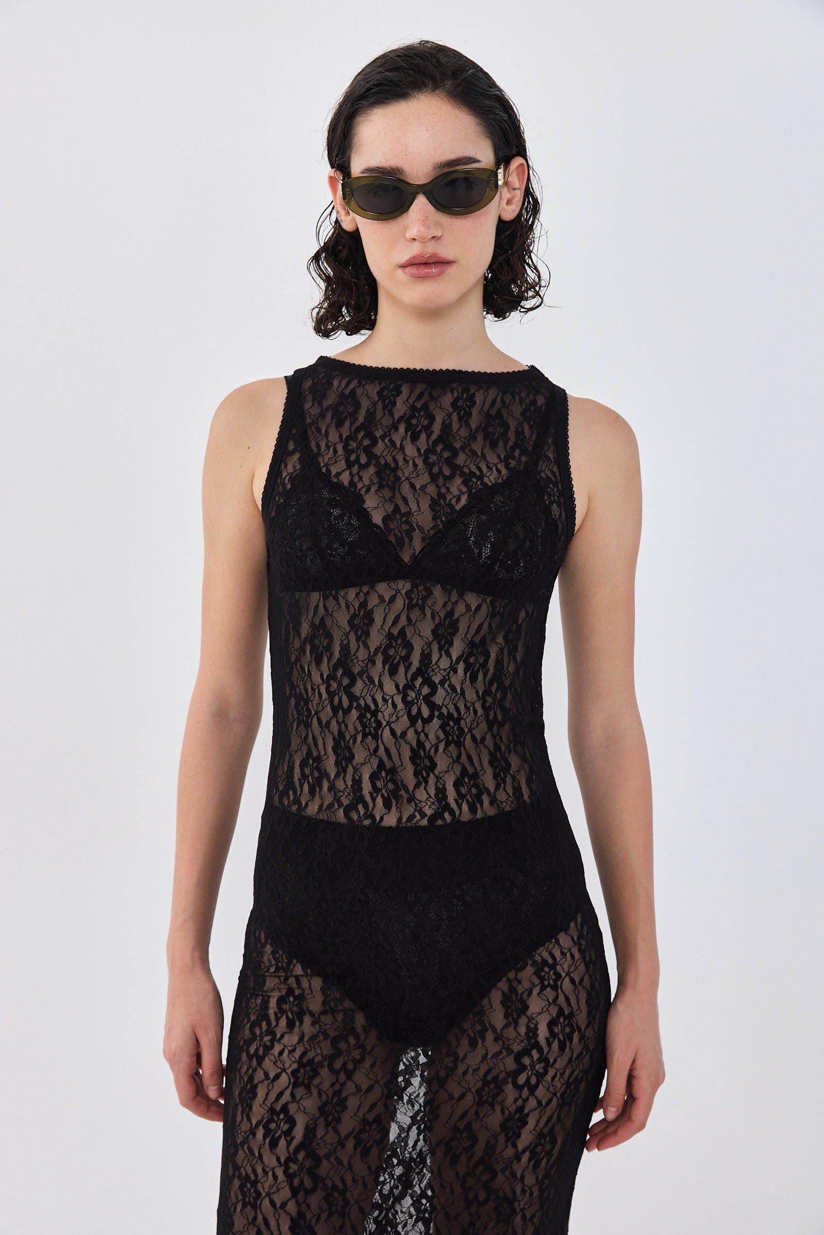 Flower pattern lace dress. Stretchy material that hugs the body. Boatneck neckline. Squared back. Cotton tonal logo patch on the back. Style it with your favorite tonal lingerie, our vintage feel wide buckle belt and a pair of satin kitten heels and our vegan leather blazer on top to tie off the look together.