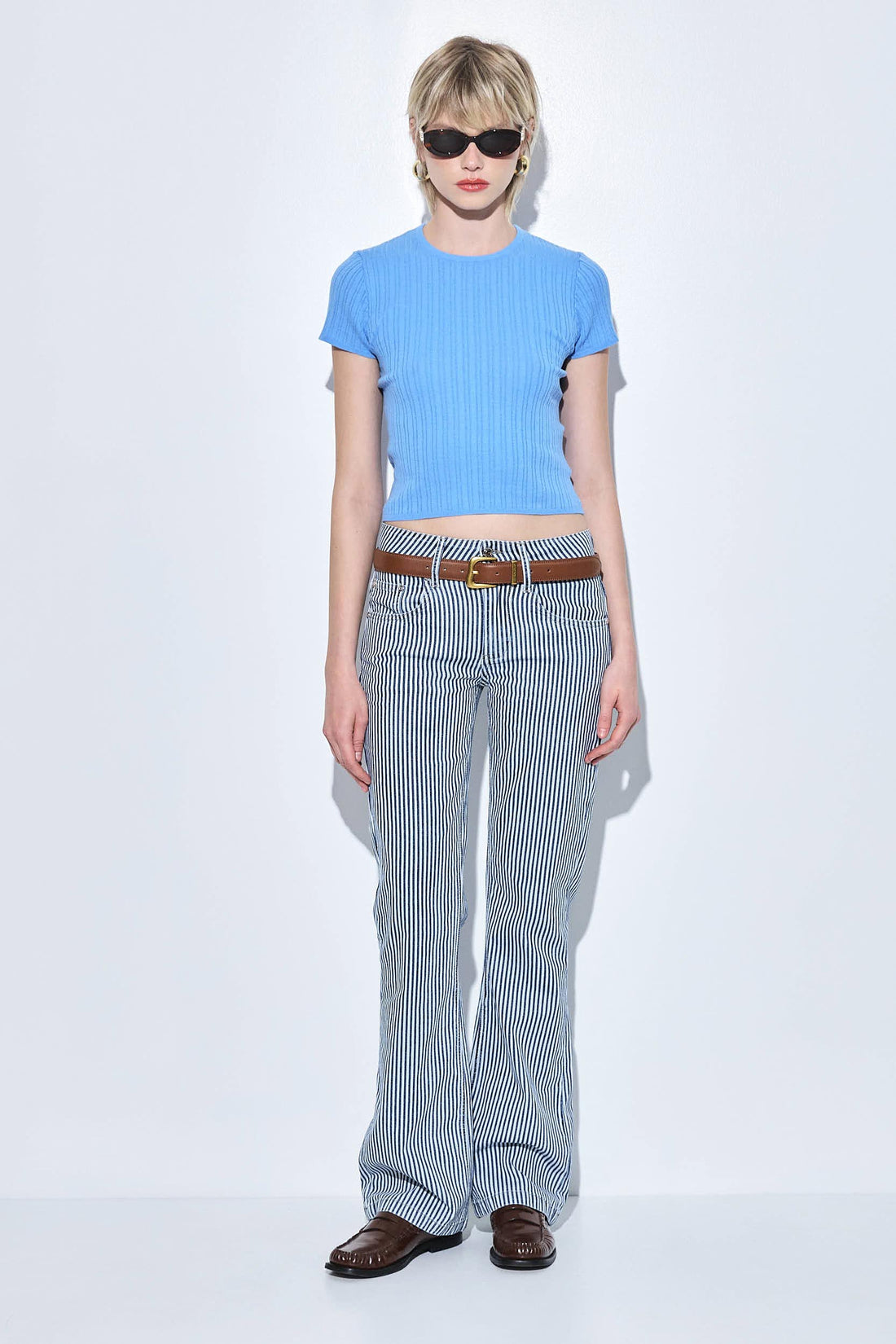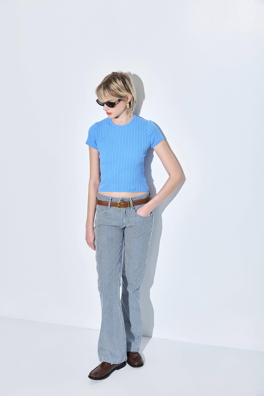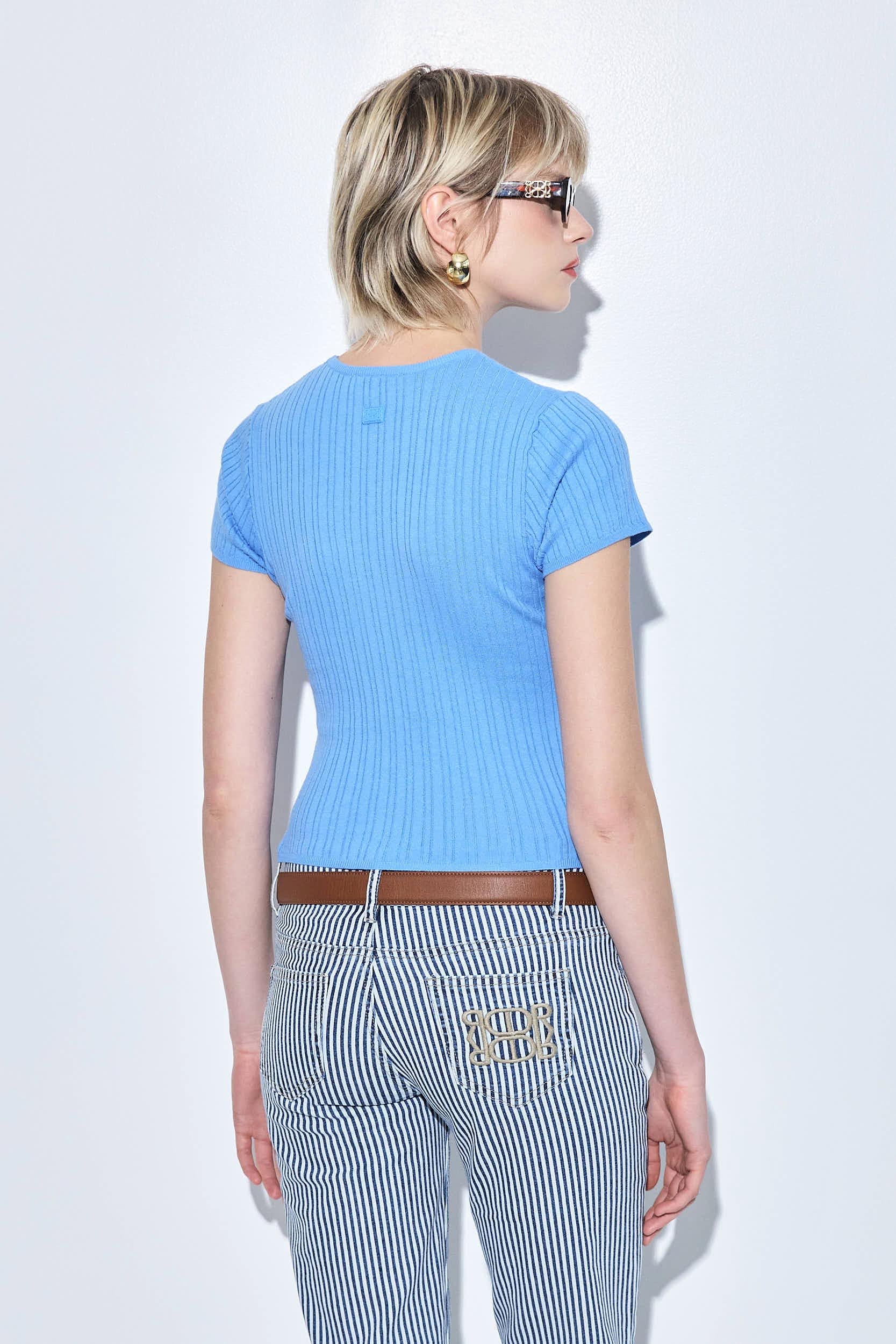 Our ribbed crew neck T is a true summer wardrobe essential. Ribbed crewneck collar. Contrast ribbed finish. Featuring a tonal silicone logo patch detailing at the upper back. Style it with our linen maxi skirt, a pair of our beautiful sunnies and our cool scrunchie to seal this gorgeous look.