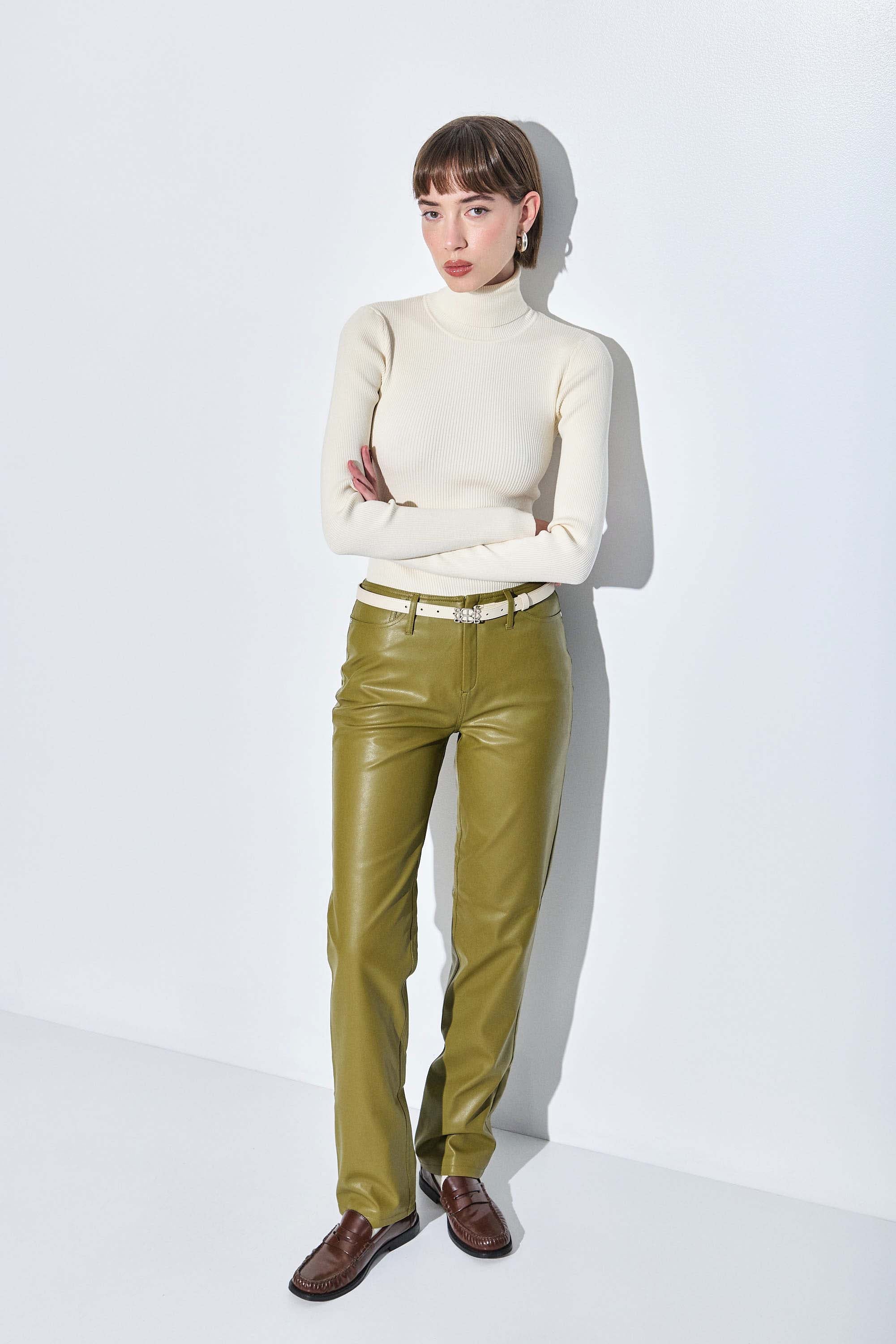 Our new ribbed turtleneck top is the ultimate piece to own this season. Long sleeves. Fitted silhouette. Tonal silicone patch embossed logo. Stretchy fabric that hugs the body. Clean finish. Style it with our matching ribbed flare leggings, throw our vegan leather jacket on top and our monogram signature scarf to seal this effortless look.