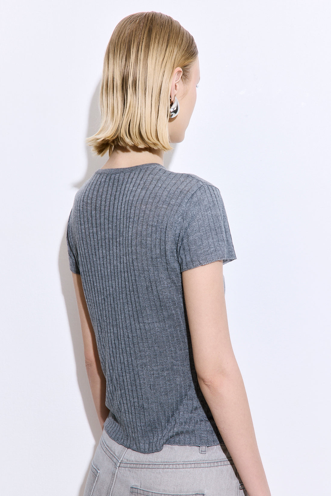 Prepare to fall in love with our new sheer ribbed logo top. Crew neckline. Delicate ribbed finish. Soft and lightweight ribbed fabric. Slightly sheer. Contrasting intarsia logo detailing on the front. Short sleeved. Style it with our full length linen pants, our beautiful oval sunnies and seal this look with our signature Rodika tote bag for the perfect summer look.