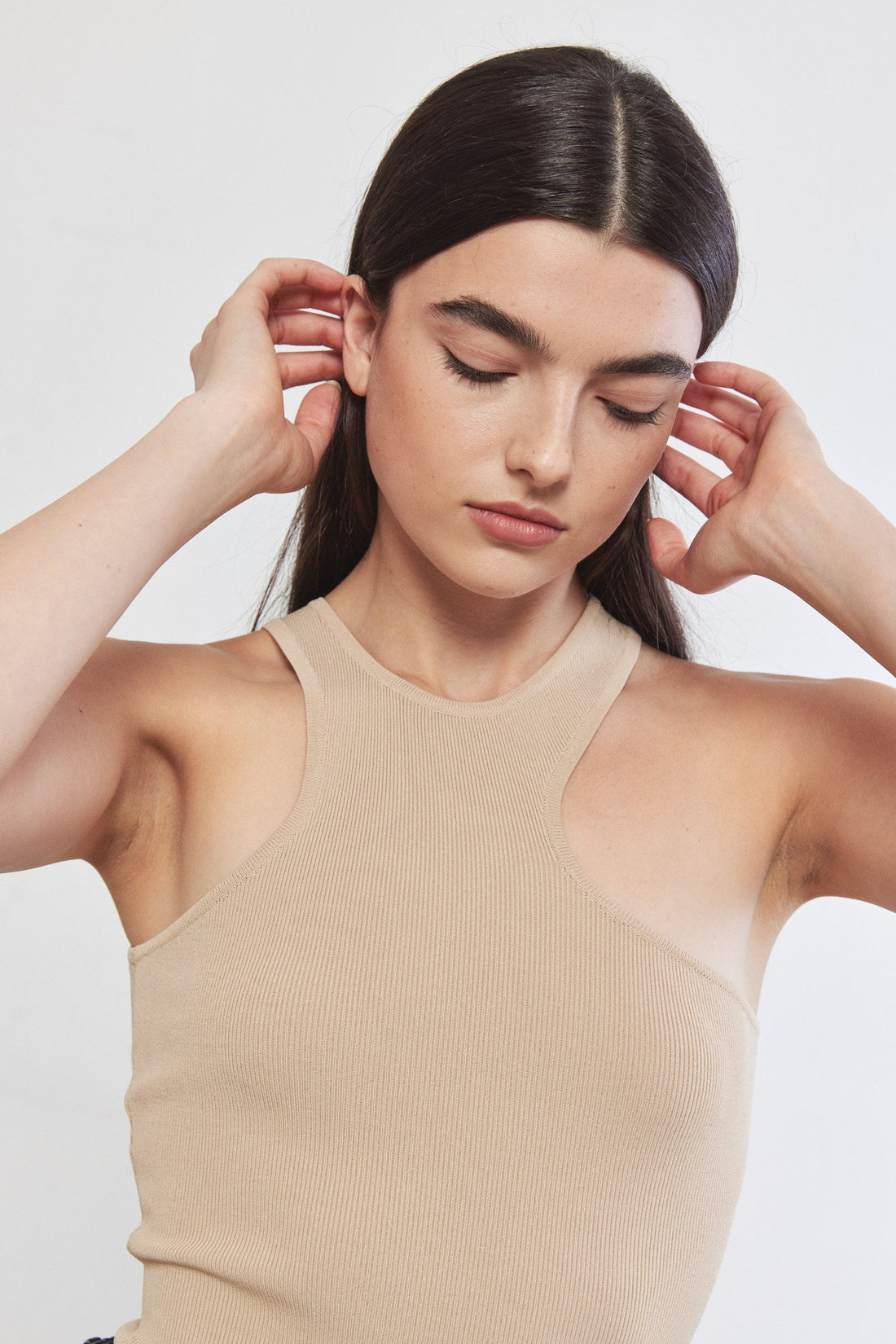 A close fit ribbed top featuring an asymmetrical neckline. Made from a knitted fabric with fully fashion finishes. Wear yours any bottom from denim to skirt.