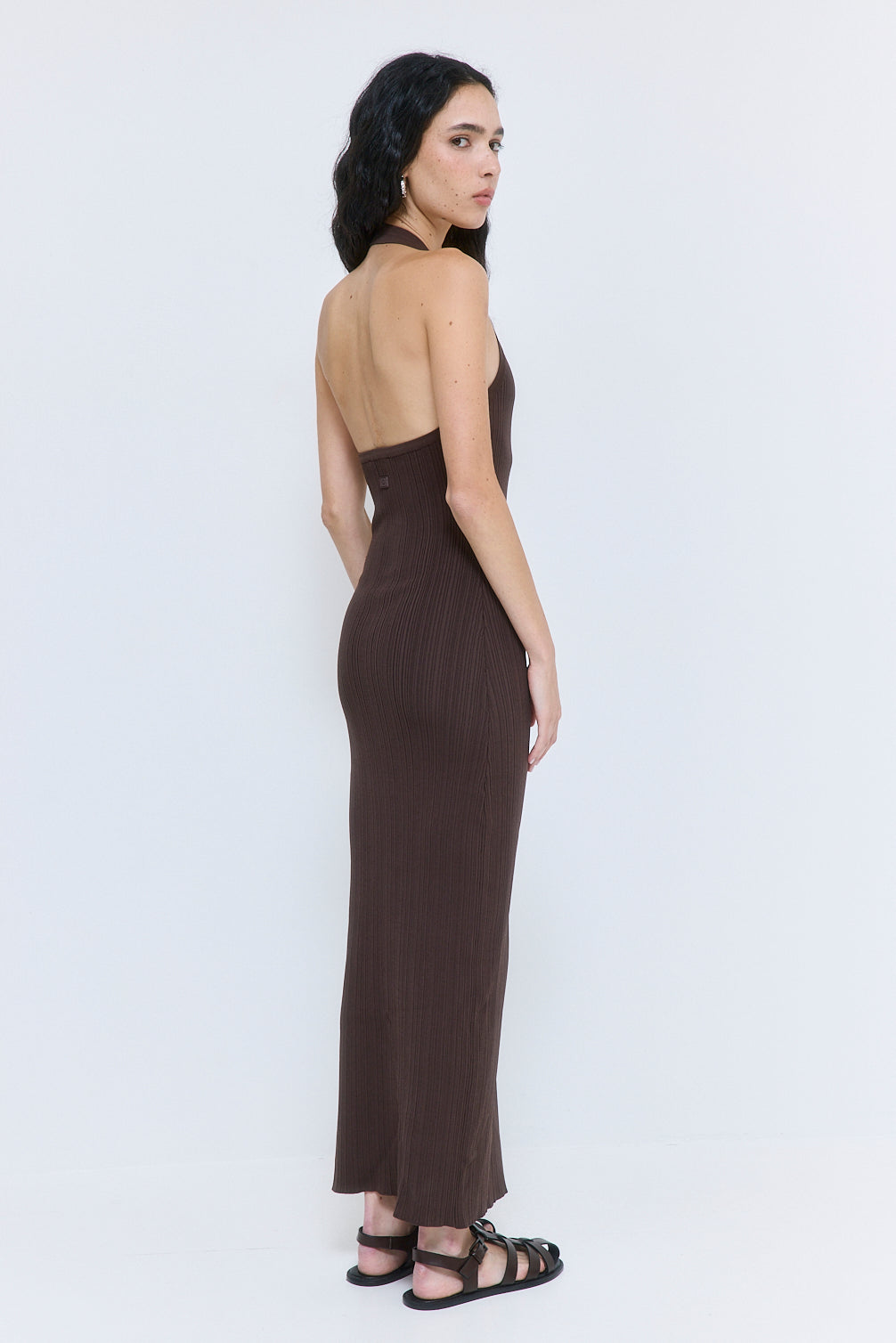 The perfect maxi dress for your dream wardrobe. A summer essential with the most flattering fitted silhouette. Stretchy ribbed fabric that hugs the body. Maxi length. Fully fashion finish. Halter neck. Scoop neckline. Open back. Tonal logo silicon patch on the back. Complete the look with our luscious Fitted Poplin Button Down and our chic Round Sunglasses for an effortless look.