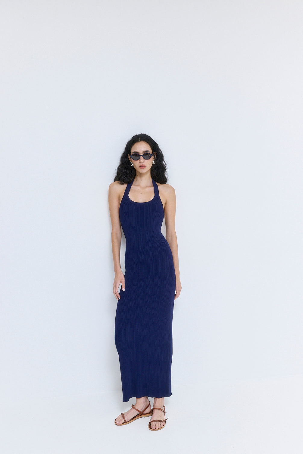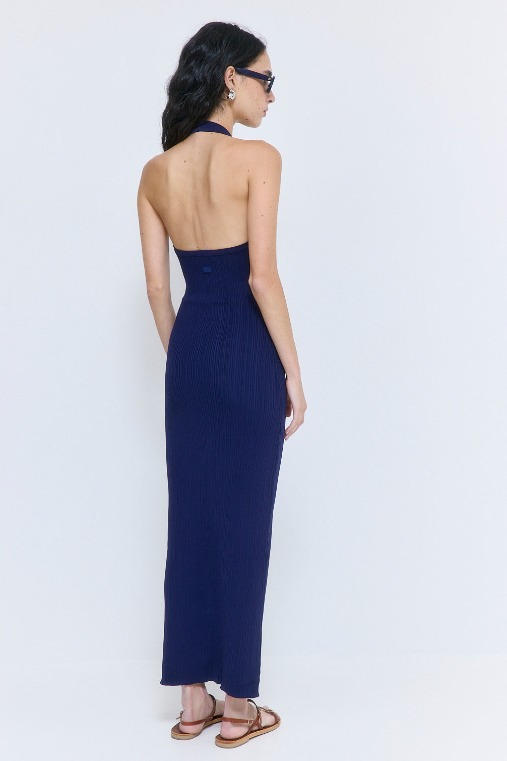 The perfect maxi dress for your dream wardrobe. A summer essential with the most flattering fitted silhouette. Stretchy ribbed fabric that hugs the body. Maxi length. Fully fashion finish. Halter neck. Scoop neckline. Open back. Tonal logo silicon patch on the back. Complete the look with our luscious Fitted Poplin Button Down and our chic Round Sunglasses for an effortless look.