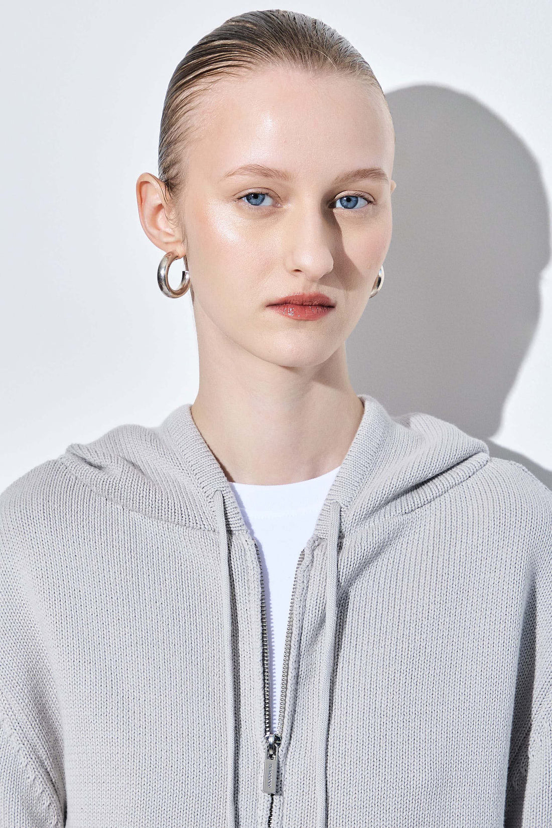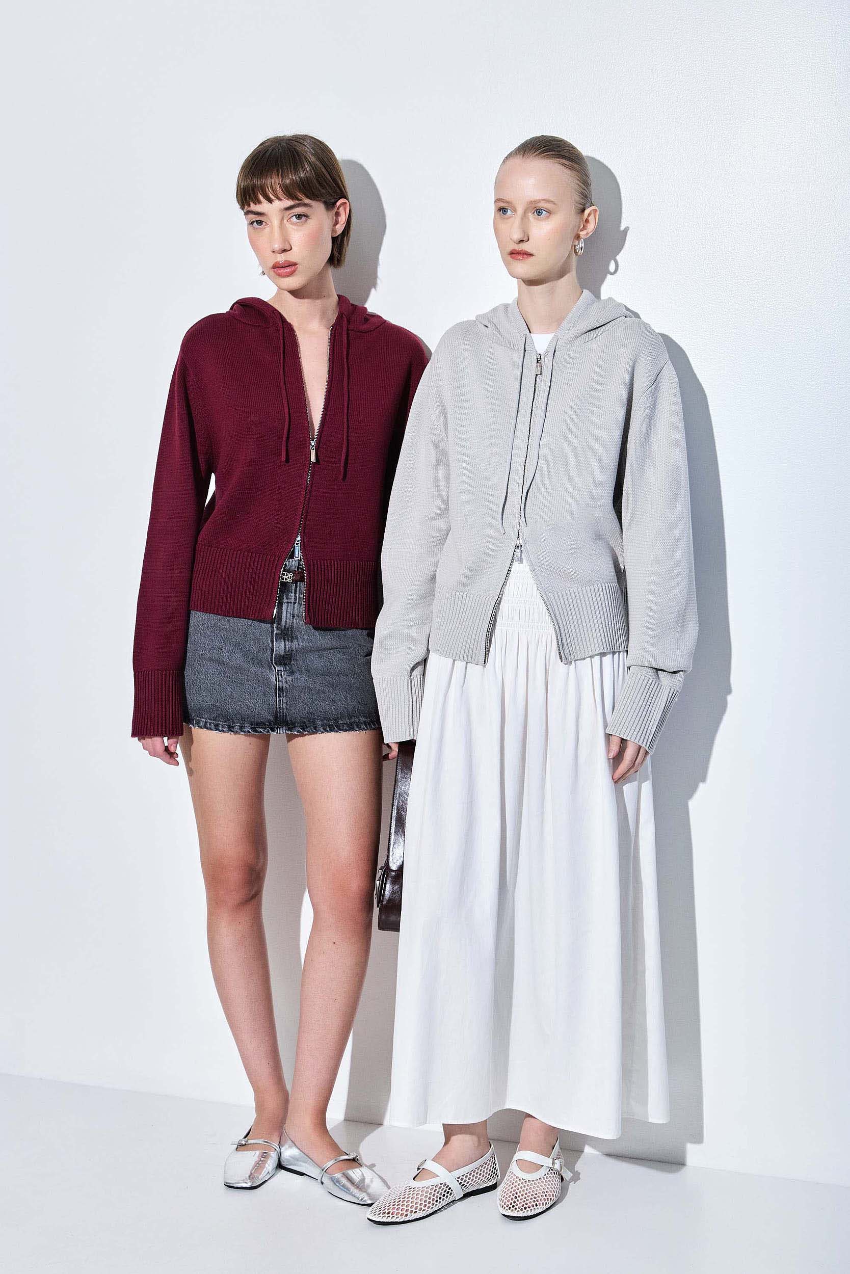 Our new double zipper hoodie is the coolest piece you'll own this season. 100% soft cotton fabric. Embroidered logo metal zipper closure. Ribbed finish. Tonal embroidered logo detailing on the front side. Adjustable strings and a delicate hoodie. Style it with our flattering pair of denim, our lettuce hem socks and throw our classic trench on top for a cool effortless look.
