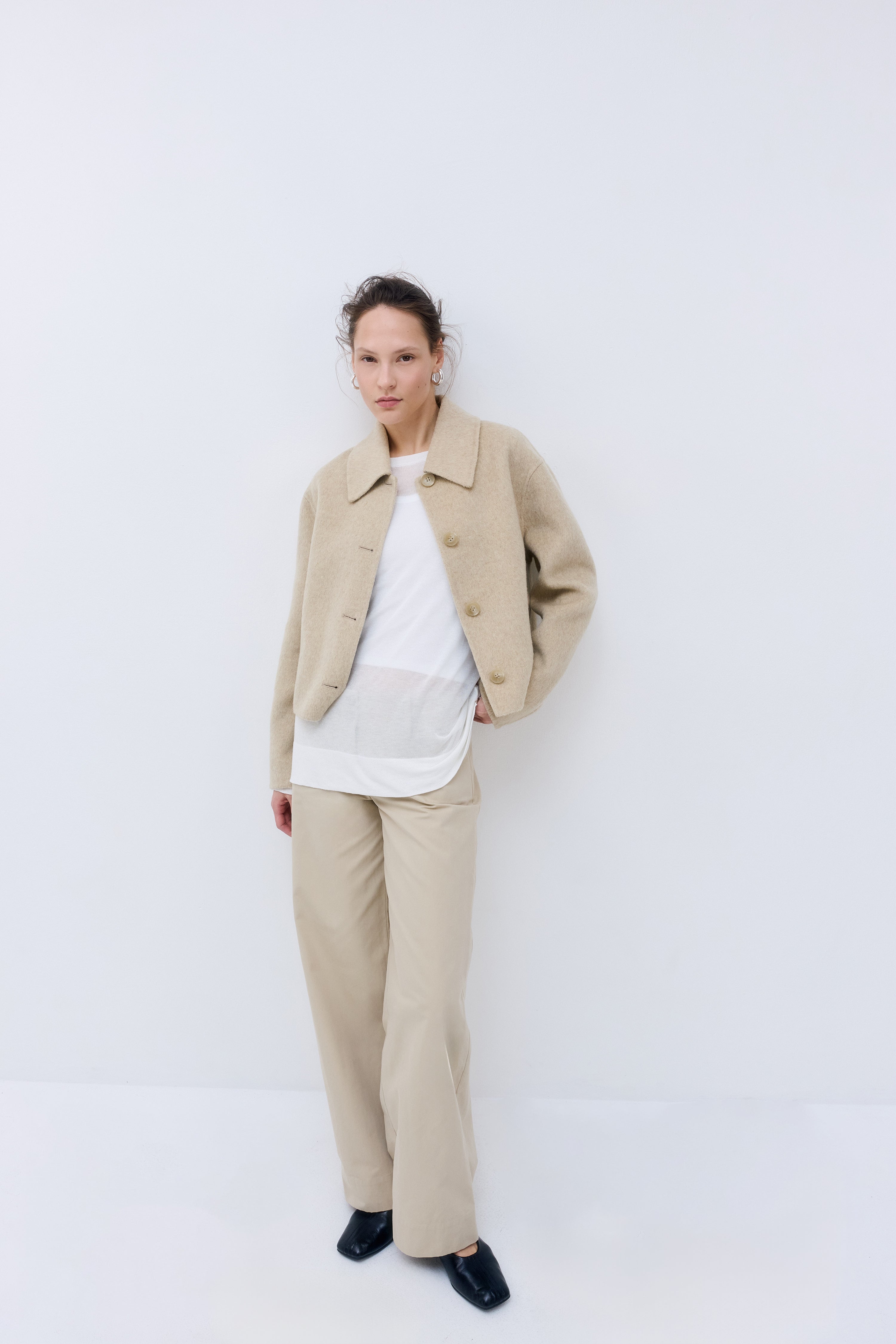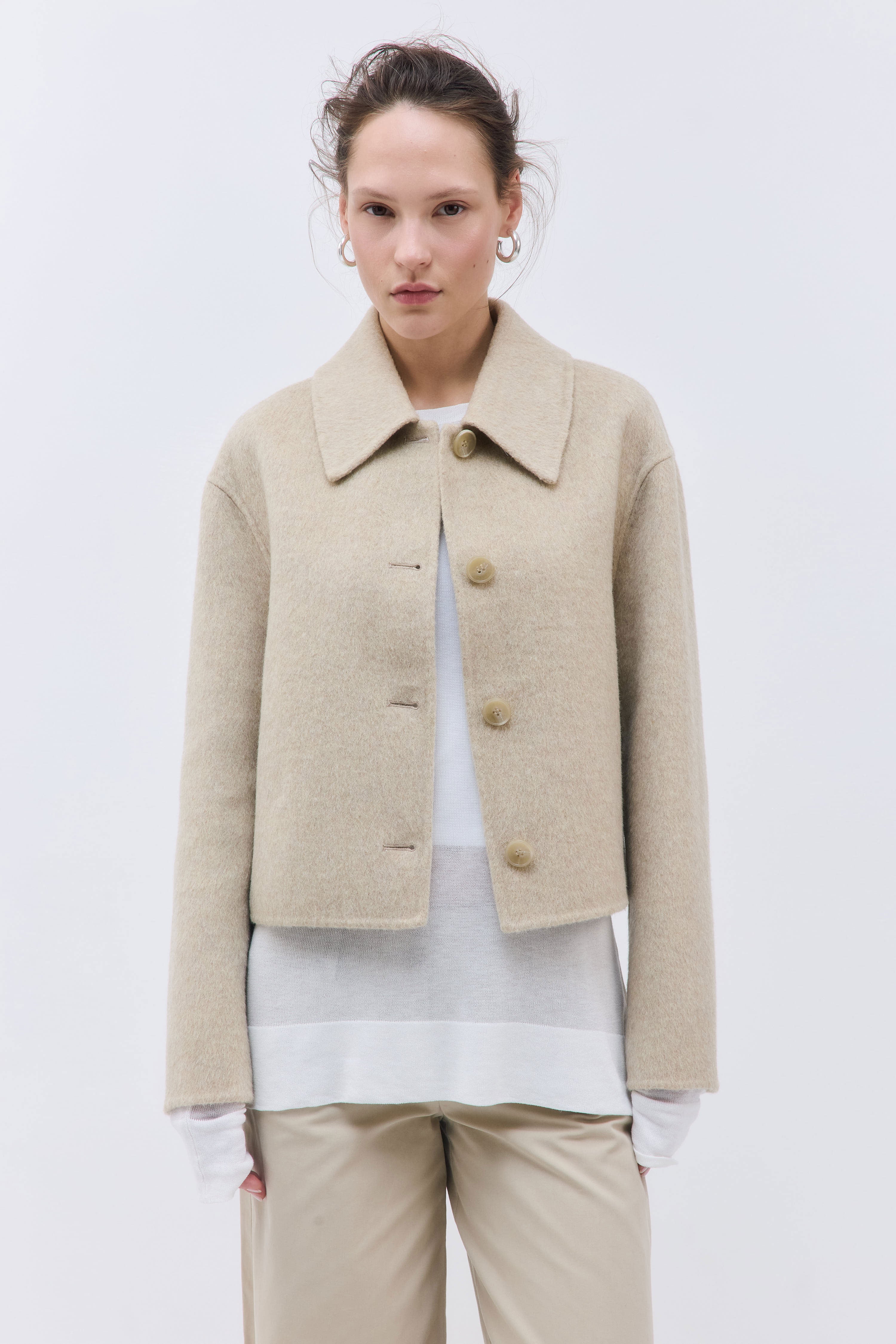 Released as part of our limited edition winter collection; Elevate your fall wardrobe with our new double wool cropped coat. Relaxed fit, short, double wool jacket. Classic pointed collar. Tonal logo engraved buttoned closure. Unlined. Pair it with our timeless No.8| High Waisted Wide Leg Denim and our sleek Jacki Sunglasses for a sophisticated, elevated look.