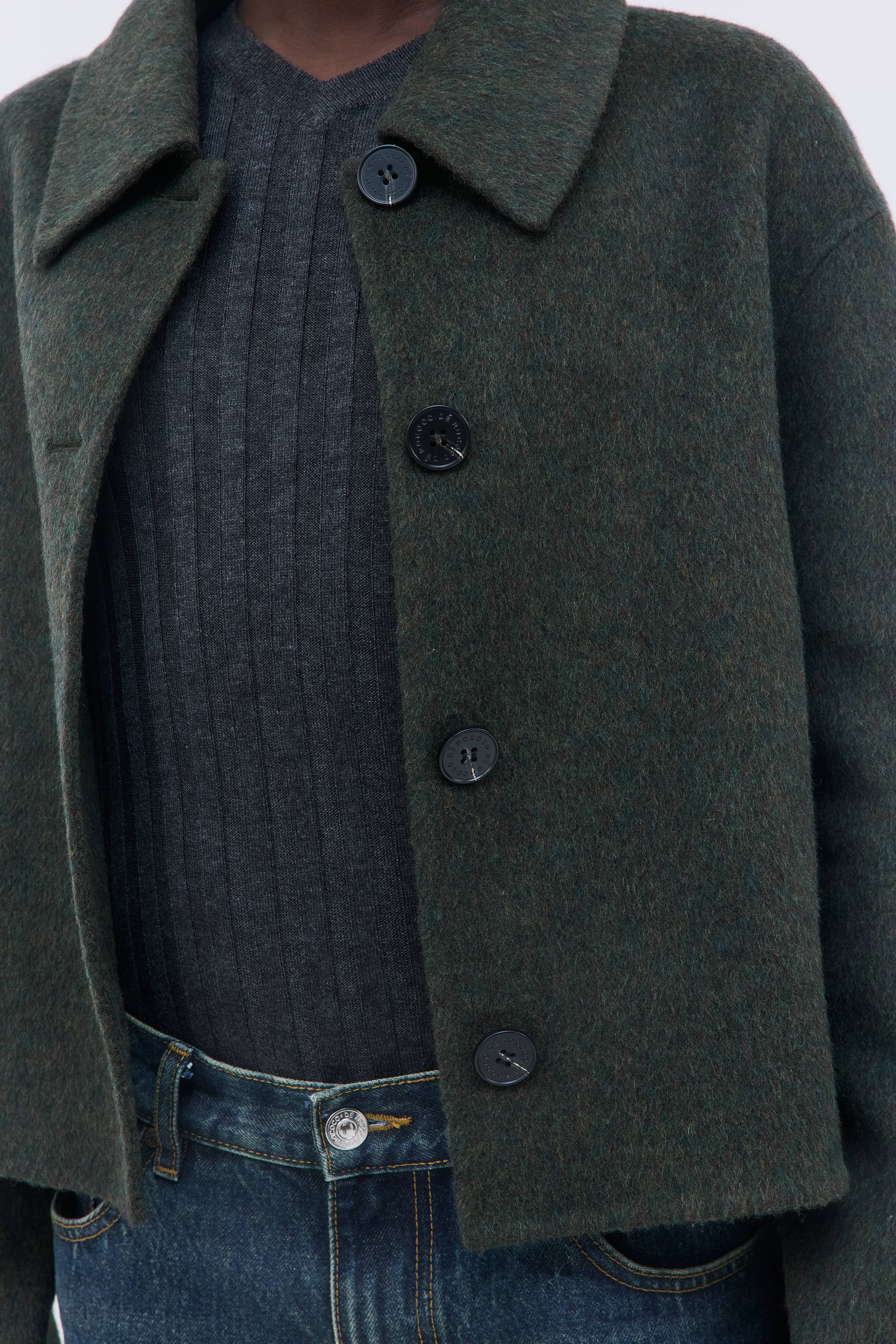 Released as part of our limited edition winter collection; Elevate your fall wardrobe with our new double wool cropped coat. Relaxed fit, short, double wool jacket. Classic pointed collar. Tonal logo engraved buttoned closure. Unlined. Pair it with our timeless No.8| High Waisted Wide Leg Denim and our sleek Jackie Sunglasses for a sophisticated, elevated look.