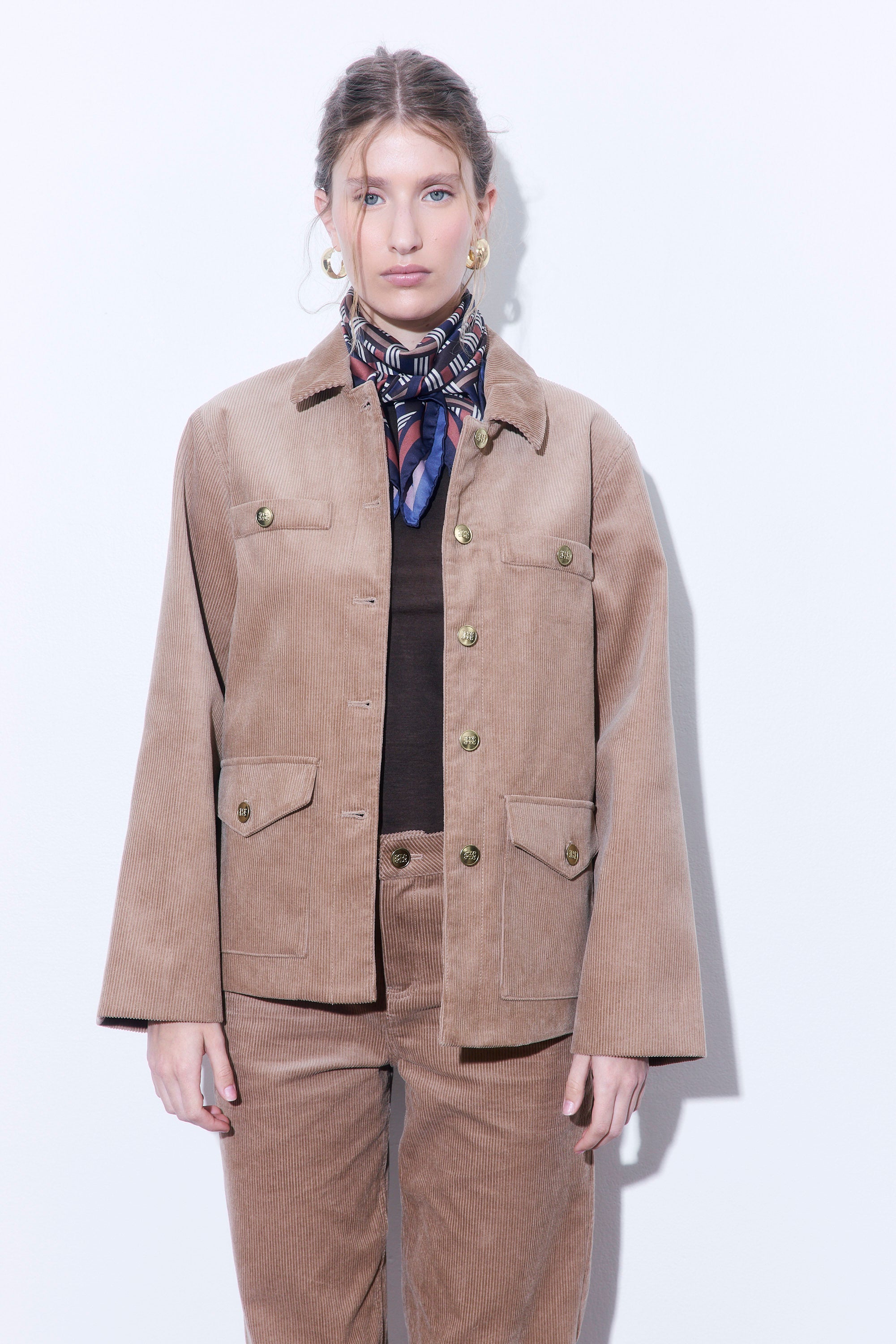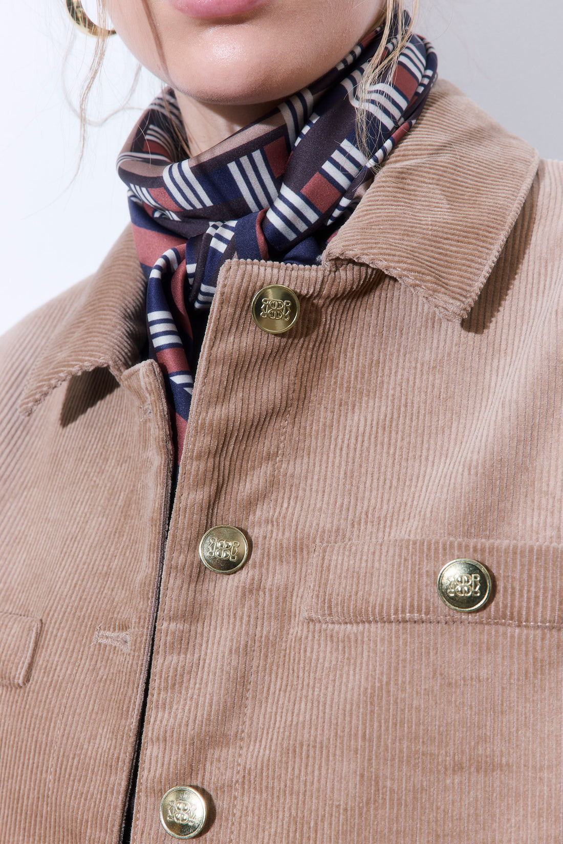 A modern interpretation of a wardrobe classic. Curdoroy jacket. Fits true to size. Detailed with logo embossed gold buttons. Designed with two welt pockets at the chest, and two patch pockets at the bottom. Fully lined. Style it with our new Corduroy Wide Leg Pants and iconic Oval Sunglasses for a refined, polished look.