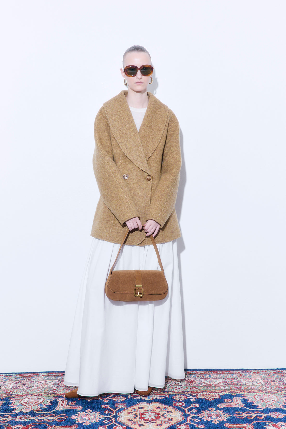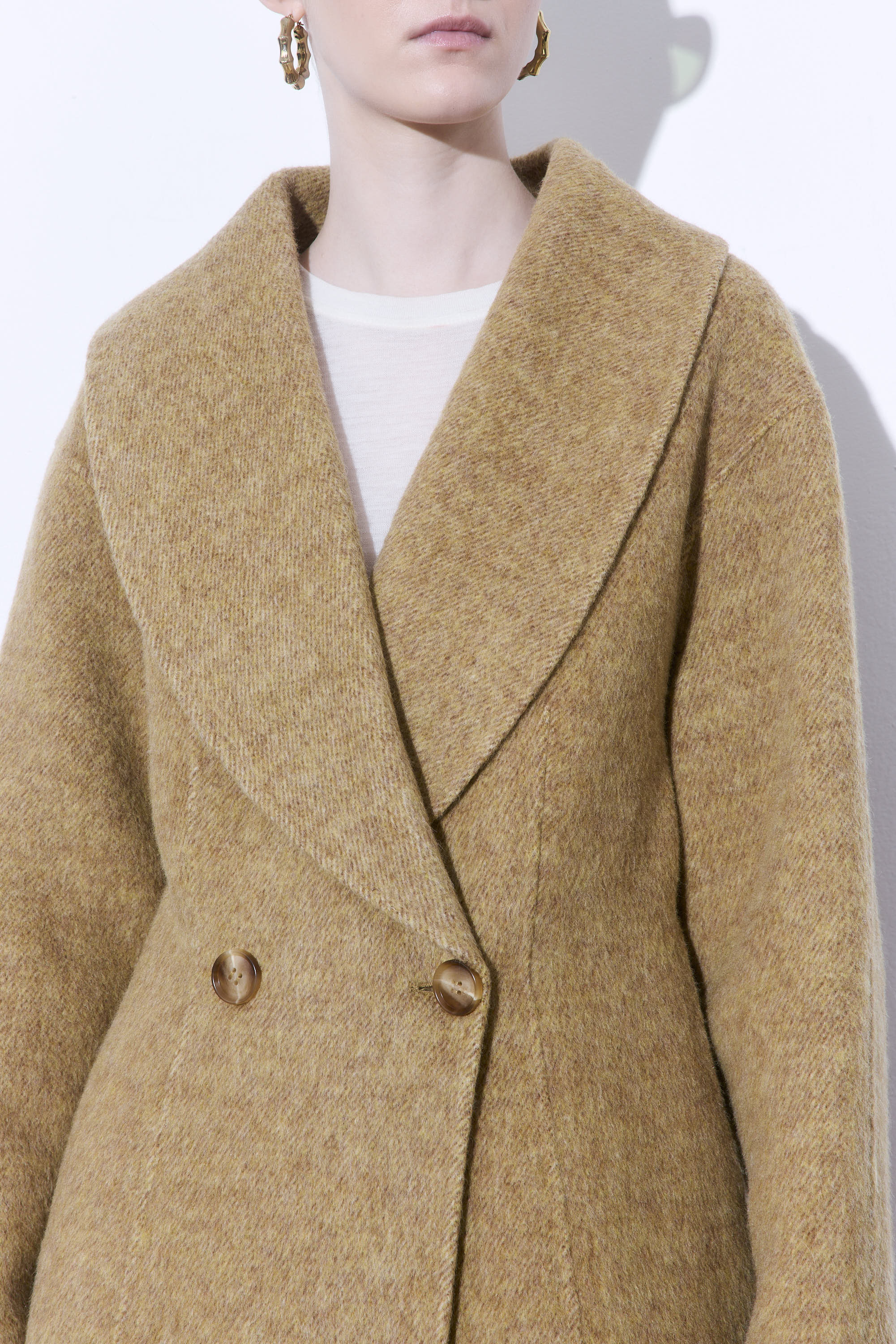 A standout staple designed to elevate every look. Mid-length, double-breasted jacket in a double-faced wool blend, offering a soft yet structured hand feel. Clean, unlined finish with an hourglass silhouette. Showcasing a shawl neckline with tonal engraved buttons, crafted to fall elegantly over the hips. Style with our timeless No. 18 Denim and iconic Rodika Tote Bag for an effortlessly refined look.