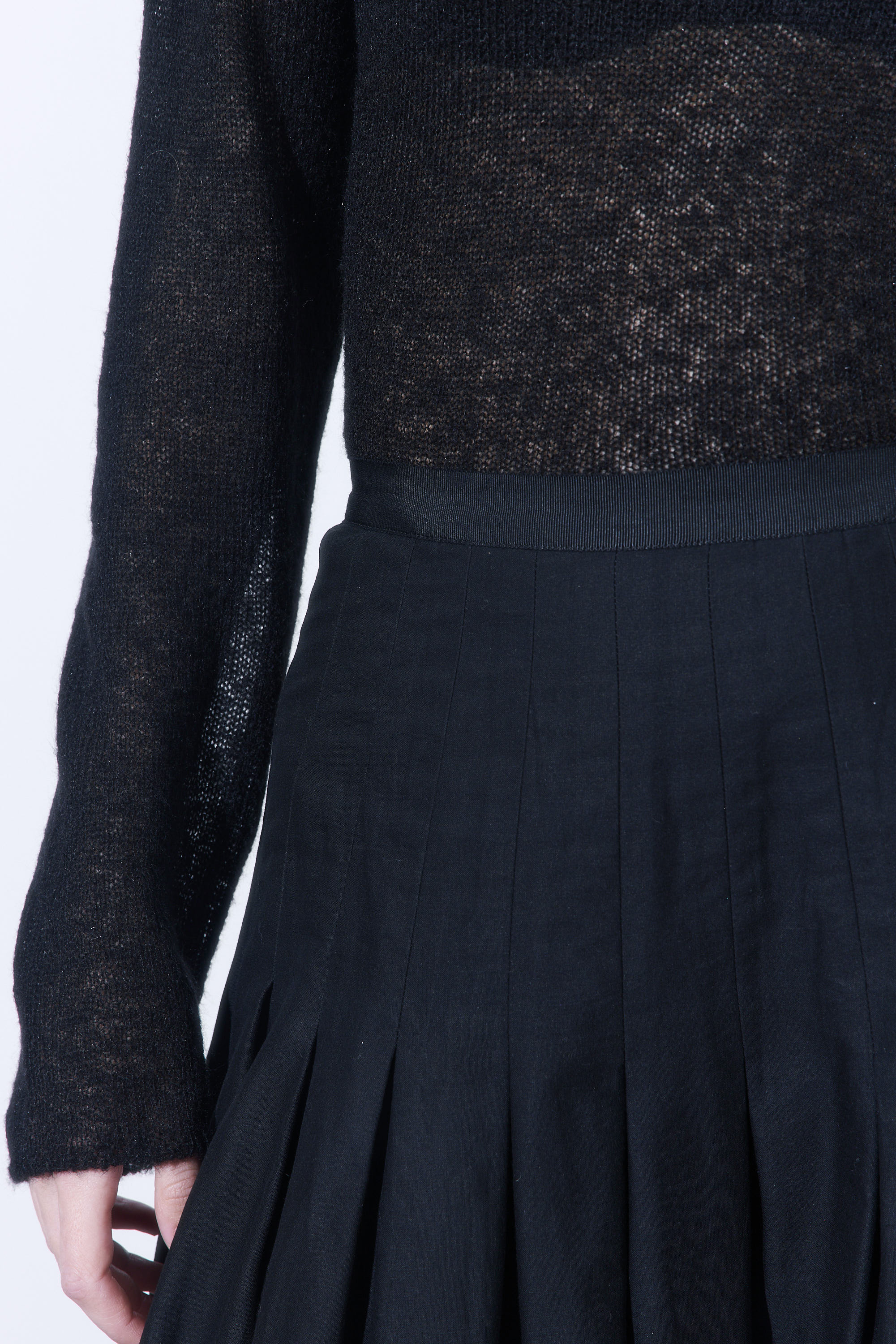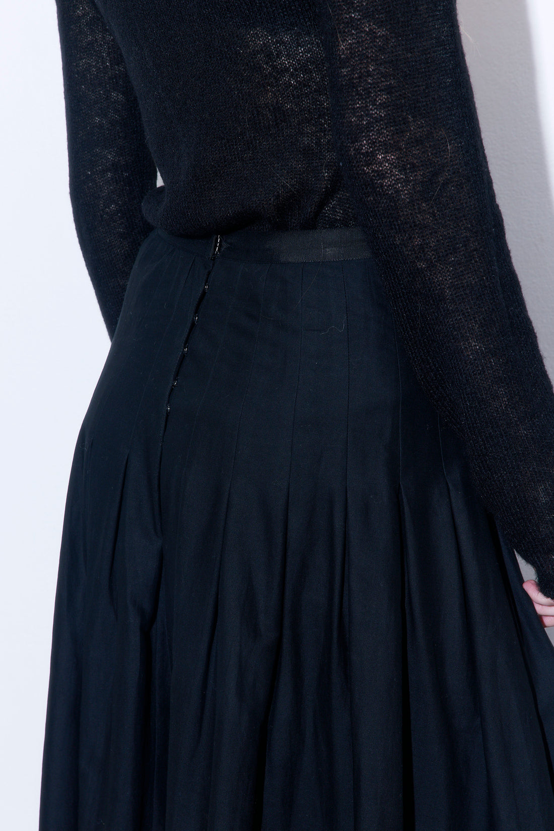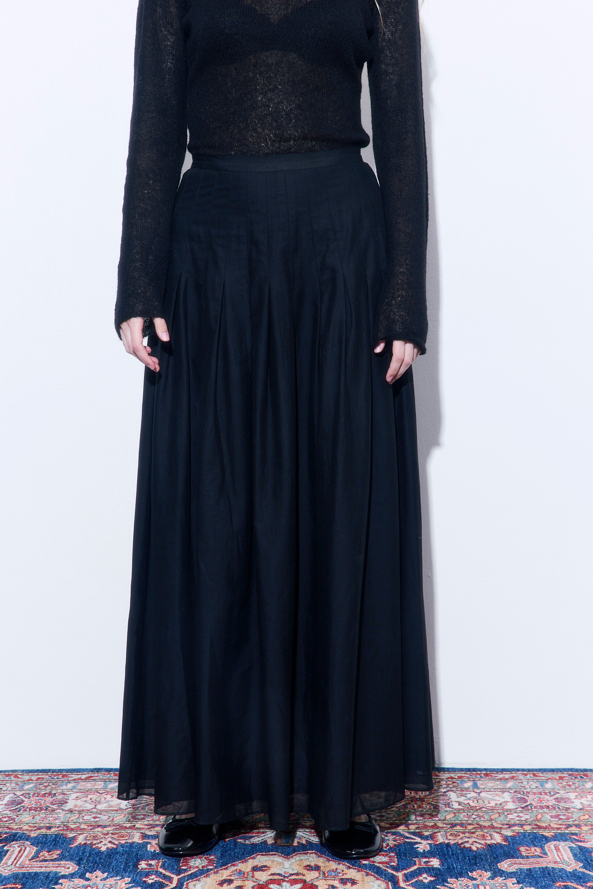 A modern take on a classic staple item. High-waist pleated skirt with a satin-finished belt and ribbon detial. Crafted in a rich, layered fabric for volume and dimension. Featuring two layers. Upper layer is sheer. Lined interior. Ankle length. Pleats are closed to the hip and open toward the hem. Secured with a hook and snap closure. Tonal embroidered logo at the side back. Style it with our iconic Oval sunglasses and timeless Sheer Baby Tee for an elegant look.