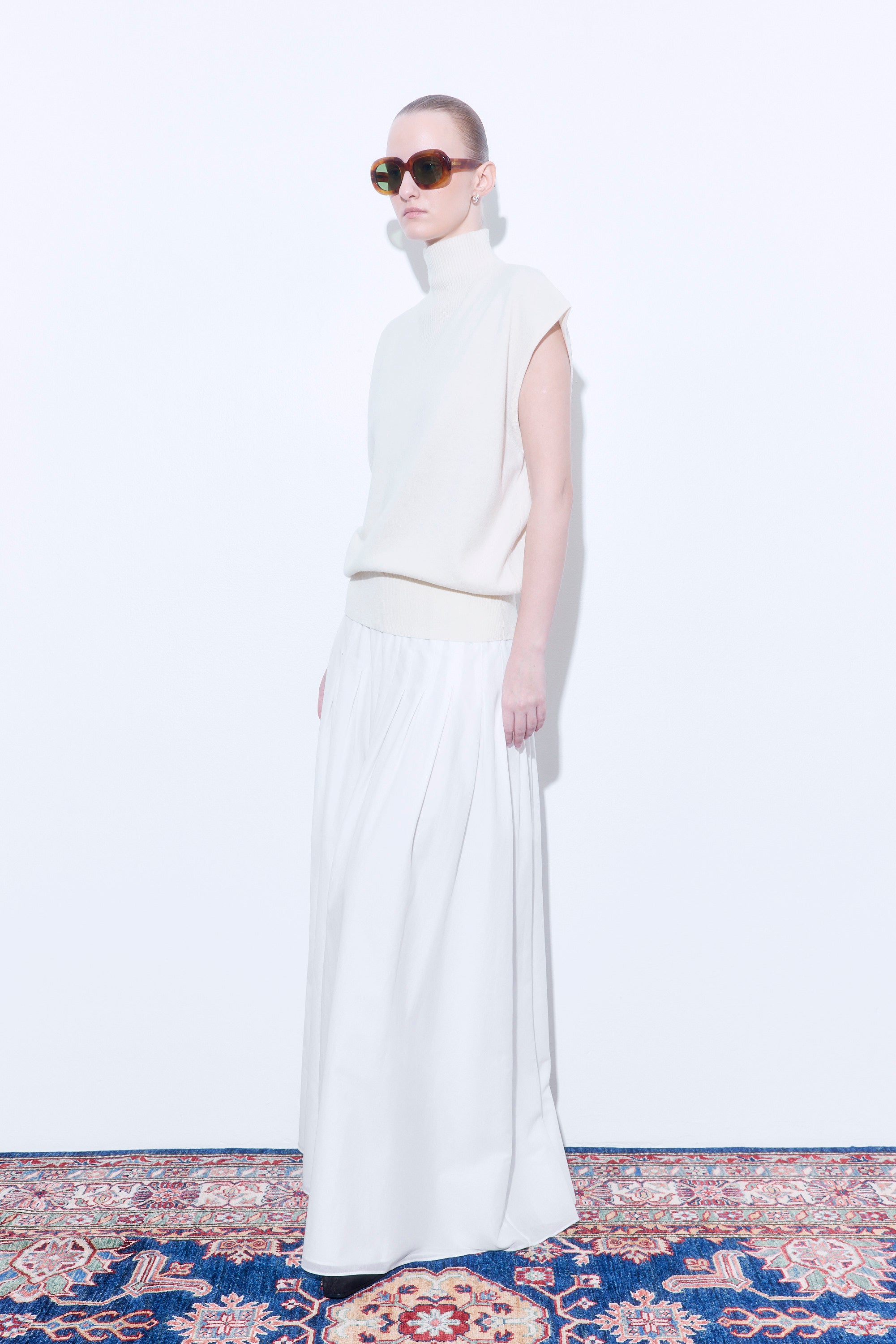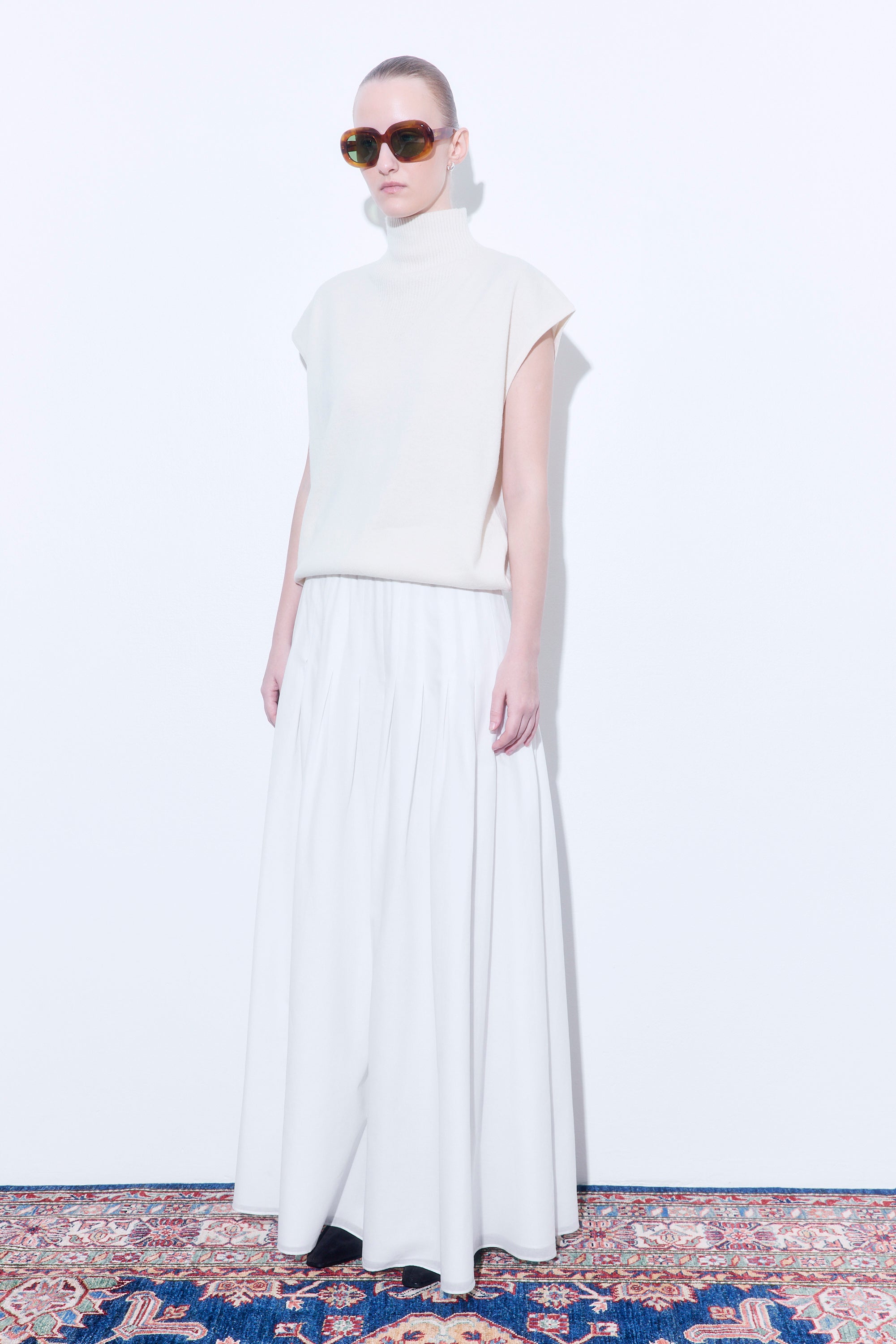 Your go-to piece for crisp mornings and effortlessly cozy evenings. Oversized, sleeveless golf with a wide-rib V-neck detail. Fully fashioned. Wide hem cuff creating a ballooned silhouette. Dropped shoulders. Finished with tonal embroidered logo at the center back. Style it with our timeless Pleated Maxi Skirt and iconic Oval Sunglasses for an elegant look.