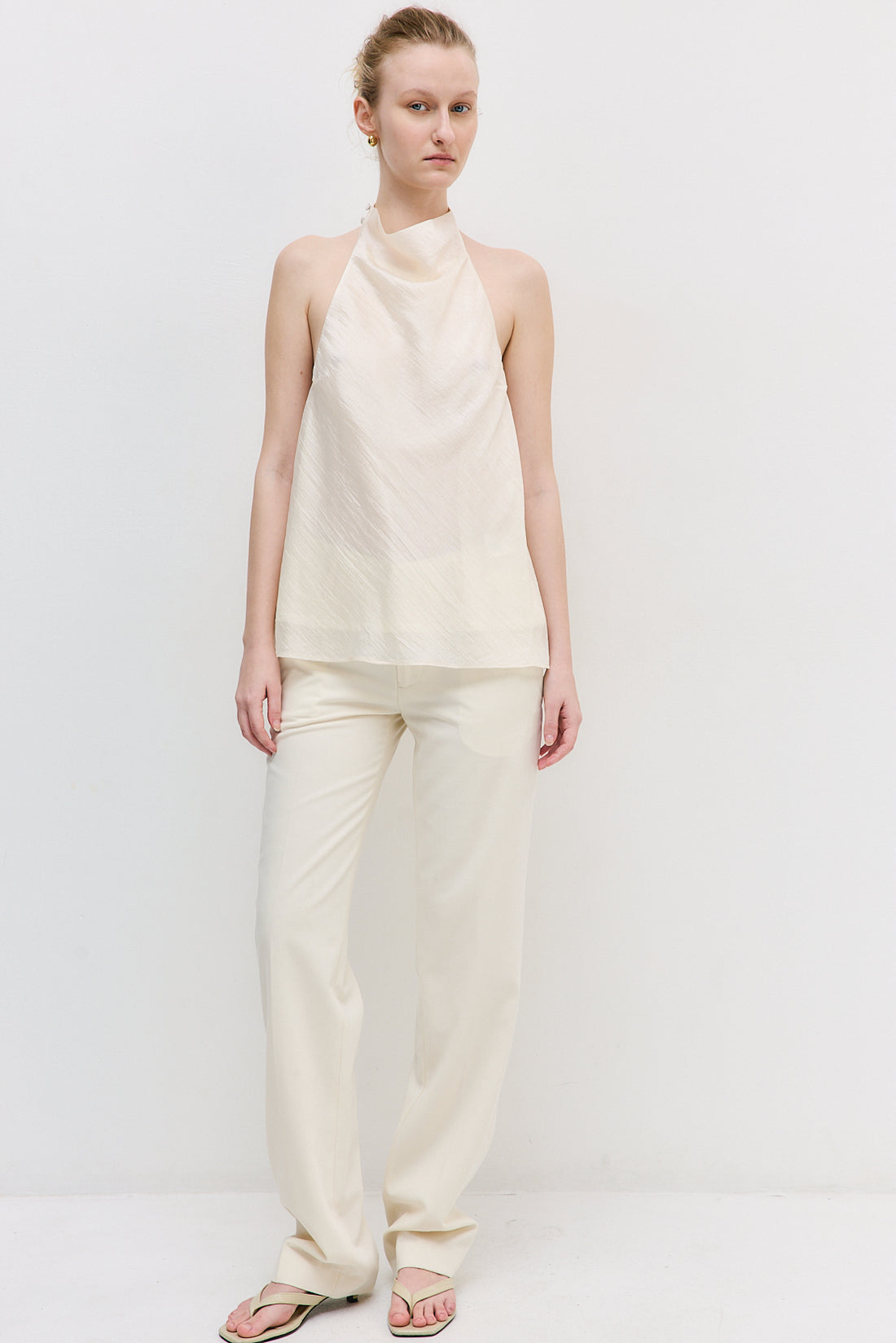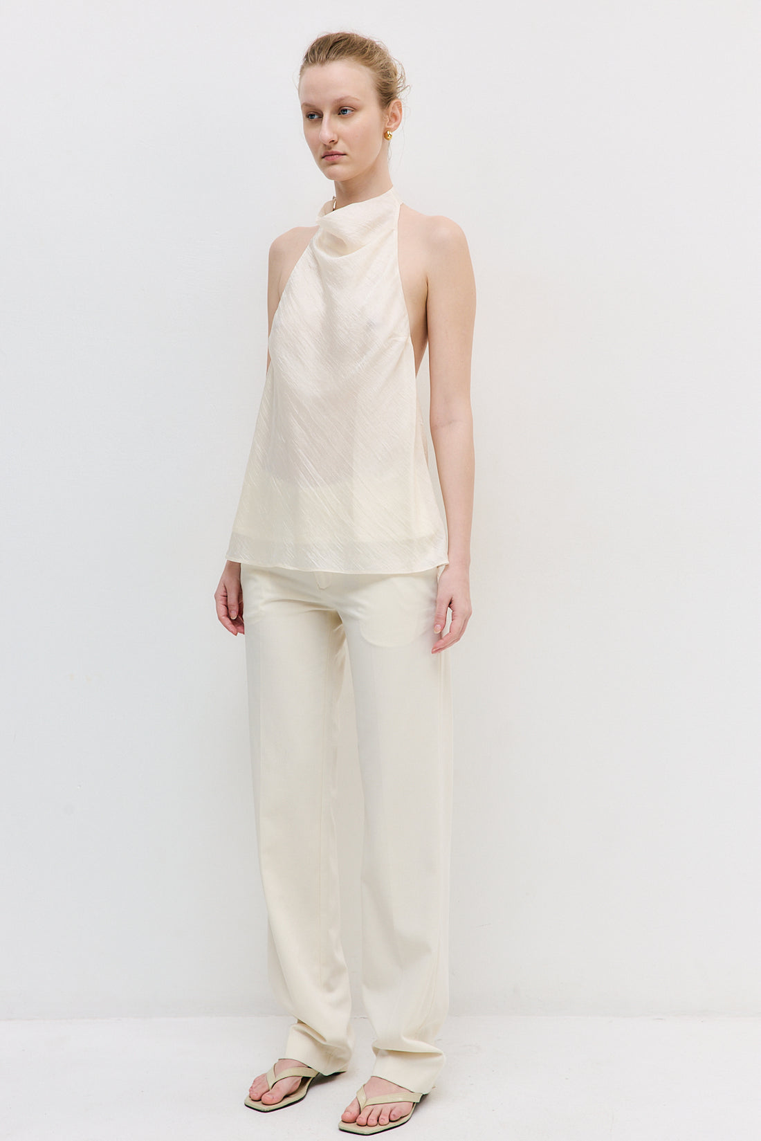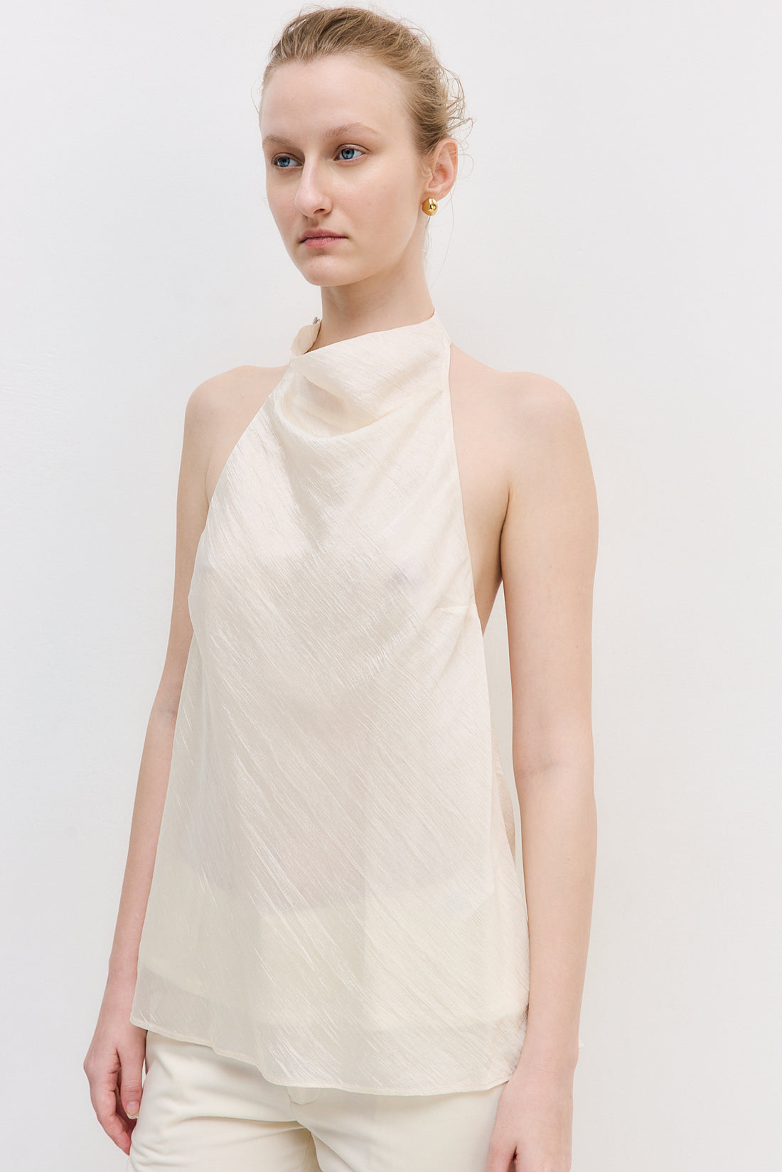 A refined statement piece with effortless movement, designed for both elegance and ease. Chiffon Drape Top. Double-layered. Slightly sheer. Featuring a soft, draped neckline, and two fabric-covered buttons at the neck closure. Loose fit with a wide hem and fluid, flowy silhouette. Style it with our iconic Jackie Sunglasses and our refined Mid Rise Bermuda Shorts for an elevated, everyday look.