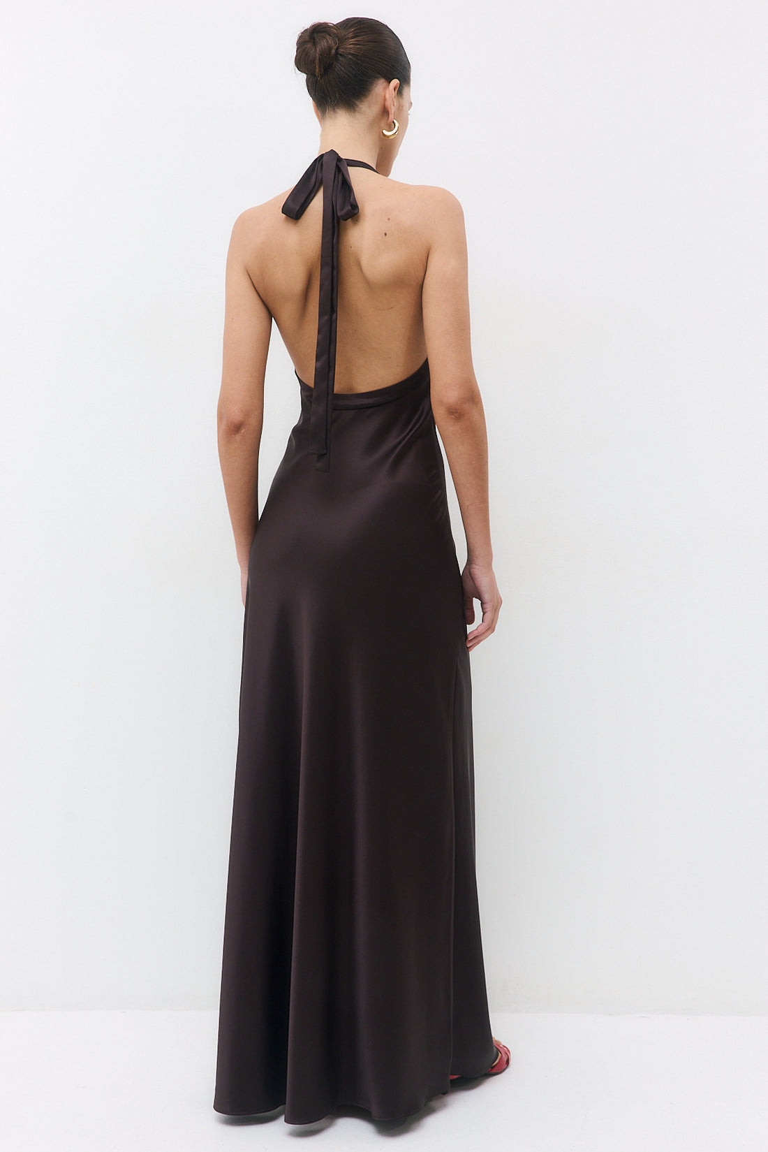 A refined silhouette desgined to flatter and flow. Satin Cup Maxi Dress. Doesn't crease. Designed with a gathered, lined cup detail at the bust. Featuring slightly wider straps with a halter tie at the neck and a subtly open back. Fitted through the waist, falling into a softly flared fit with a wide hem. Style it with our iconic Oval Sunglasses and our effortless Jackie Sunglasses for the ultimate event-ready look.