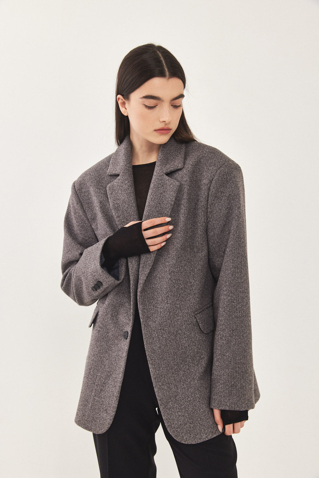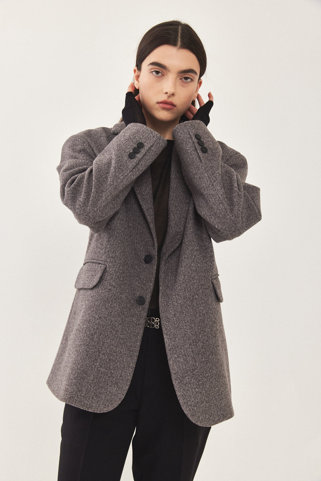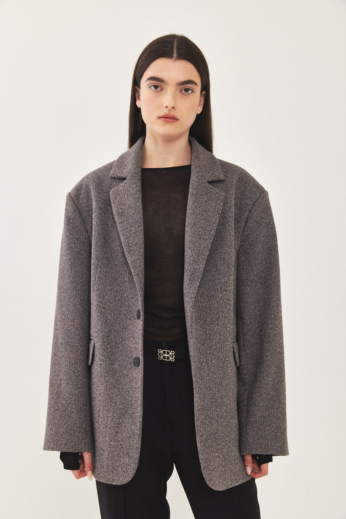A heavy weight boxy stiff blazer. Features a lapel collar and an embroidered logo. Long sleeves with pronounced shoulders with front buttoned closure. A tailored overcoat you wear with a matching color micro mini skirt.
