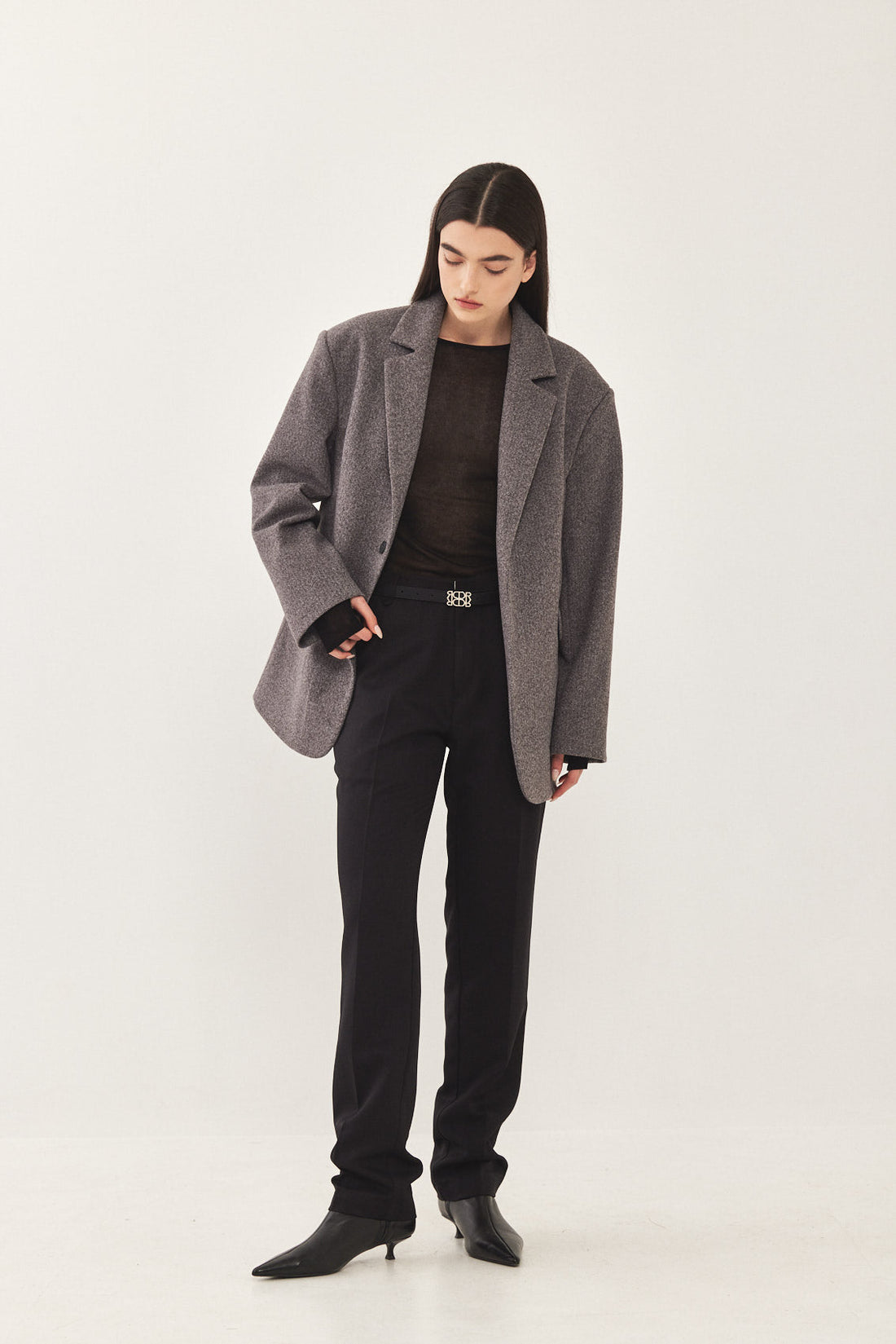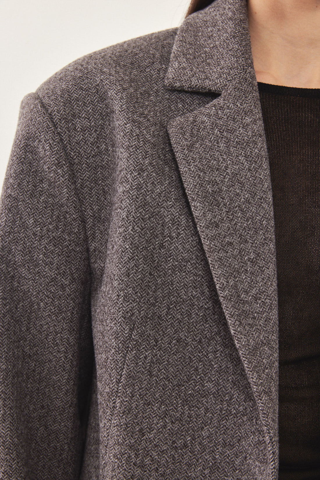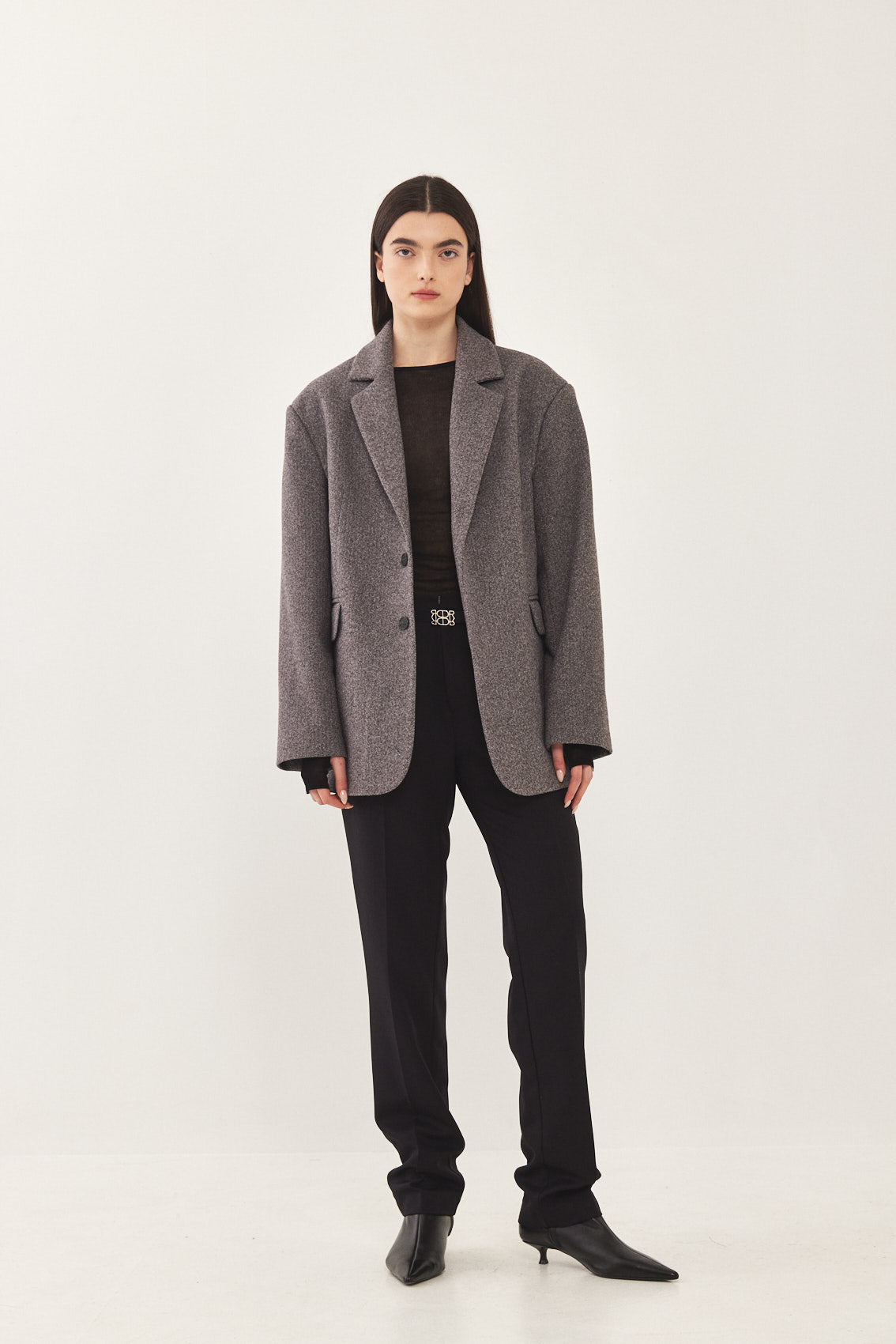 A heavy weight boxy stiff blazer. Features a lapel collar and an embroidered logo. Long sleeves with pronounced shoulders with front buttoned closure. A tailored overcoat you wear with a matching color micro mini skirt.
