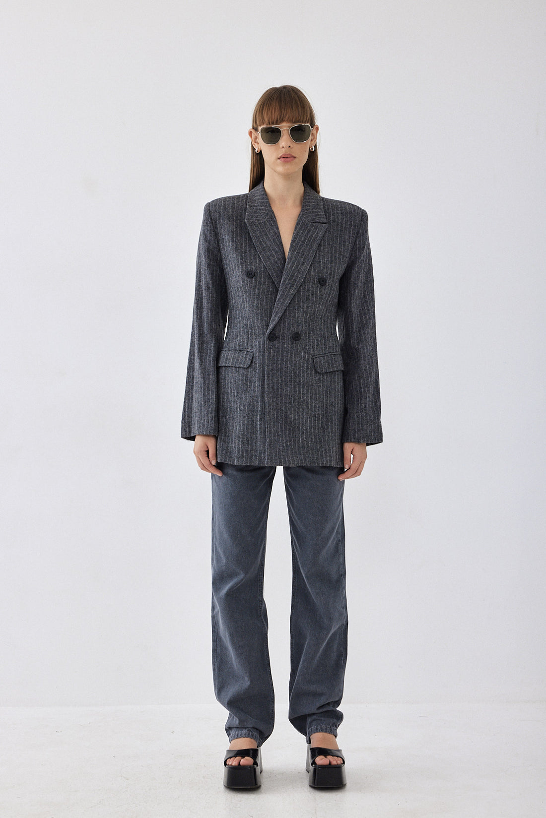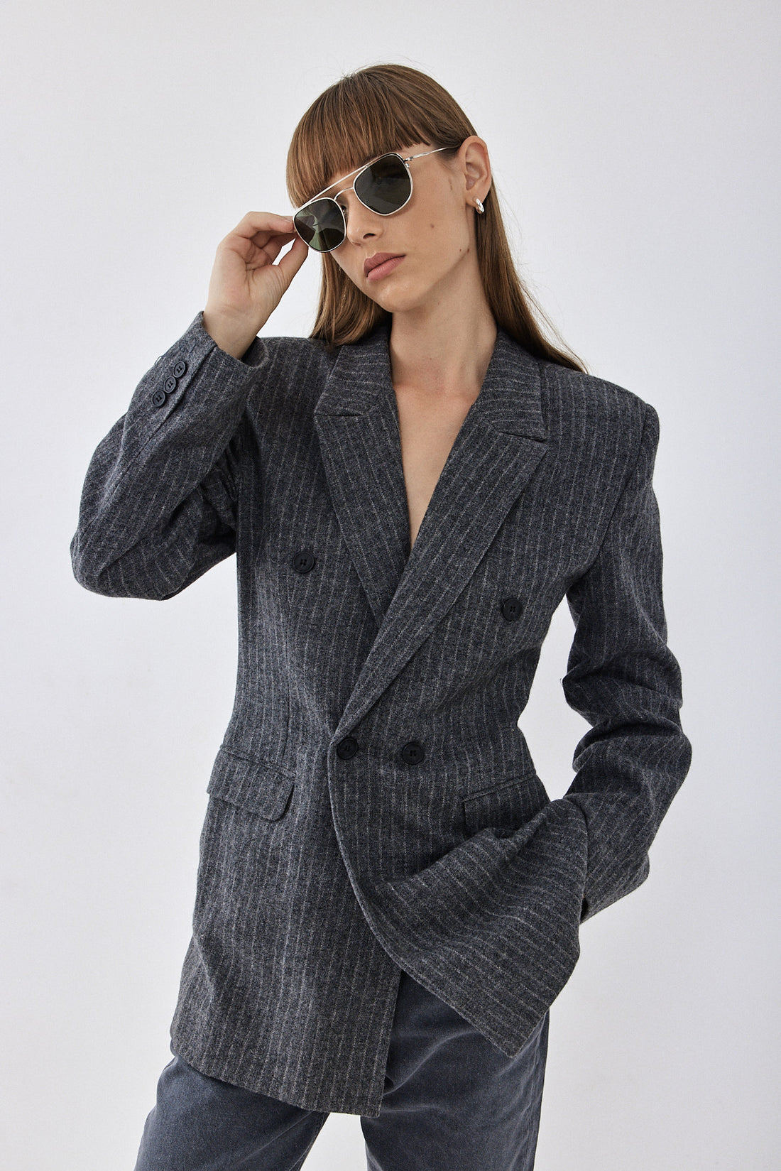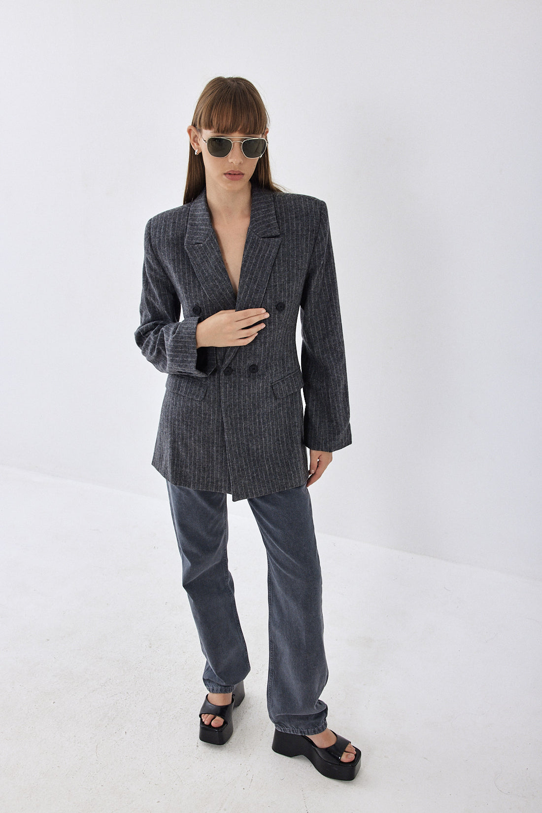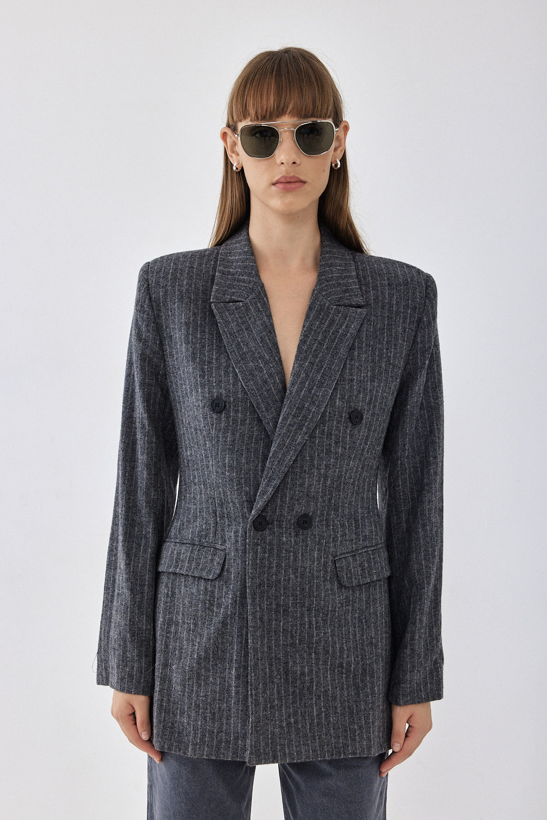 A blended wool blazer with a fitted waist silhouette. Featuring a relaxed fit. Fully lined. Double-breasted front and internal shoulder pads. Style it with your favorite denim and a pair of kitten boots for the perfect look transcending seasonality.