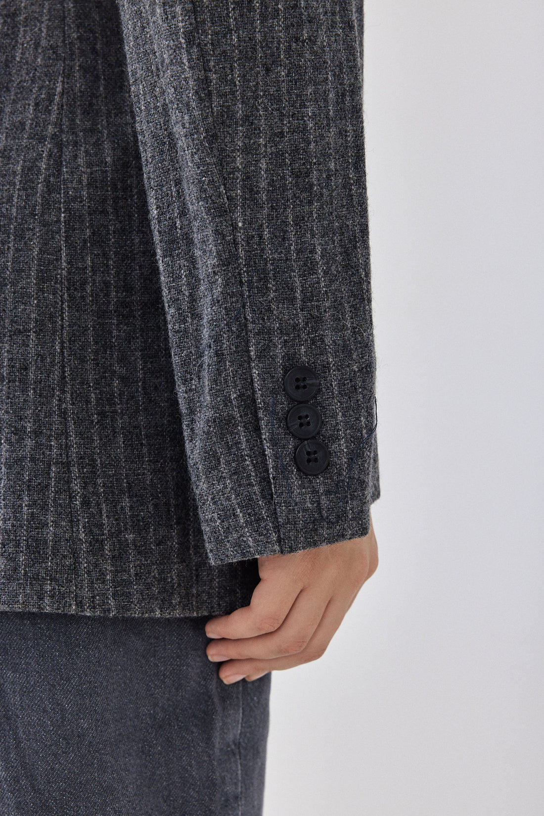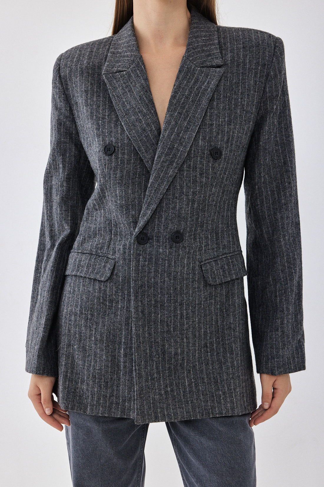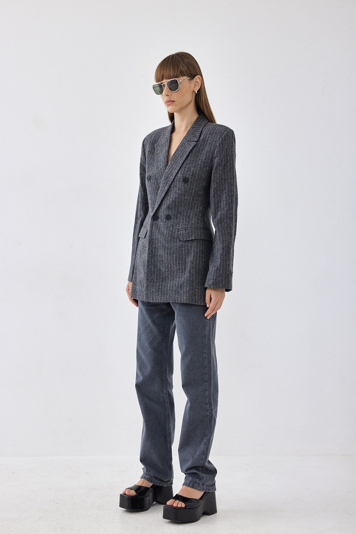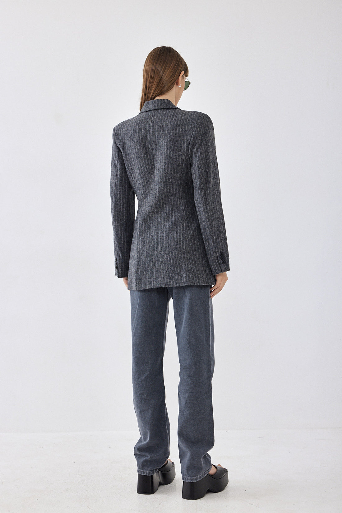 A blended wool blazer with a fitted waist silhouette. Featuring a relaxed fit. Fully lined. Double-breasted front and internal shoulder pads. Style it with your favorite denim and a pair of kitten boots for the perfect look transcending seasonality.