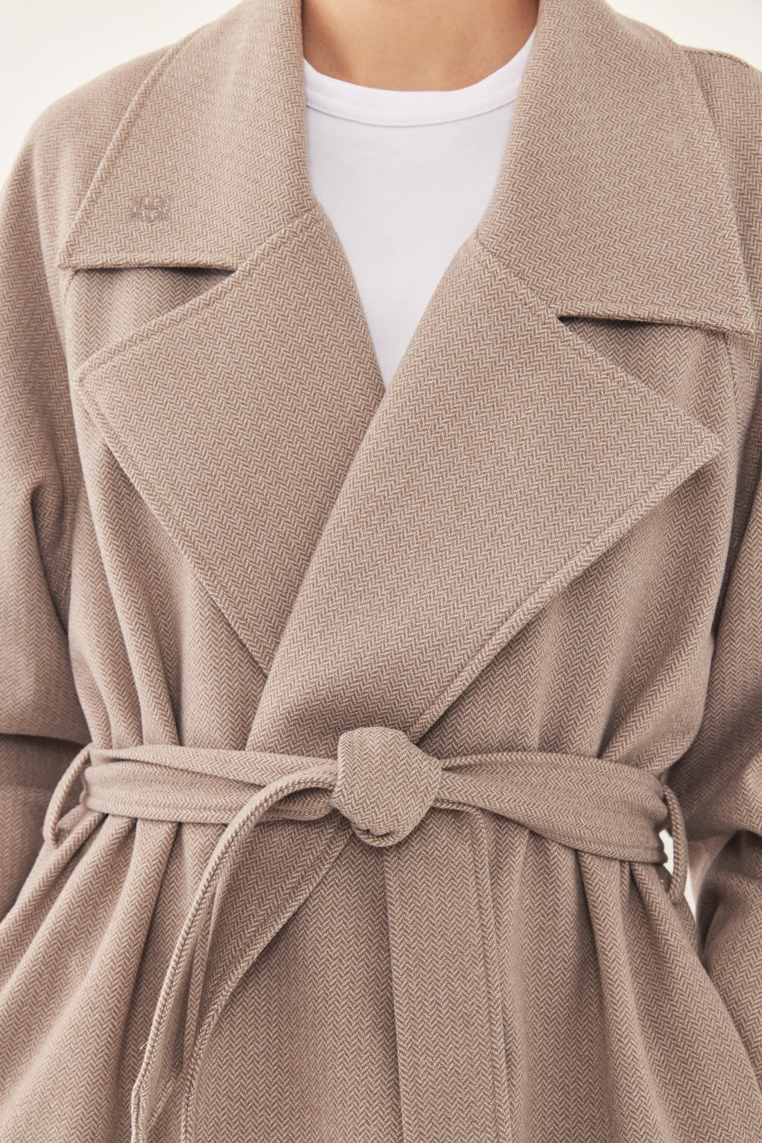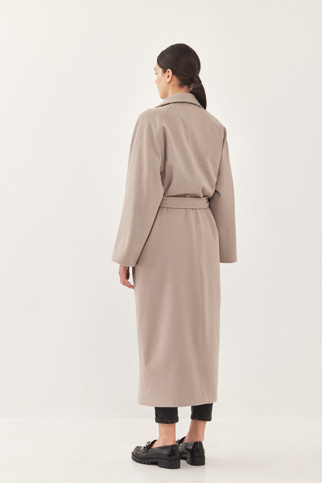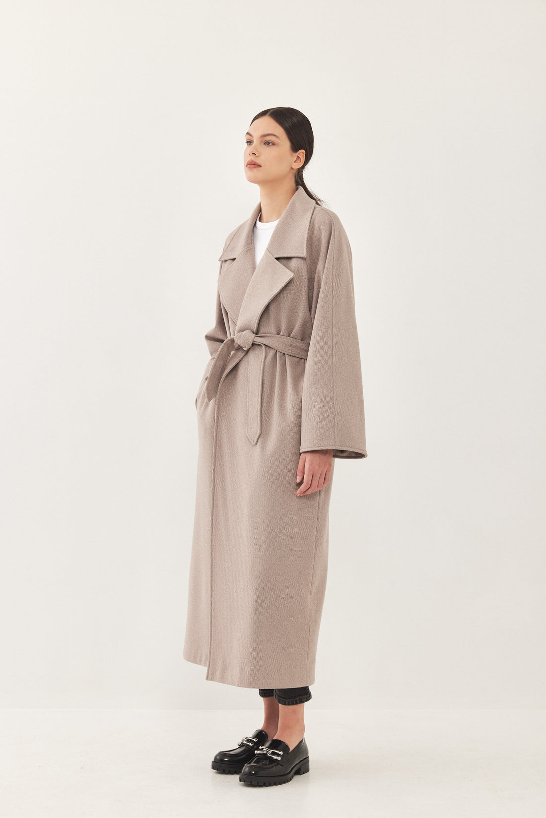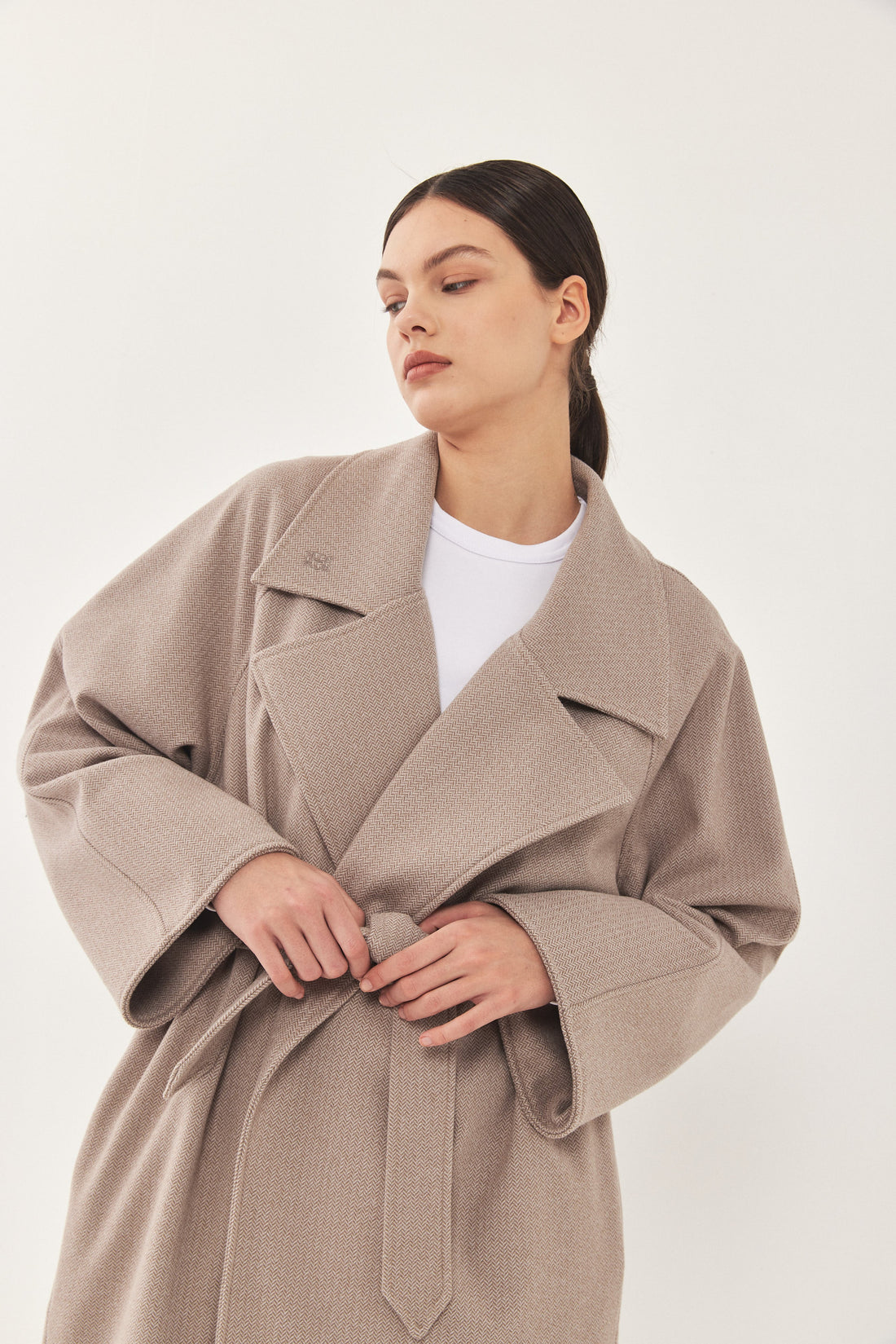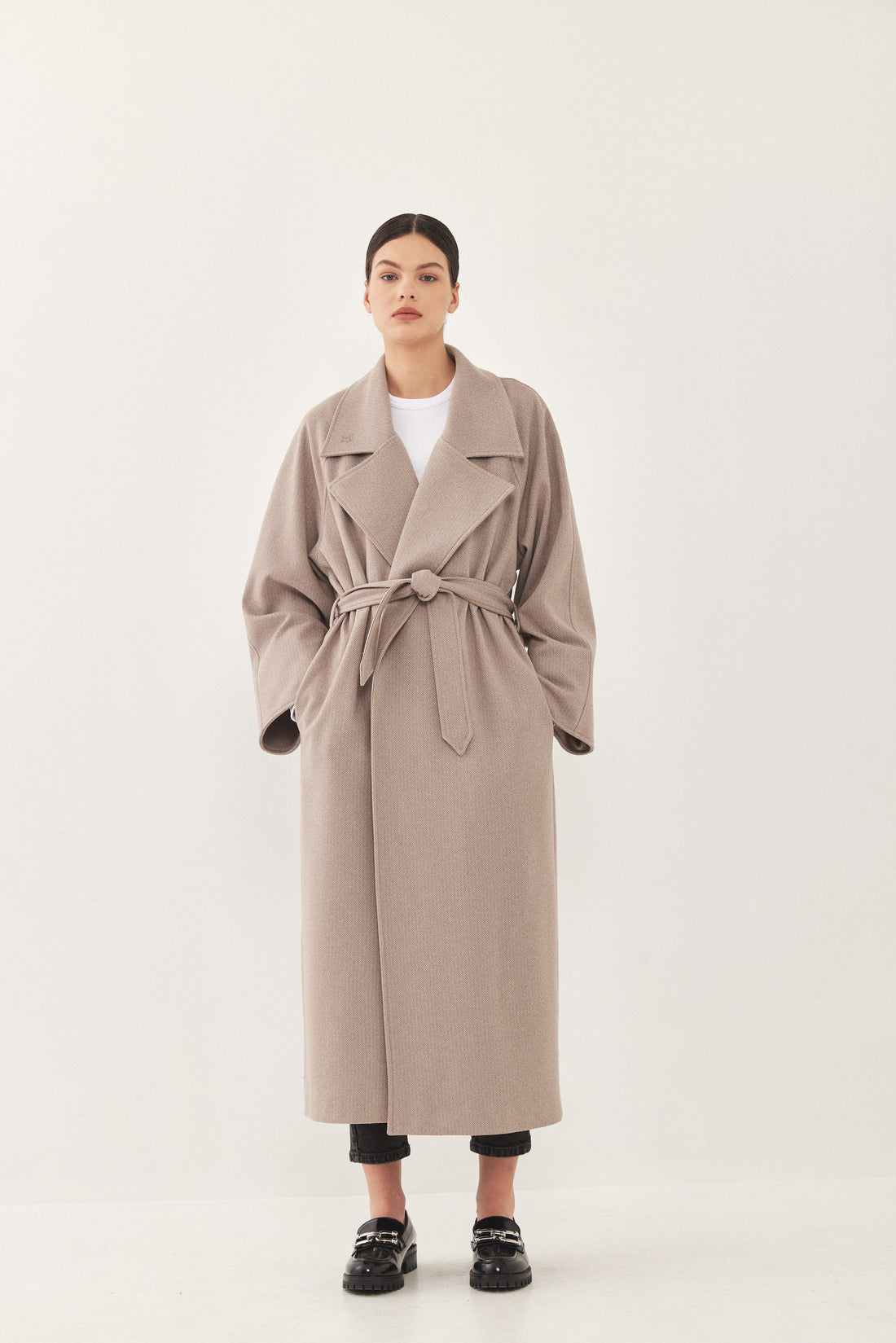 A heavy weight longline rode coat. An oversize fit with long voluminous sleeves and side pockets. Features a lapel collar with an embroidered logo. Comes with a detachable waist belt. A cozy worm coat you can wear over any outfit.