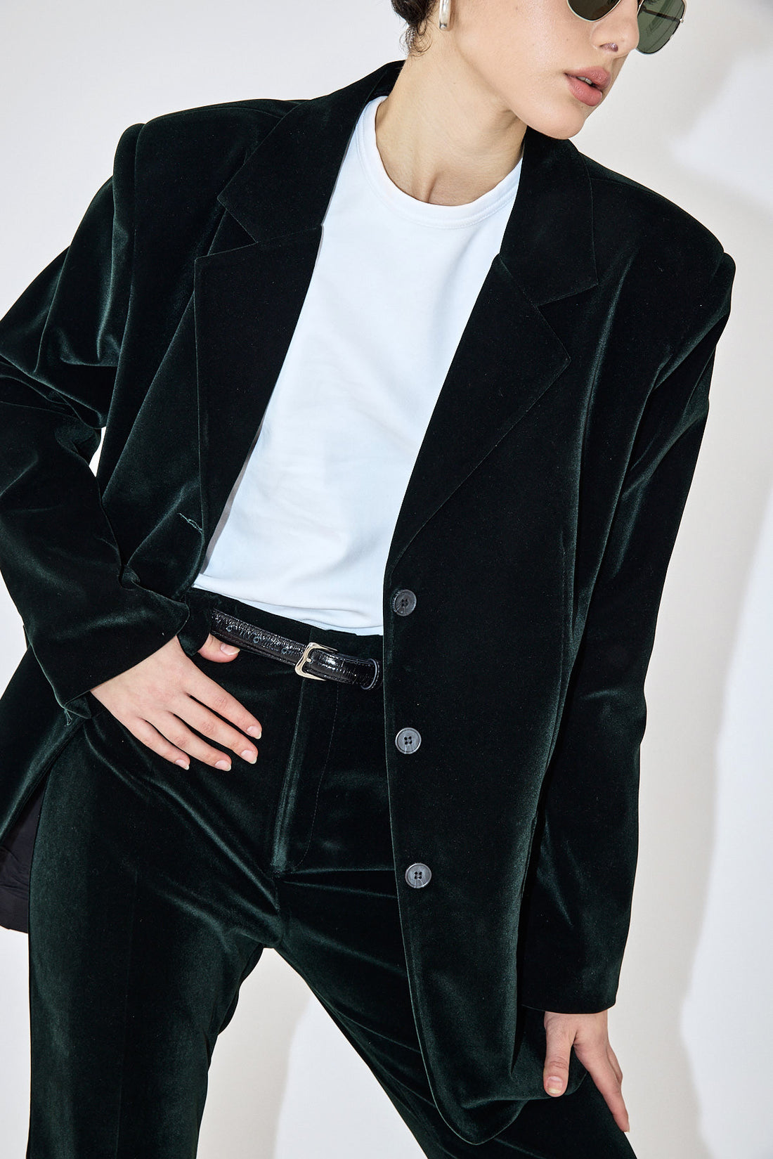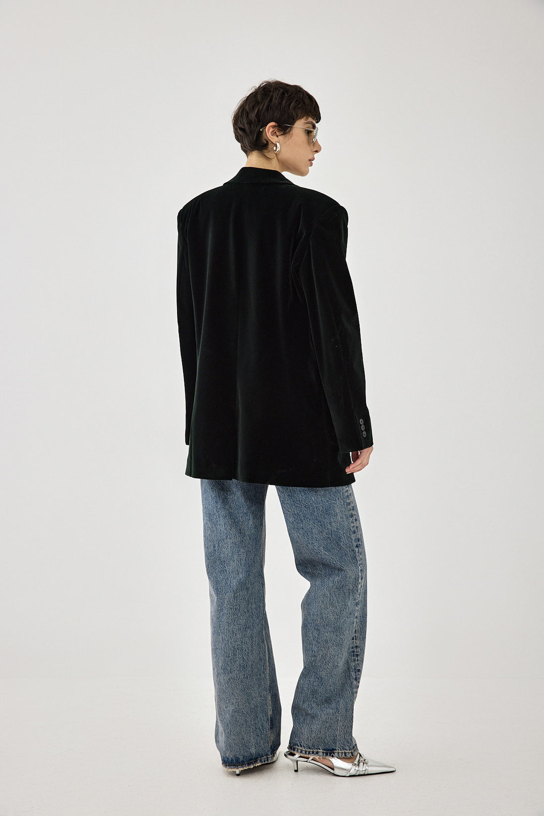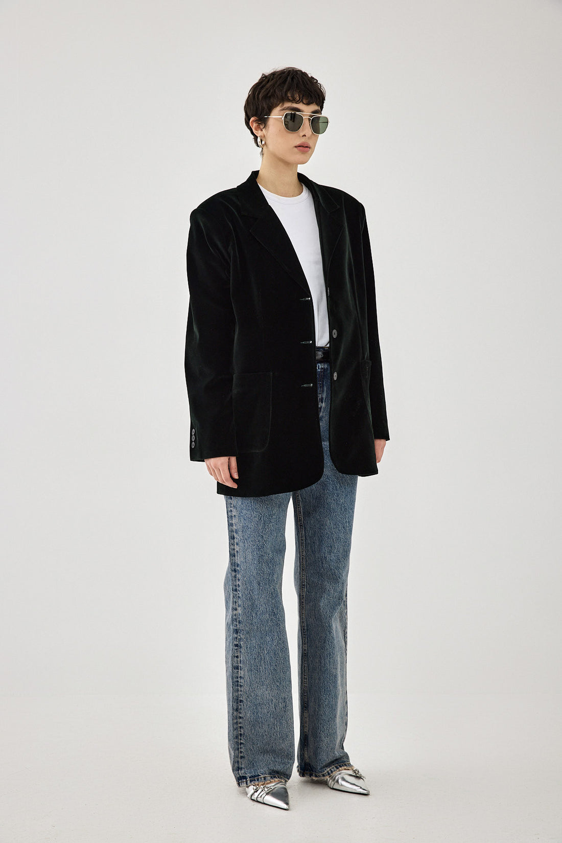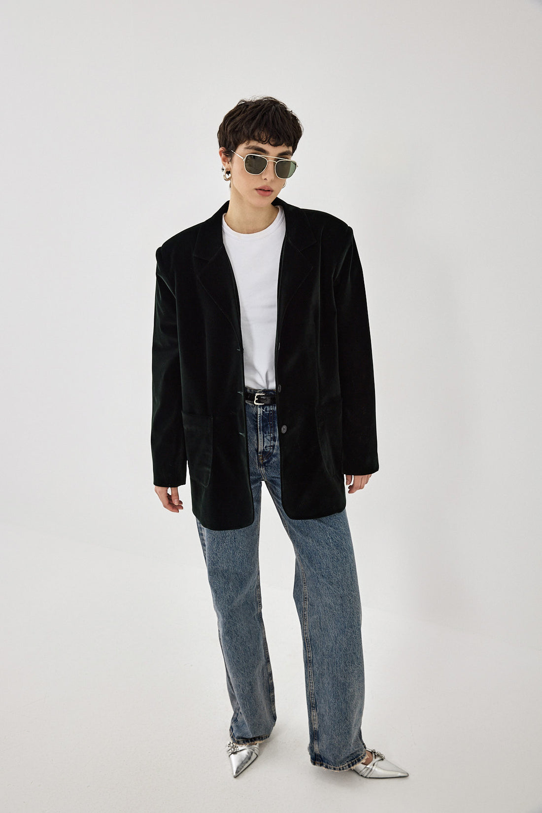 A new look for our oversized blazer. Rigid velvet material. Masculine cut blazer, oversized fit. Features a lapel collar. Three buttons on the front. Long sleeves with pronounced shoulders.