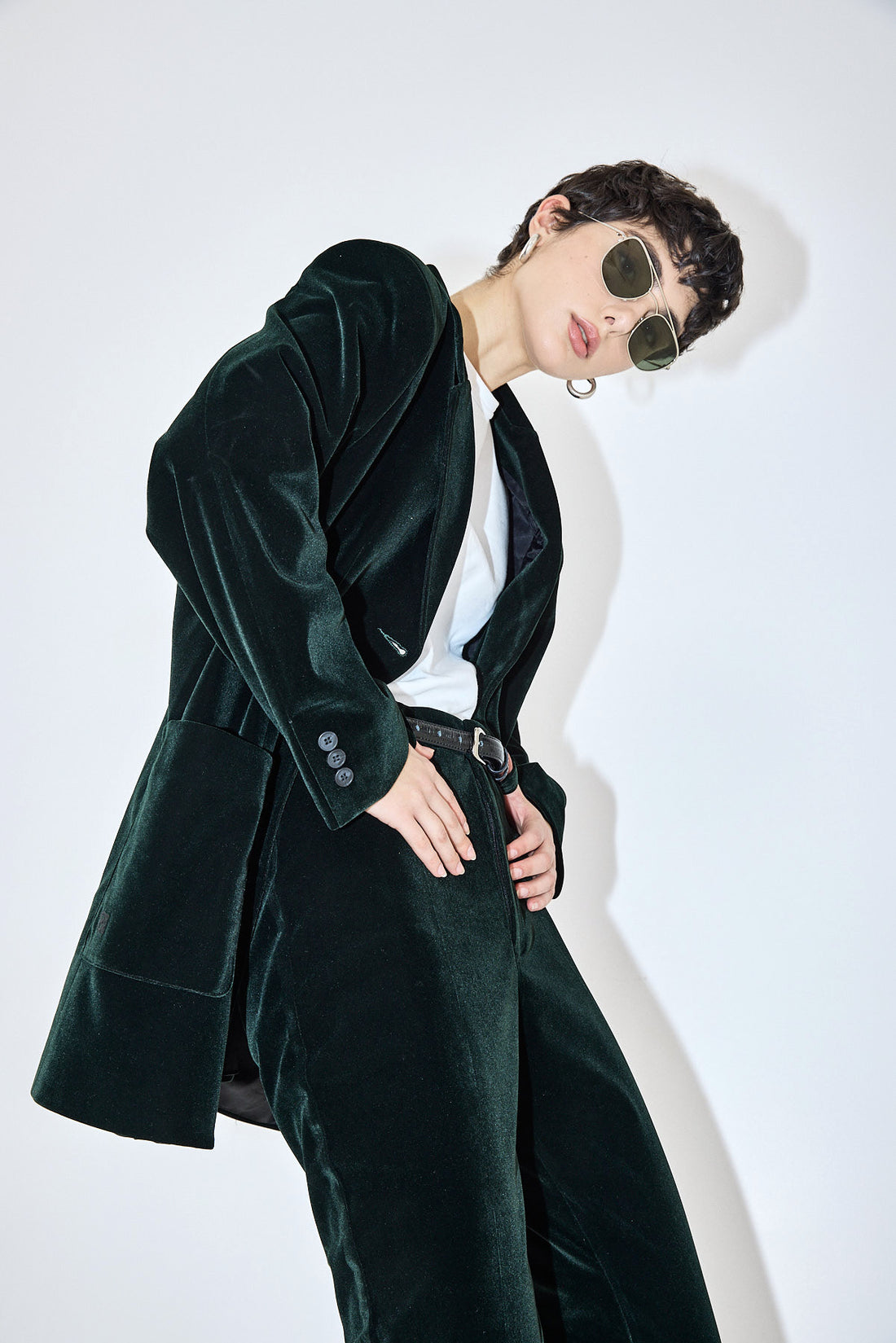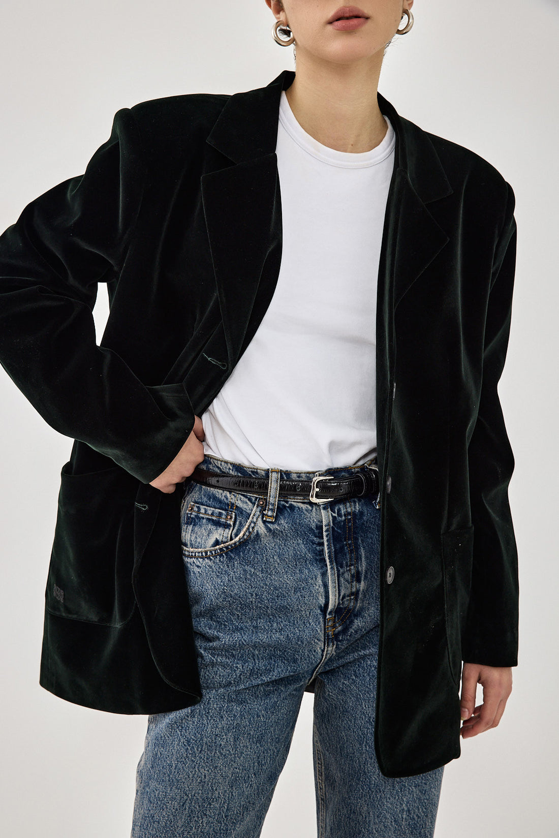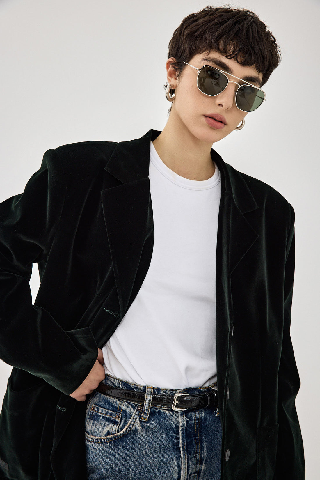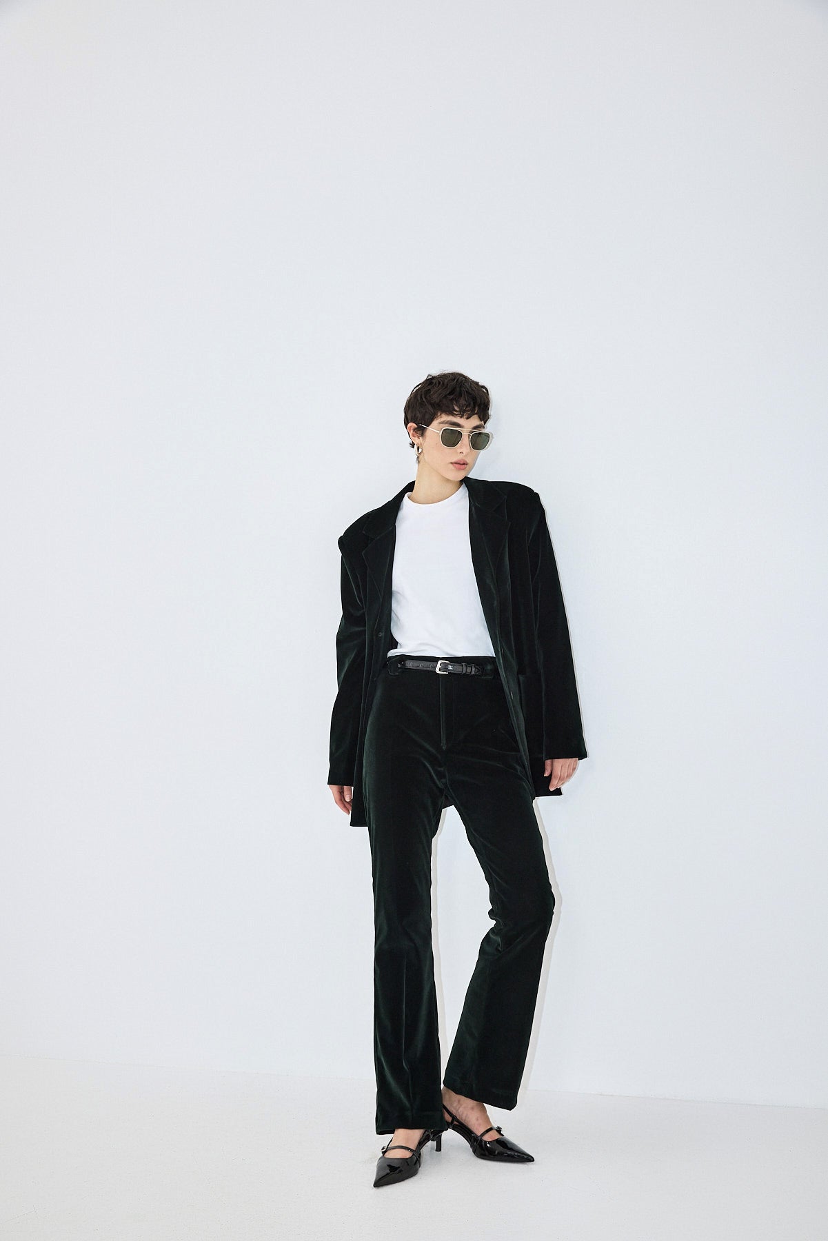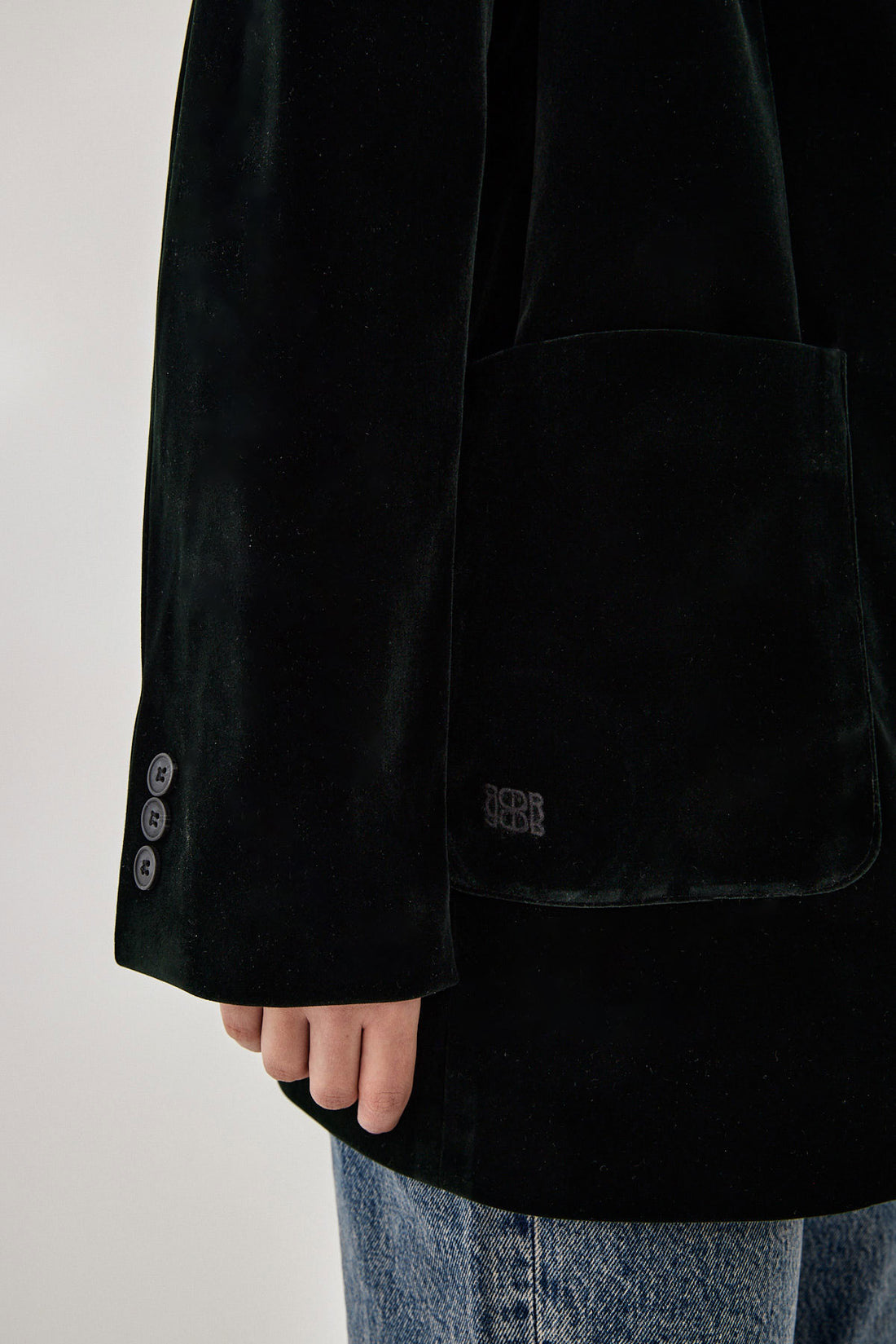 A new look for our oversized blazer. Rigid velvet material. Masculine cut blazer, oversized fit. Features a lapel collar. Three buttons on the front. Long sleeves with pronounced shoulders.