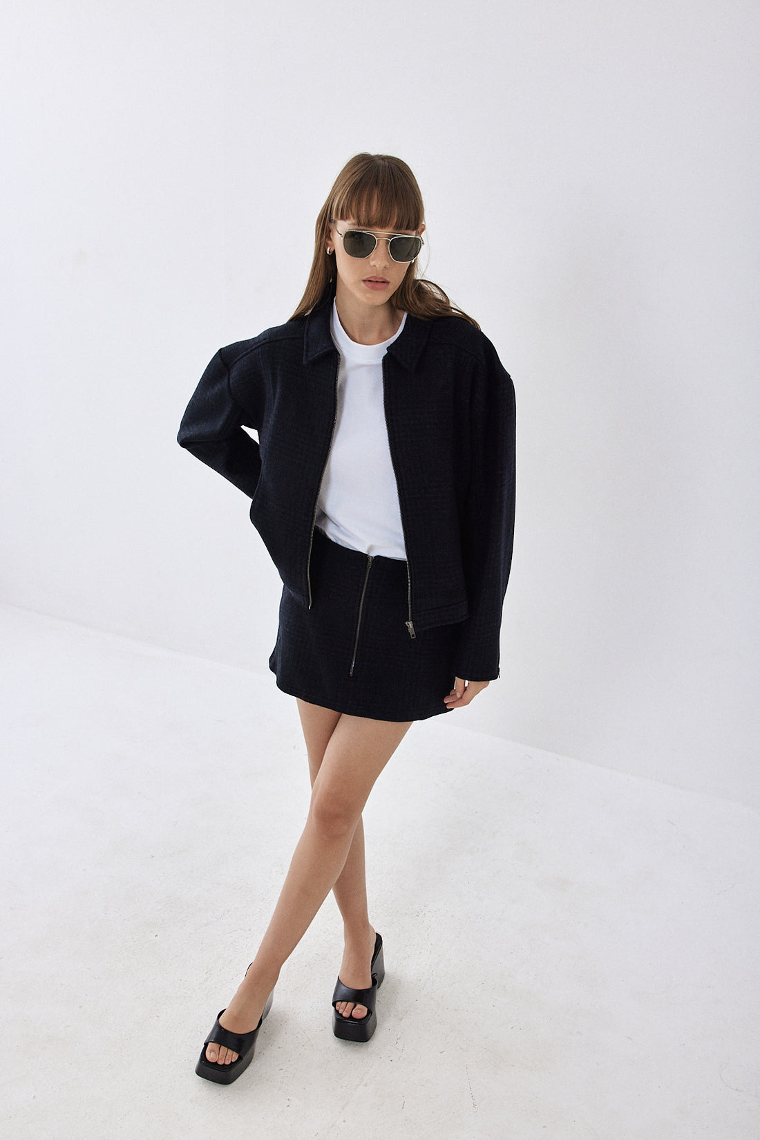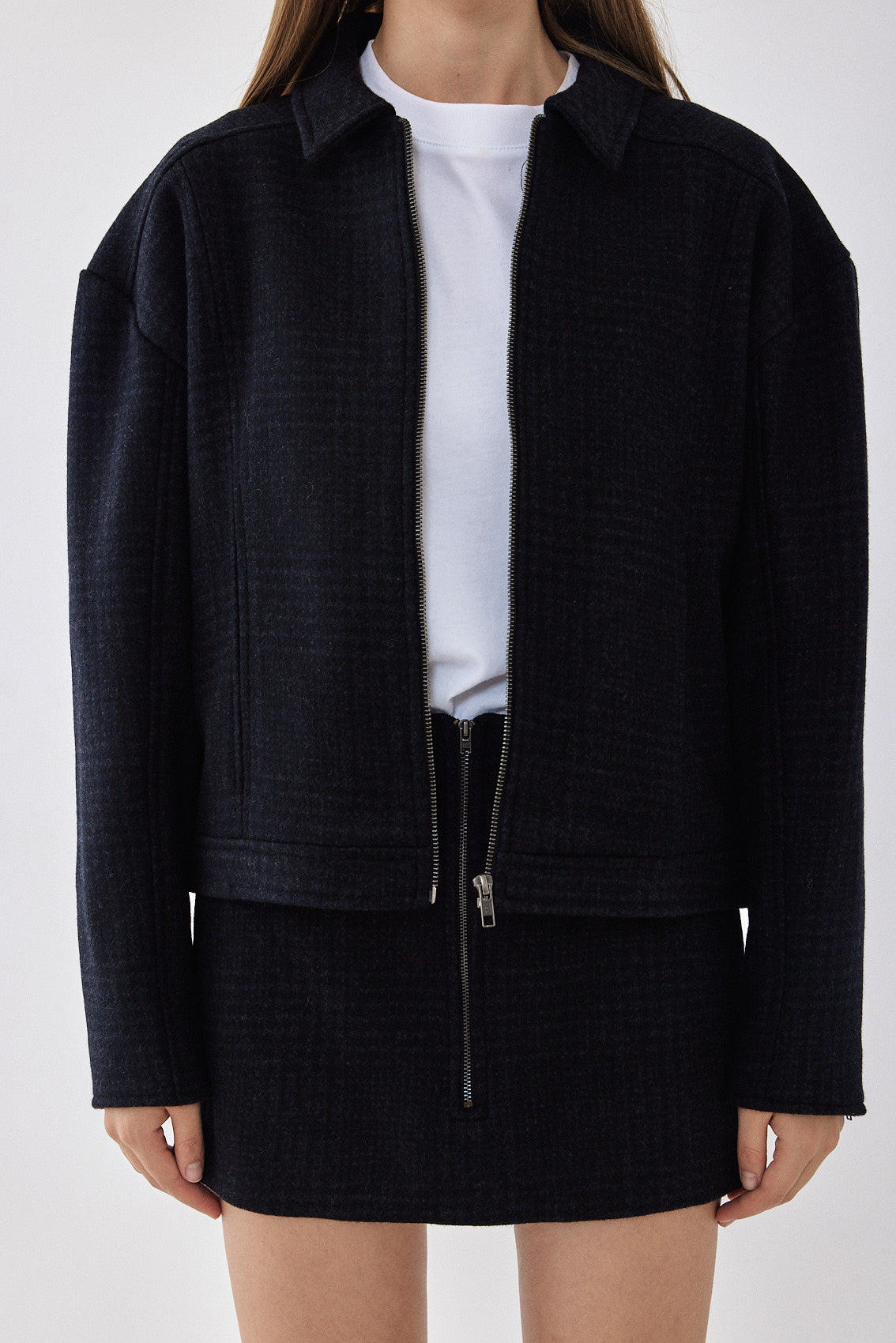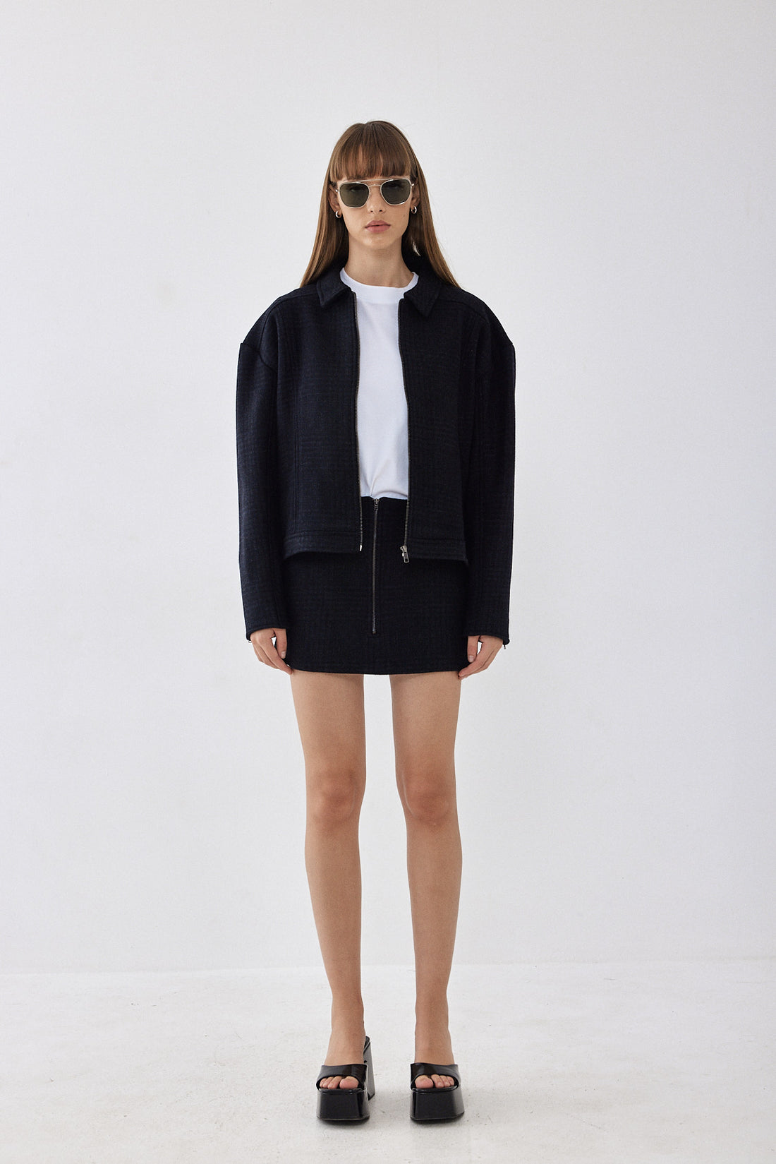 A utility inspired trucker jacket made of blended wool. With a zipper on the front and a delicate plaid pattern, this is the perfect statement jacket. Pair it with the matching zipped A line mini skirt and a pair of heeled boots.