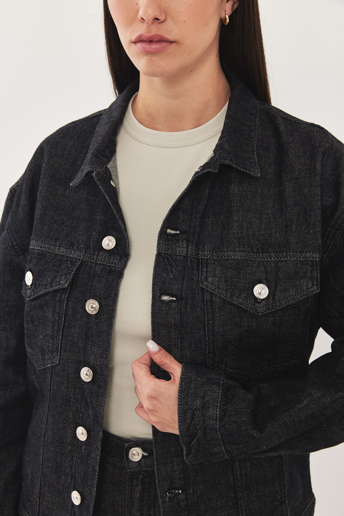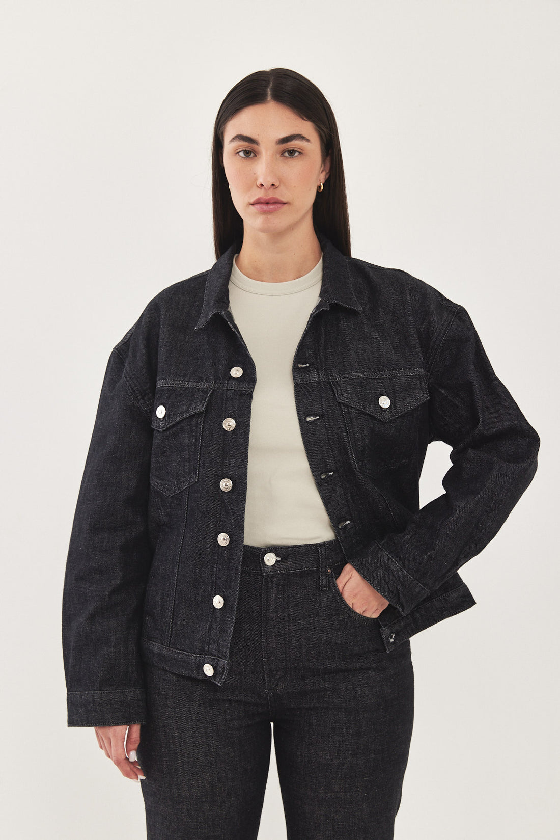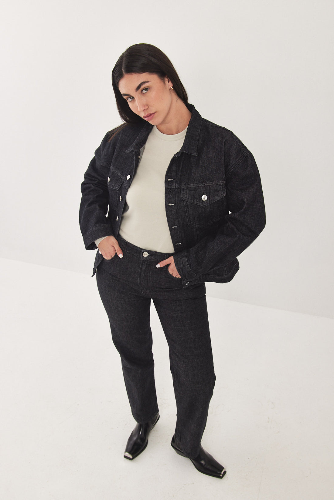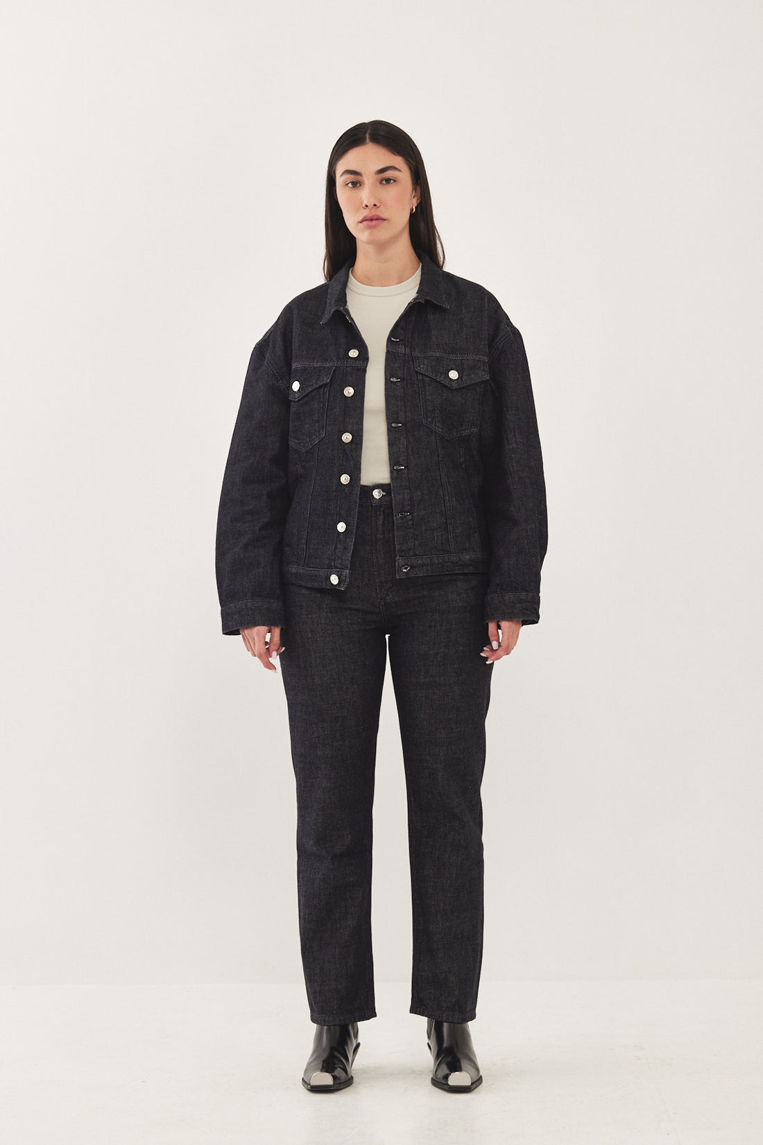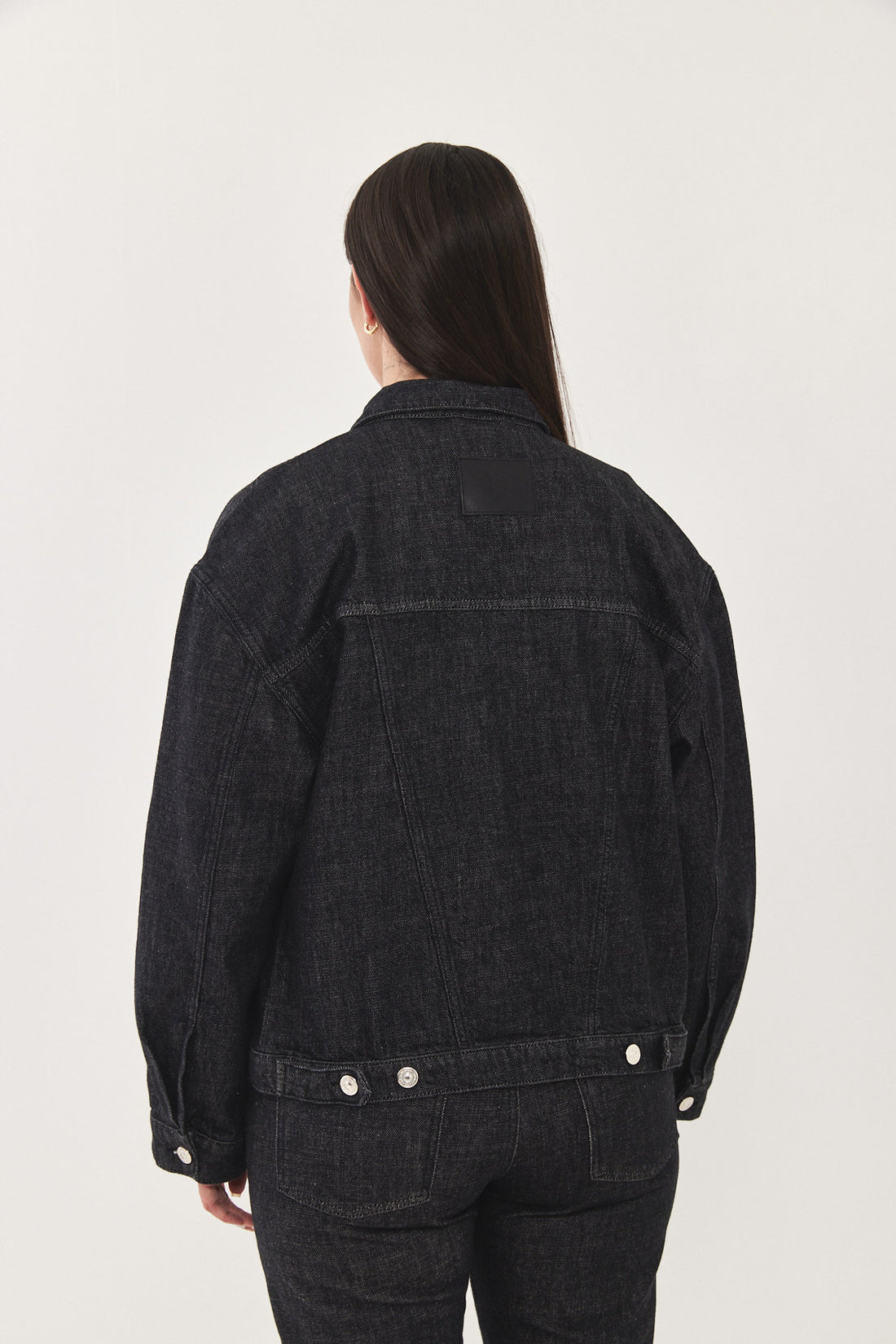 Boxy denim jacket with a puffy cropped fit. Features a classic point collar, two flap chest pockets and two side pockets. Has broad shoulders and a signature buttoned closure. Signature leather patch at the back. Style it with the matching pair of jeans, our No.10 for a classic low rise fit or our No.9 for a high waisted cropped look.