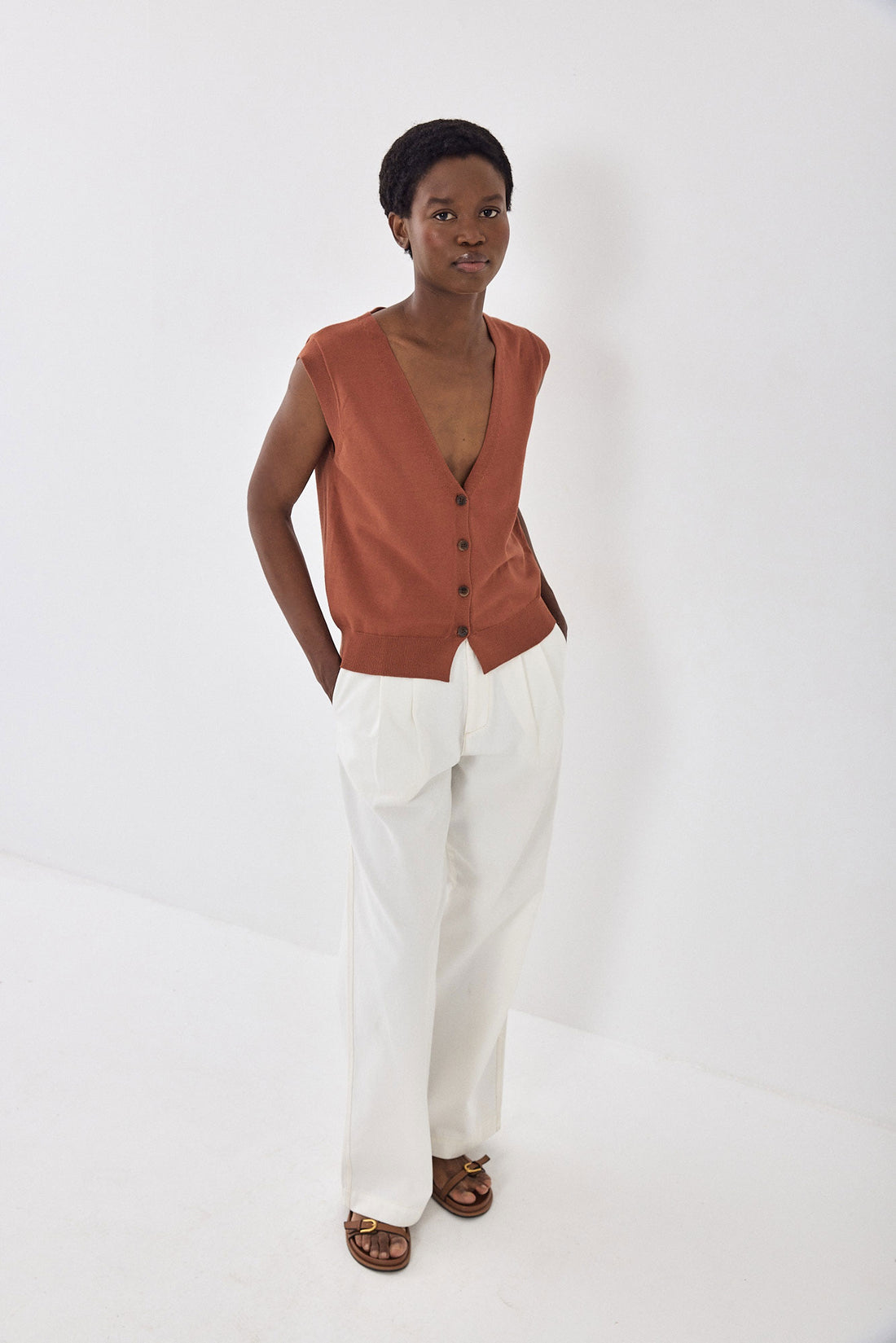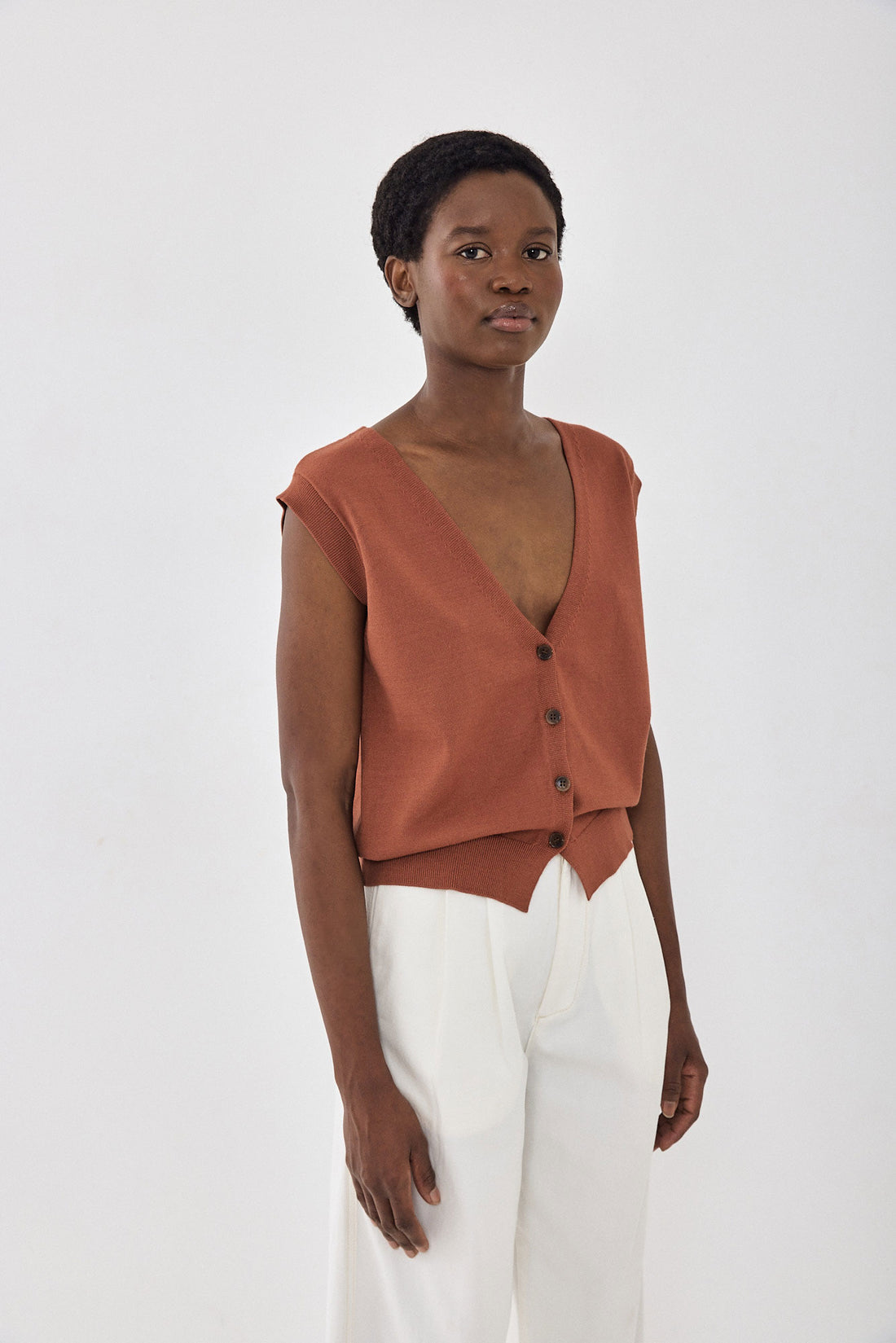 The perfect knit vest for spring. V neck silhouette. Ribbed finish with a slight cuff at the end. Embroidery logo detailing. Featuring a button closure. Delicate logo engraving on the buttons. Style it with your favorite matching bottom, delicate gold accessories and our Golden Aviator sunnies for a breezy and feminine spring look.