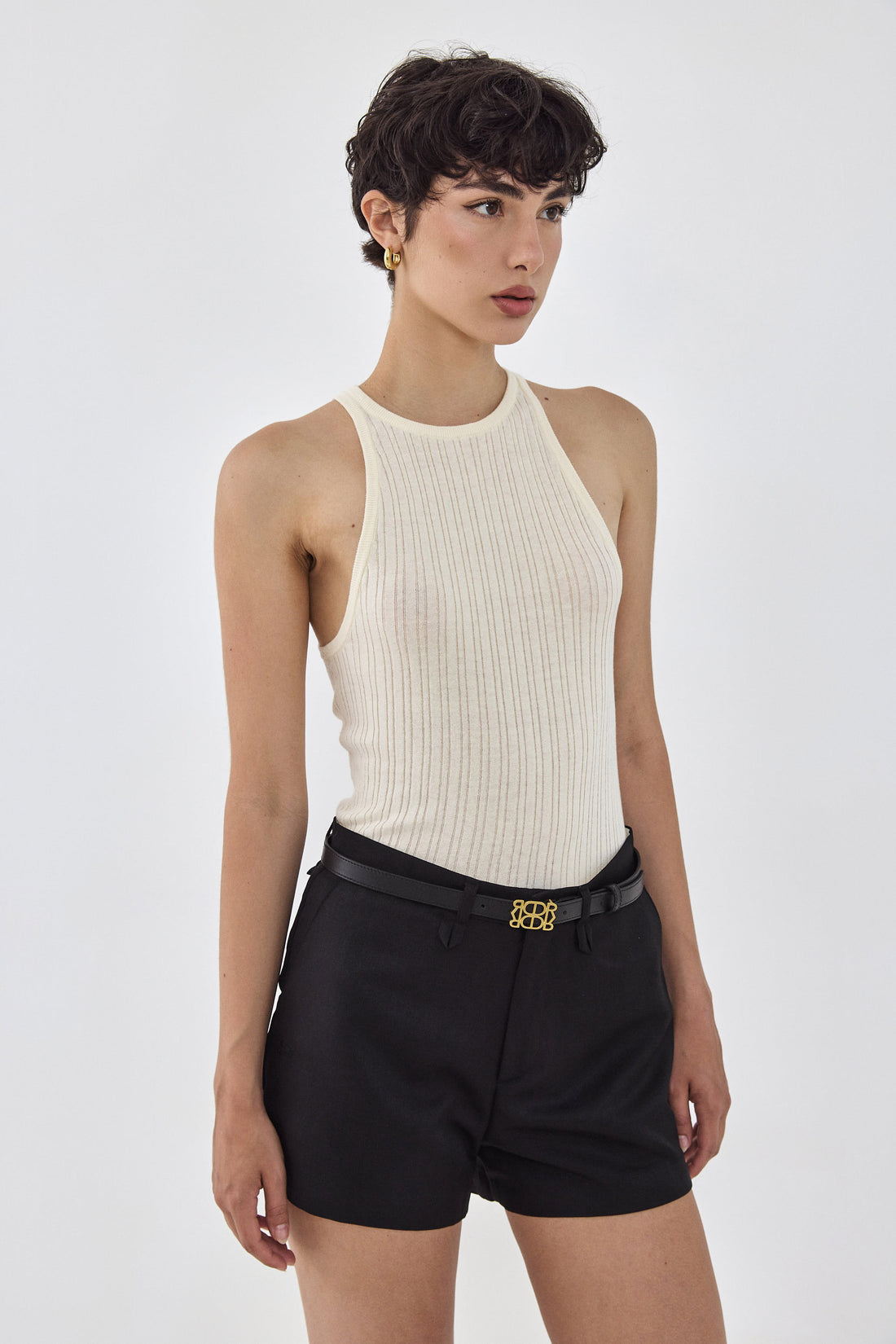 The classic summer tank top. Ribbed racer. Ribbed finish. Delicate sheer. Tonal silicone logo detailing at the back. Your ultimate go to tank, perfect for all of your daily needs. Trust us, you'll want a dozen of these in your closet. Style it with your favorite denim bottom, a Croco belt and a pair of sunnies for an ultra chic and truly effortless look.