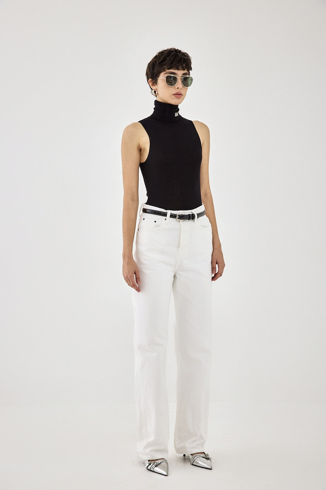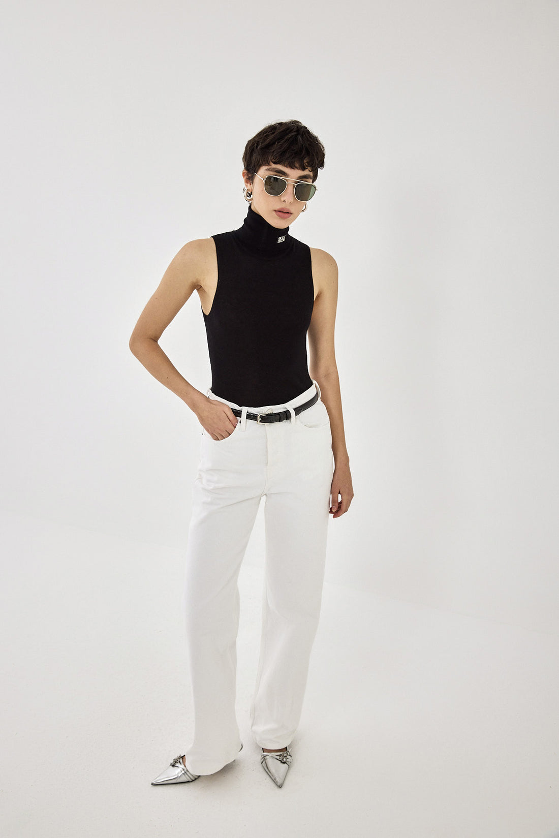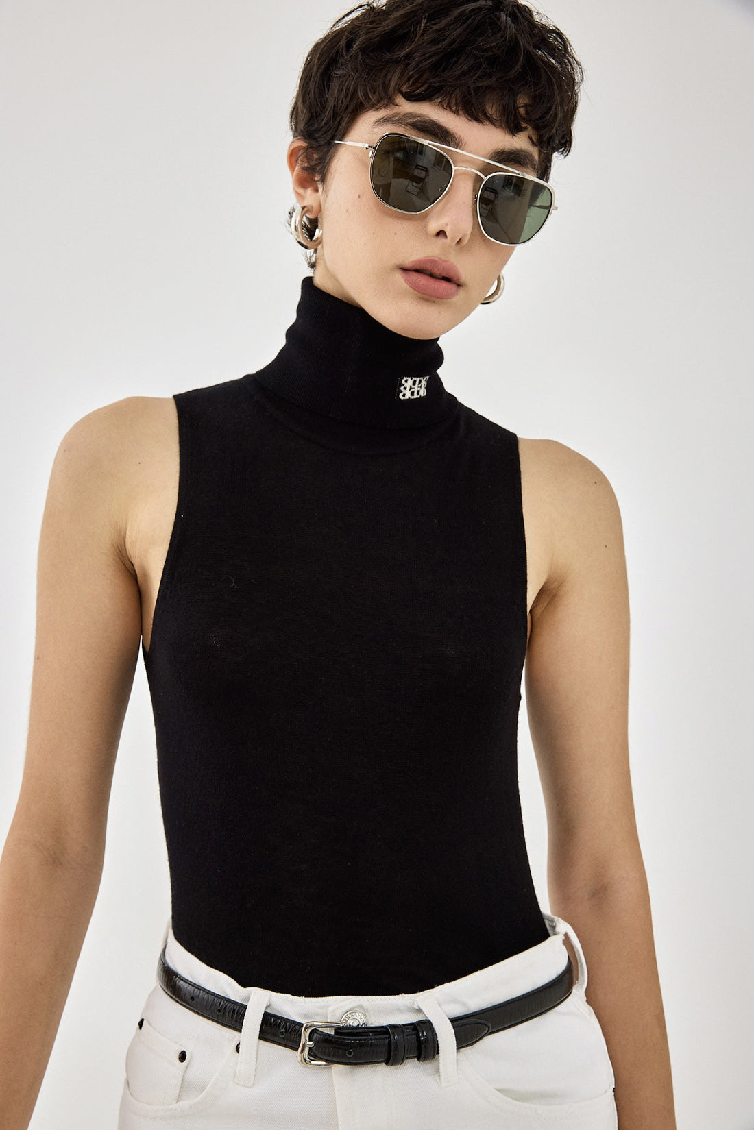 A spring wardrobe essential. Lightweight sleeveless turtleneck. Made from the softest material. Intarsia contrast logo detailing. Style it with your favorite pair of daddy trousers and Croco belt for a sophisticated everyday look.