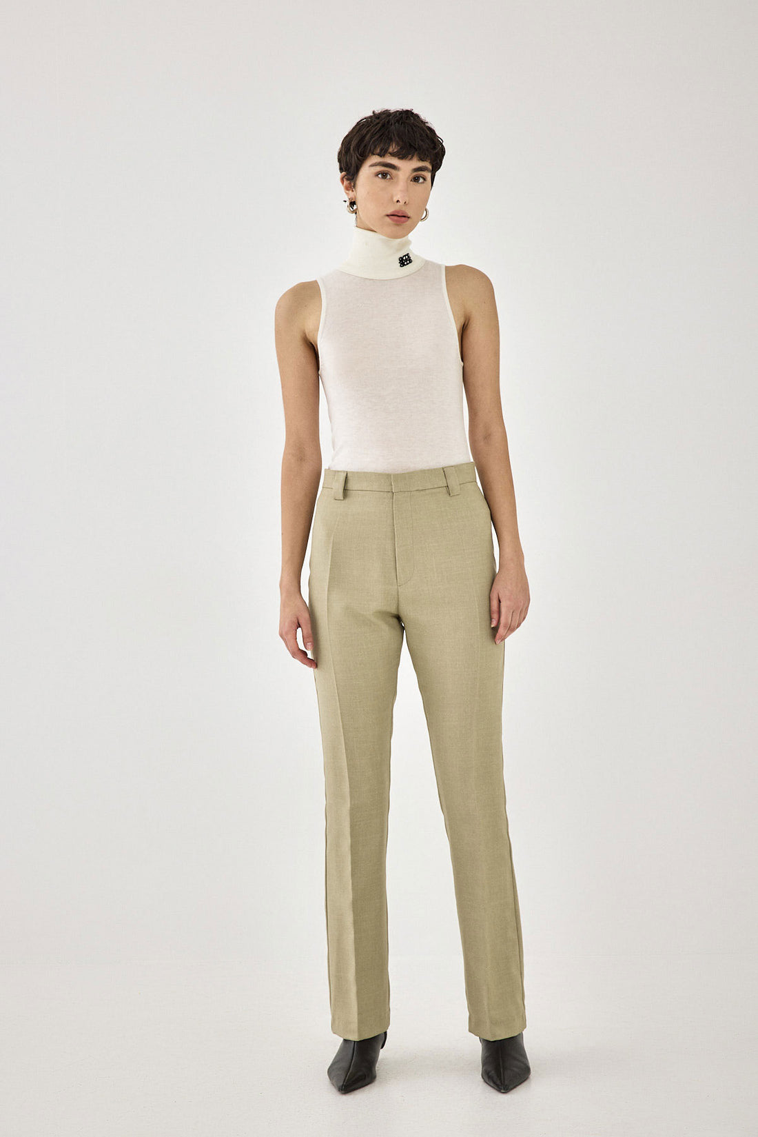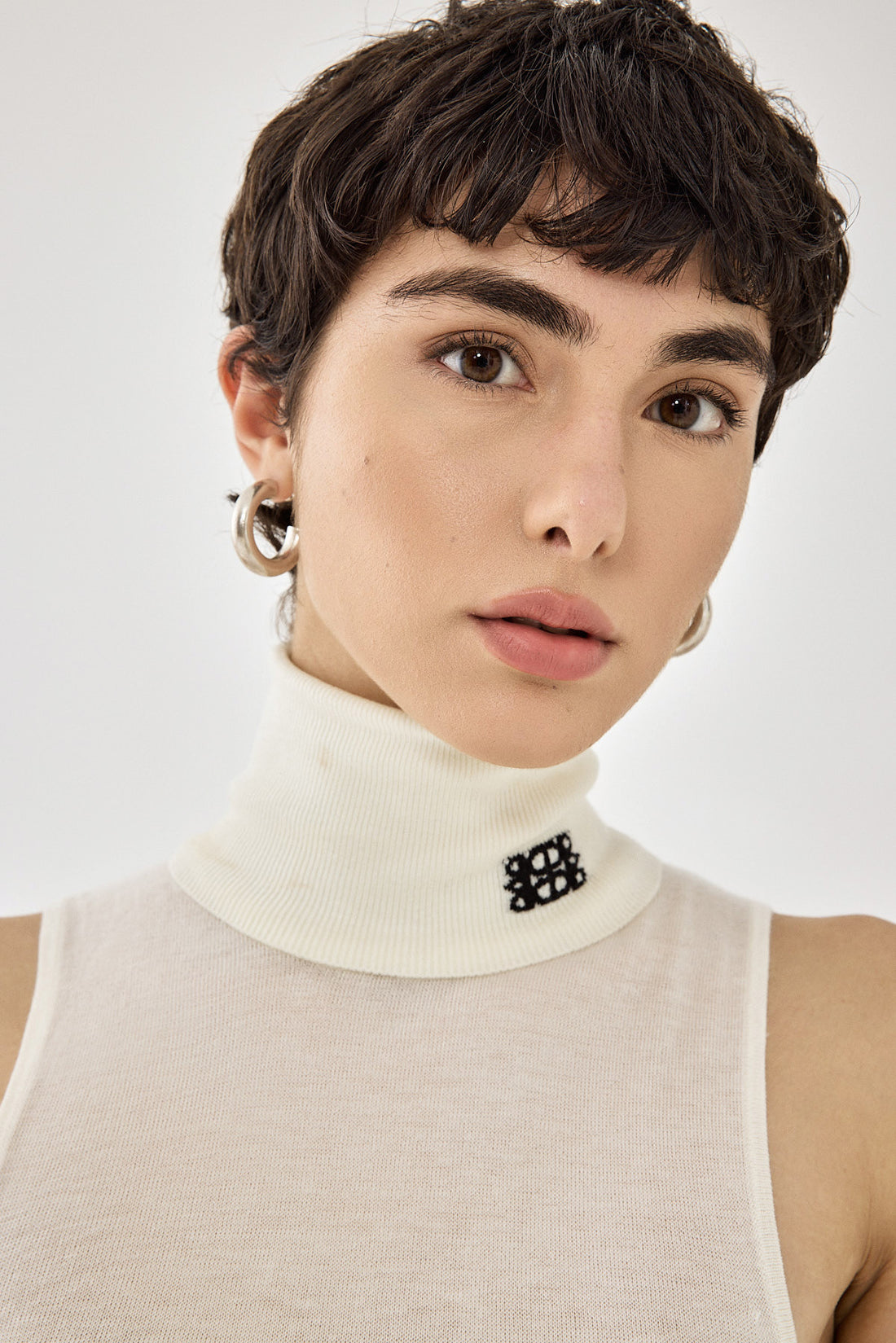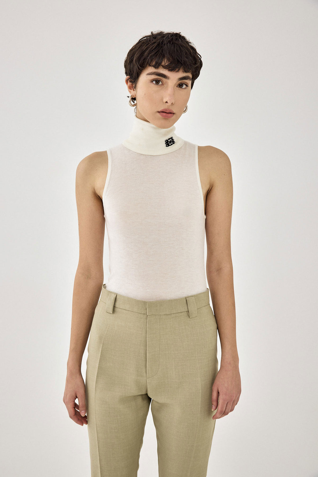 A spring wardrobe essential. Lightweight sleeveless turtleneck. Made from the softest material. Intarsia contrast logo detailing. Style it with your favorite pair of daddy trousers and Croco belt for a sophisticated everyday look.
