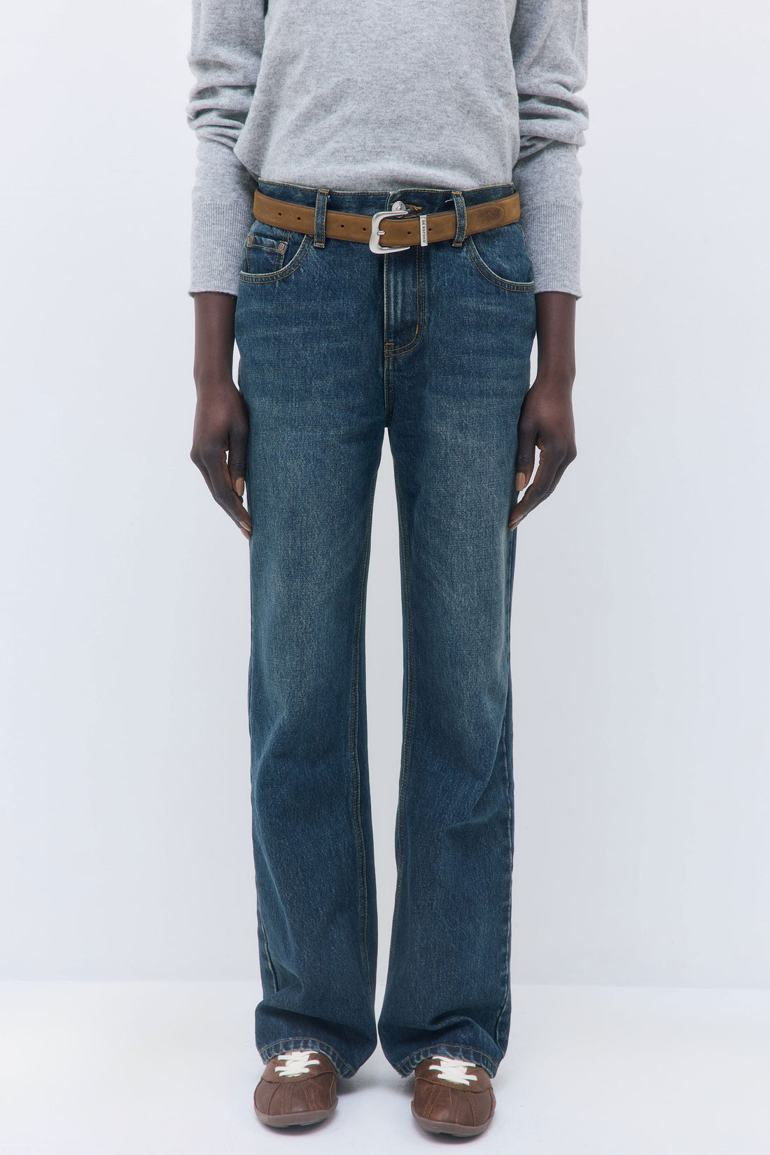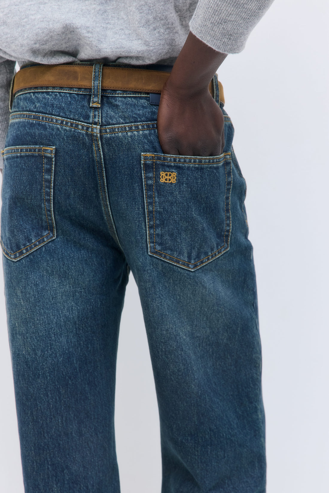 Your new go to denim. Our No.11 denim is a mid rise full length with a baggy fit. Featuring a buttoned and zipper closure as well as a navy, logo leather patch detail on the back. Finished with contrasting camel stitching along the pant. Detailed with two front pockets, two back patch pockets, a classic coin pocket, and our signature jean buttons. Style it with our iconic Turtleneck Intarsia Jumper and our timeless Oval Sunglasses for an effortless, yet chic everyday outfit.