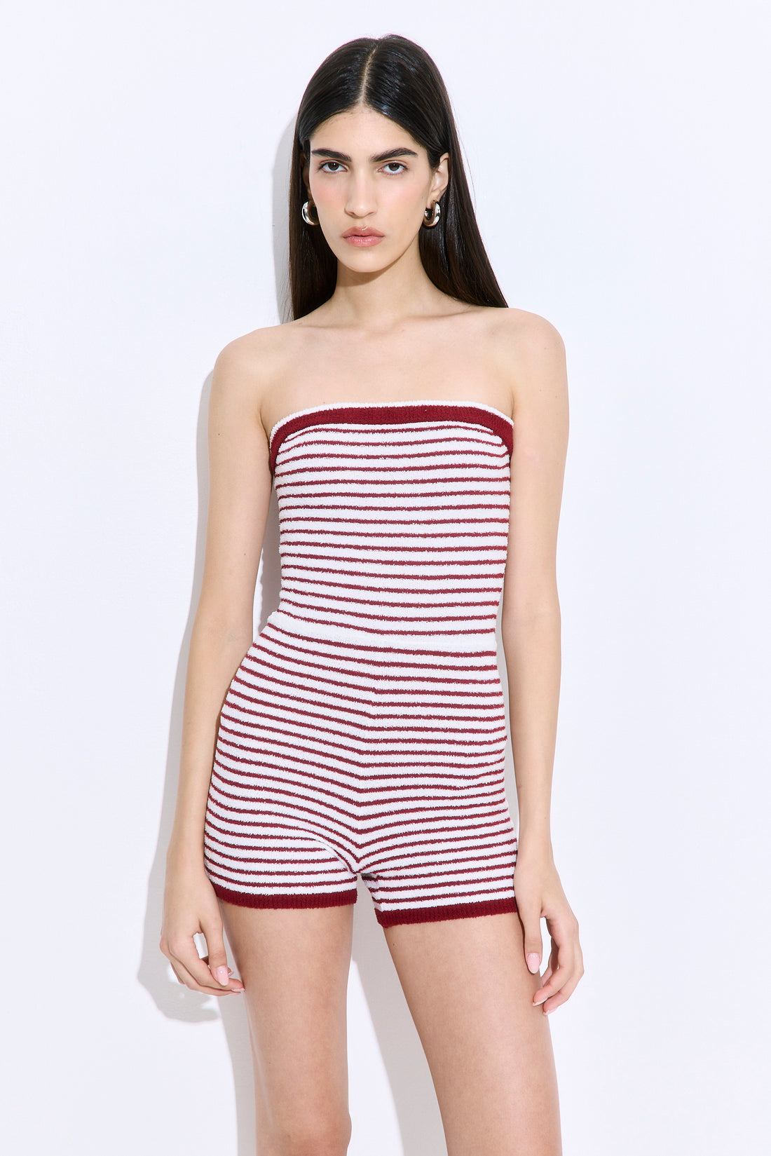Our new boucle romper is the coolest summer piece you'll own. Made from soft, textured boucle that’s breathable yet structured — offering lightweight warmth, subtle stretch, and all-day comfort with a refined edge. Strapless. Fitted silhouette. Mini length. Elastic chestband for extra grip and support. Striped pattern. Tonal silicone logo embossed patch at the back. Style it with our gorgeous Rodika tote, our oval sunnies and our iconic scrunchie for the ultimate summer look.