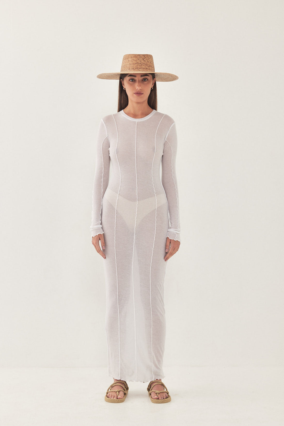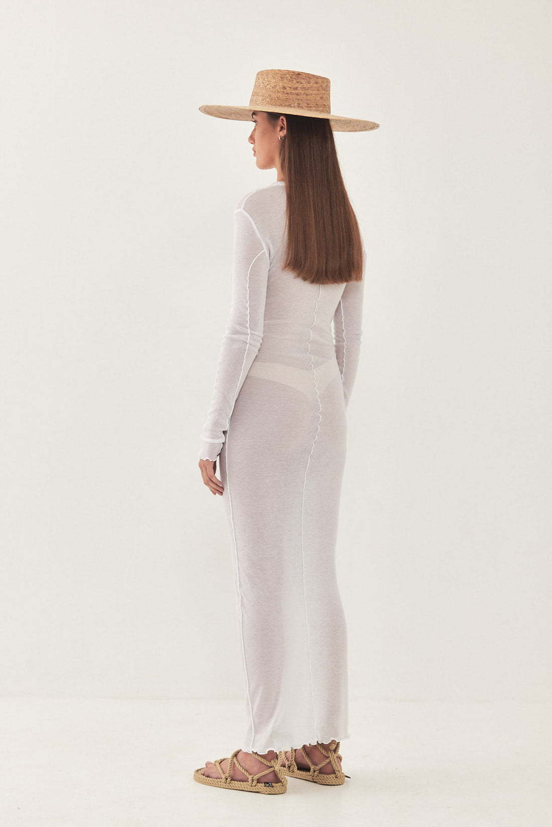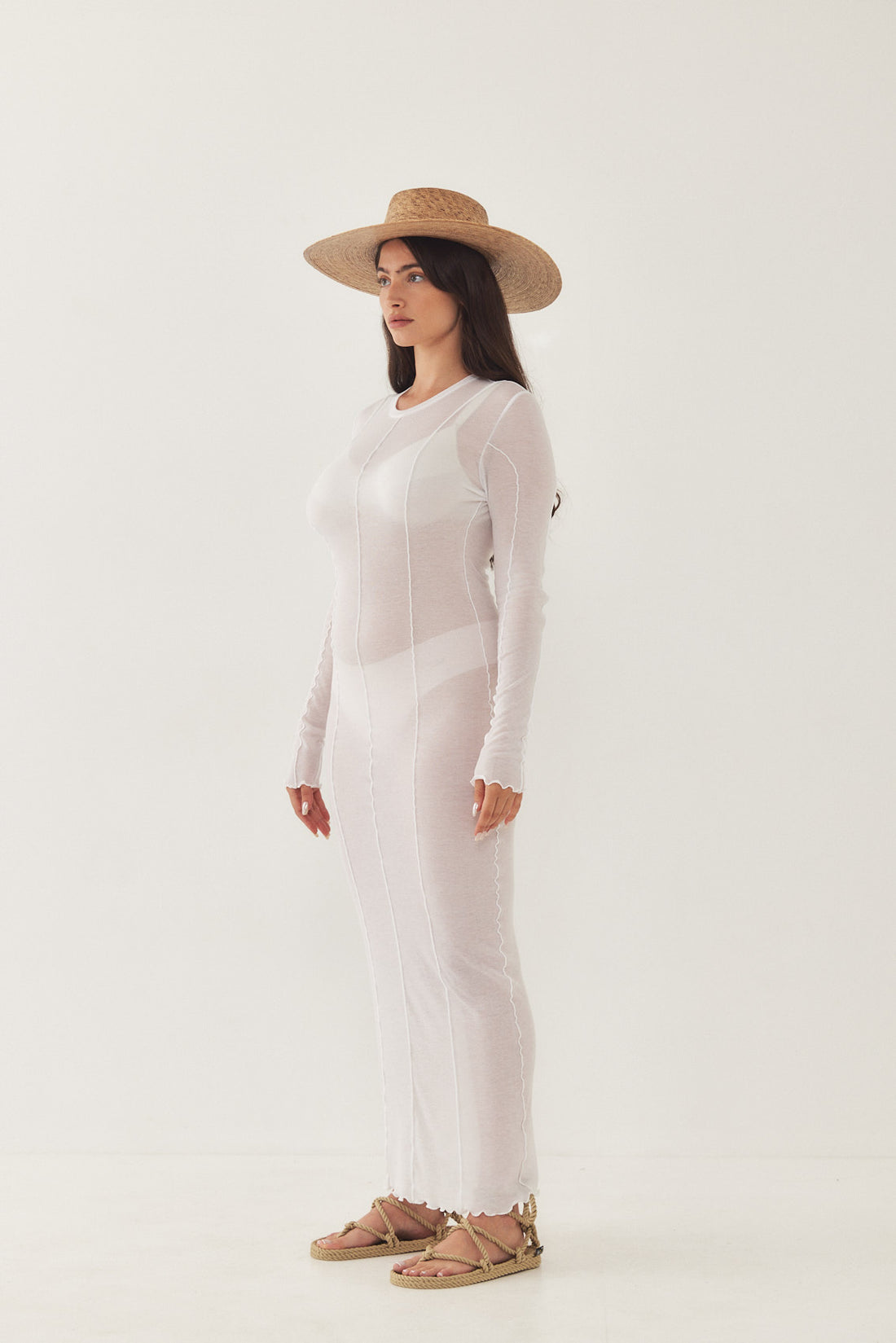 Long sleeved maxi dress made from the softest sheer ribbed material. Body hugging. Features frilled hems and delicate line detailing. Style it with a pair of sandals, our cat-eye sunglasses, some accessories for your new go to summer look.