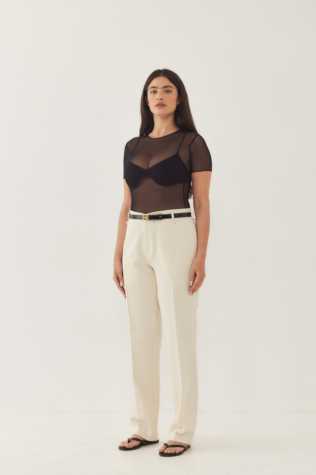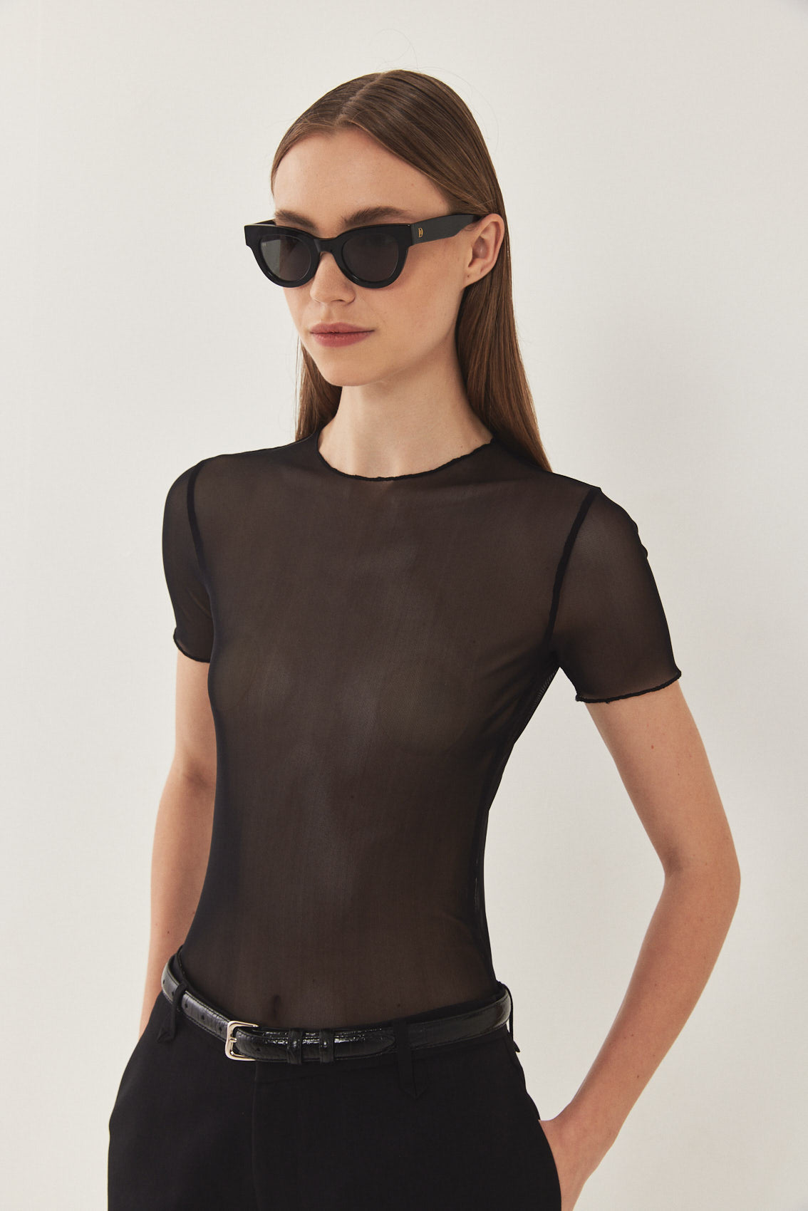 A lightweight printed mesh t shirt featuring the DR logo. Features a crew neckline and a close fit. See-through mesh fabric with a delicate baby-lock finish. Style it with a pair of daddy pants and our belt for a stylish evening look.