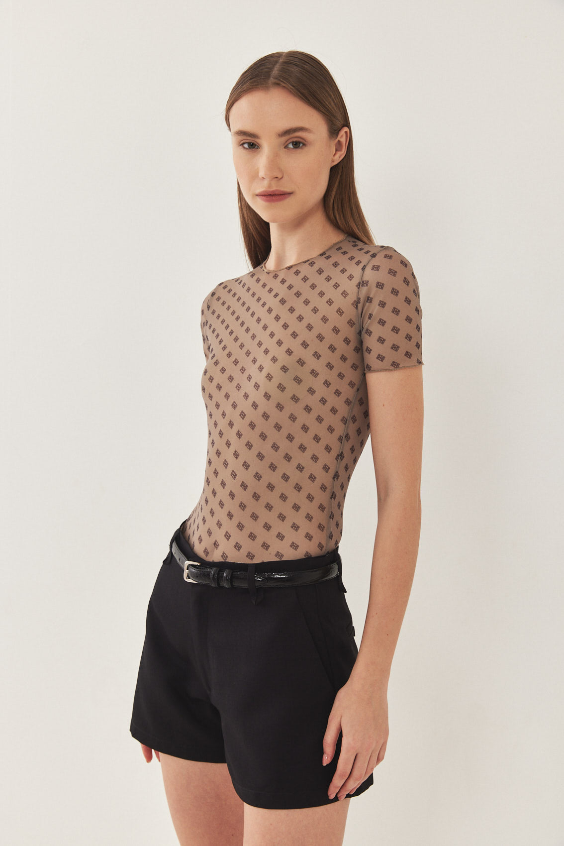 A lightweight printed mesh t shirt featuring the DR logo. Features a crew neckline and a close fit. See-through mesh fabric with a delicate baby-lock finish. Style it with a pair of daddy pants and our belt for a stylish evening look.