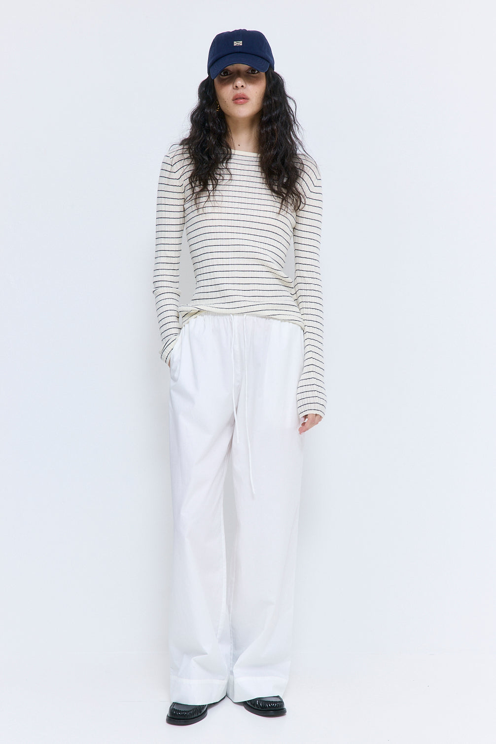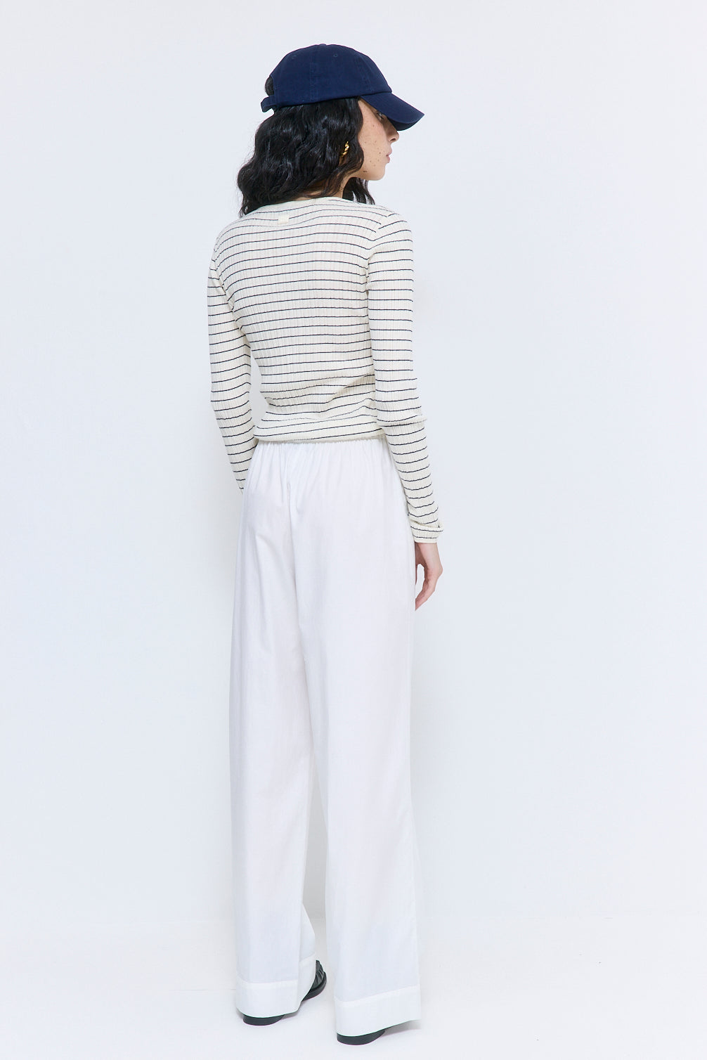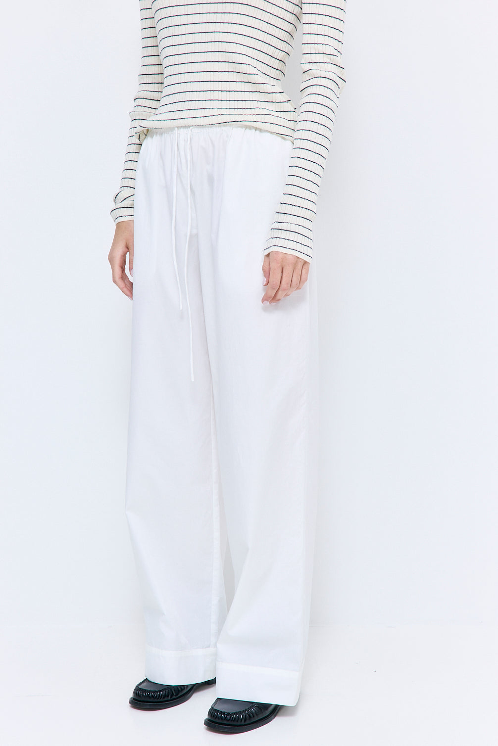 Our new mid rise poplin pants are a true summer staple. Mid rise long pants. Thin elastic waistband featuring an ultra thin drawstring closure. Two side pockets. Delicate logo embroidery detailing. Wide legged fit. Wide hem finish. Style it with our new striped cap sleeved tee, our oval sunglasses and finish this look with our gorgeous Yvon shoulder bag.